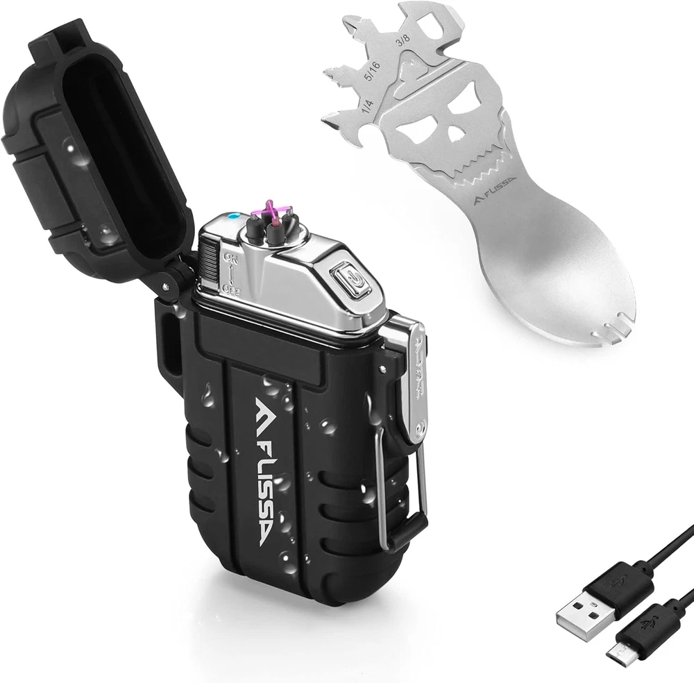 IPX8 Fully Waterproof - The cool lighter is clad in comfortable rubber, the case snaps shut and features a metal-ring safety latch for water seep inside. Even though splashes and heavy rain, this tool will continue to work. Powerful & Reliable Arc lighter - Having a windproof lighter you can rely on will make starting fires easy and will save you a lot of time. The plasma electrodes of the lighter create a high-temperature dual arc, that ignites a fire in an instant, and ensures still be used in strong wind or other bad weather conditions. Economical & Eco-friendly - USB Rechargeable lighter with built-in 220mah lithium battery, which can plug into PC, car charger, or power bank, etc. (USB cable included) Flame-less lighter is very eco-friendly and easy to use. Security Upgrade - The side power button can prevent accidental triggering of the ignition button, and the metal locking clasp secures the lid to prevent it from falling open in your bag. This waterproof lighter can maintain a safe state for children and adults. 11 in 1 Multi-Function Spoon - This punk-style skull spoon is made of high-quality stainless steel, it is small, lightweight, exquisite, easy to carry around, and ideal for outdoor projects. Flissa rechargeable lighter & Multifunctional Spoon Combo is the best choice for emergency equipment, adventure, camping, hiking, hunting, survival tactical, traveling, etc. Product Description FLISSA WATERPROOF LIGHTER OUTDOOR WINDPROOF LIGHTER ELECTRIC LIGHTERS Ideal for Camping, Hiking, Hunter and more FLISSA USB Rechargeable Electric Lighters Perfect for outdoor lighter, camping fire starter tool, emergency equipment, camping survival gear, gadgets for men and more. The video showcases the product in use. The video guides you through product setup. The video compares multiple products. The video shows the product being unpacked. IPX8 WATERPROOF Fully submersible in water and perfect for the outdoor environment Clad in comfortable rubber, the case snaps shut and features a metal-ring safety latch for water seep inside. WIND RESISTANT Can start a fire in almost any weather conditions Having a windproof lighter you can rely on will make starting fires easy and will save you a lot of time. SECURITY UPGRADE A safe fire starter tool for outdoor acivities USB Rechargeable lighter with built-in 220mah lithium battery, which can plug into PC, car charger, or power bank, etc. SIMPLE STEPS TO USE FLISSA TRACTICAL SURVIVAL LIGHTER FEATURES Waterproof, Dustproof & Wind Resistant fully submersible in water and perfect for the outdoor environment. Completely dust proof and windproof. This punk style skull spoon is made of high quality stainless steel, it is small, lightweight, and exquisite, ideal for outdoor projects. The metal locking clasp secures the lid to prevent it from falling open in your bag. This lighter can maintain a safe state for children and adults. Compact Size. The Waterproof lighter is about 2” tall and 1.44” wide. Weight is 1.73oz. Easy to pack and carry anywhere. WIDE APPLICATION
