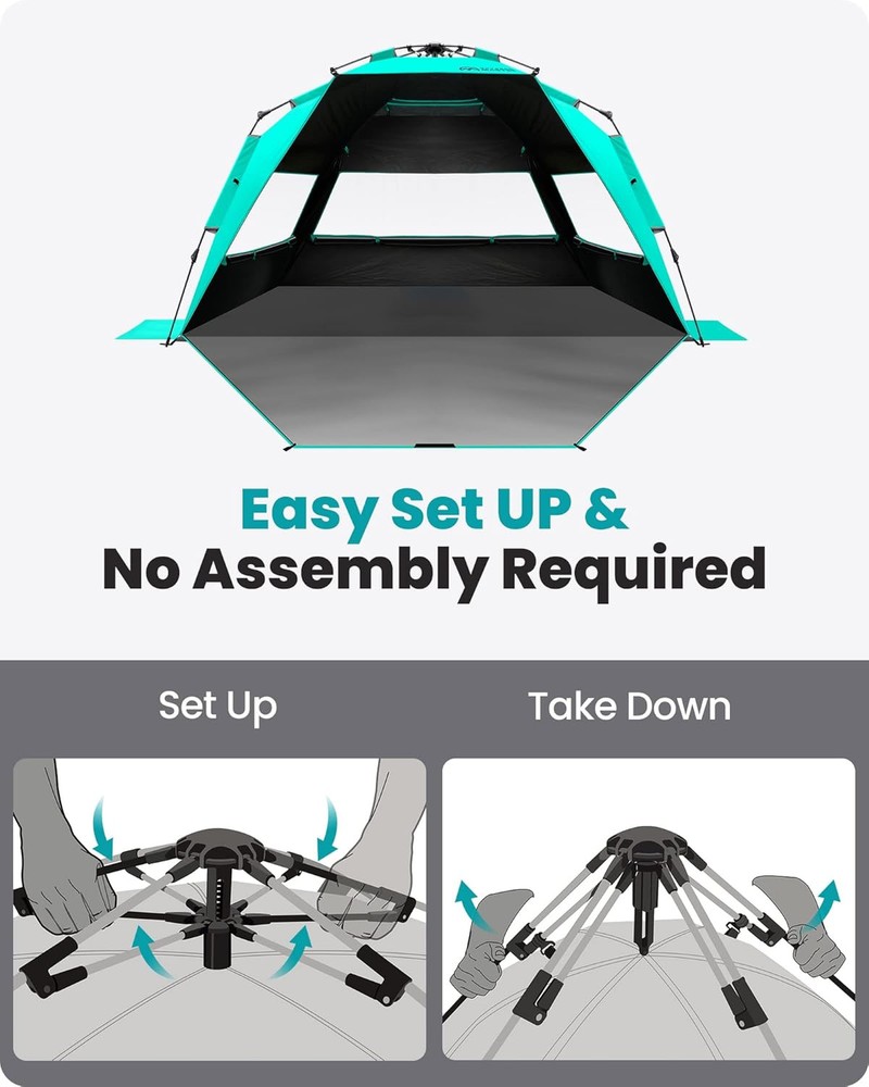OutdoorMaster Beach Tent with Blackout Shelter Technology, Portable Green Product Details Brand: OutdoorMaster Material: 190T Spring Asia Textile Color: Green Item Weight: 8.5 Pounds Recommended Uses For Product: Beach, Camping & Other Outdoor Activities Product Dimensions: 94.4"L x 55.1"W x 53.1"H Ultraviolet Light Protection: BLOCKING 99.95% OF UVA and UVB RAYS (UPF 50+), ELIMINATES 95% SUNLIGHT Frame Material: Alloy Steel Closure Type: Zipper Water Resistance Level: Waterproof Pole Material Type: Metal Coverage: Waterproof 190T Spring Asia Textile with Blackout Shelter Technology and UV Protection Number of Guylines: 4 Assembly Required: No Item Package Dimensions L x W x H: 39.1 x 9.5 x 8.3 inches Package Weight: 4.45 Kilograms Item Dimensions LxWxH: 94.4 x 55 x 53 inches Brand Name: OutdoorMaster Model Name: beach tent Manufacturer: OutdoorMaster Part Number: 803838 Style: Portable Brand: OutdoorMaster Material: 190T Spring Asia Textile Color: Green Item Weight: 8.5 Pounds Recommended Uses For Product: Beach, Camping & Other Outdoor Activities Blackout Shelter Technology: Our Instant Shade Blackout Shelter is different from others on the market as it not only blocking 99.95% of UVA and UVB rays (UPF 50+), also eliminates 95% sunlight to protect your skin and objects for a more comfortable rest anytime of day 9.5MM Thickened Rods & 190T Material: We increased the thickness of the rods from 8.0mm (market standard) to 9.5MM and made with 190T Spring Asia Textile, this beach tent sun shelter is more rugged than other lower ones thus handle the wind firmly and stable without breaking or tearing Spacious Interior For 4 Person Tent: With the dimension of 94.4 x 55.1 x 53.1 inch, OutdoorMaster beach tent pop up shade enough room in the XL beach tent for 2 adults and 2 kids to sit in the inside. Ideal for family car camping or camping site Versatile Design: Our tent for beach built-in zippered door offers privacy to change into dry clothes. The extended front floor provides extra room for more activities. overhead Mesh pockets make it possible to store valuables Ventilation & Visibility: The pop up sun shade with ample mesh panels allow views and enhances cross-ventilation to help manage condensation. The beach tents sun shelter 4-5 person has 1 large mesh door, 3 large screen panels, which boost the airflow and keep the bugs out Portable & Easy To Carry: This sun beach tent attached 4 sand pockets, comes with 4 Iron stakes, 8 plastic stakes & 4 guy lines strings to support extra stability, completely portable once set up with the carry bag