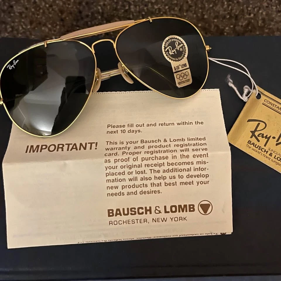 Listing is for a new, never used pair of RayBan Outdoorsmen Aviator sunglasses by Bausch & Lomb. Sunglass model #RB-3029-L2112-62/14. The authentic 'RB' etching is present. Filter category: 3. Comes with its Ray-Ban leather carrying case, a RayBan Registration card, and a cleaning cloth. Great addition to any one's collection.