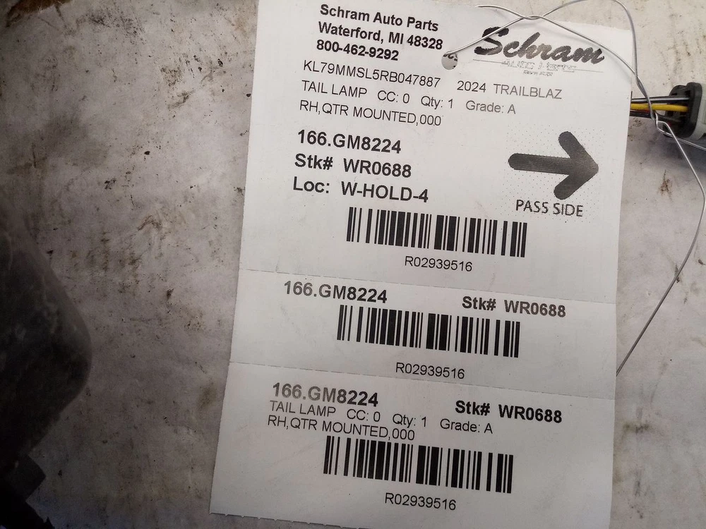 Store Home About Us Customer Resources Feedback Contact Us Outer Passenger Right Chevrolet Trailblazer 2024 Tail Light 2939516 Free Shipping - 90 Day Warranty - Est. 1923 Description Enhance Your Vehicle's Rear Visibility with a Quality Taillight Schram Auto and Truck Parts - Taillight Illuminate the road behind you and enhance your vehicle's rear visibility with a reliable Taillight from Schram Auto and Truck Parts, Inc. Our selection of taillights ensures that you can drive with confidence, knowing that your vehicle is visible to other drivers. Every taillight may have light scratching from normal use, but we're here to provide detailed part information in our conditions and options section, helping you make an informed decision before purchasing. Clarity Matters Driving with a functional taillight is crucial for your safety and the safety of others on the road. Ensure you're getting the right fit by checking the 'interchange' portion of this listing, and feel free to contact us with any questions you may have. Your Questions Are Valued Our commitment to your satisfaction means that Chad, our knowledgeable specialist, is ready to address any inquiries you might have. Don't hesitate to reach out for the information you need to make a confident choice. Upgrade your vehicle's safety and ensure you're visible to others on the road with a quality Taillight from Schram Auto and Truck Parts, Inc. Drive with peace of mind knowing that your rear lights are in optimal condition. Drive with Confidence Driving with a well-functioning taillight isn't just a matter of compliance – it's about ensuring your safety and the safety of those around you. Let us help you find the right taillight for your vehicle. Vehicle 2024 TRAILBLAZ Mileage 7000 Part Grade A What's this? Conditions RH,QTR MOUNTED,000 Fitment Guide This item will fit the following vehicles / applications: R# 2939516 Stk# WR0688 Holl# 166.GM8224 More Parts for 2024 TRAILBLAZ » More Parts from this exact vehicle. » Accessories Brakes and suspension Cooling Systems Electrical and Lighting Engine and Drivetrain Exterior Parts & Sheet Metal Interior Parts Wheels and Tires Customer Service Payments Shipping International Returns FAQs Contact Us Quick Links Store Home About Us Feedback