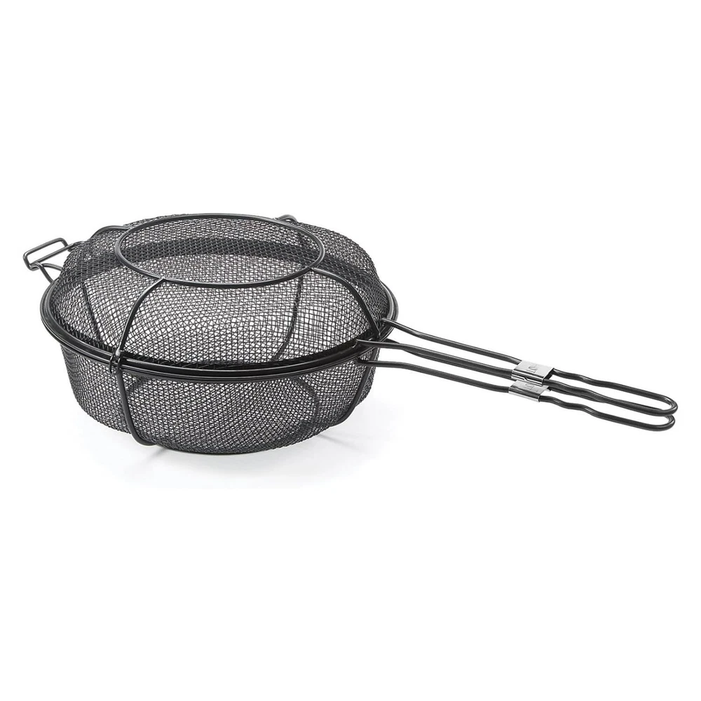 Versatile Grilling with 3 Ways to Use Shake things up with this 3-in-1 grill basket and skillet. For use as a skillet, deep basket or a grill basket with lid, its unique design creates a smoky flavor infusion into your foods. The sturdy, mesh design allows you to sear meats and vegetables without them slipping beneath the cooking grate. 3 Ways to Use: 1. Skillet (grill veggies, seafoods and meats); 2. Deep Basket (perfect for grilling family-sized meals); and 3. Grill Basket with Lid (interlock helper handles to use skillet as a lid to shake it up). Helper handles make transportation to and from the grill easy. The basket's nonstick coating makes for quick clean up and safe cooking. Collapsible design with removable handles for convenient storage. Compatible with gas stovetops Visit Our Store Contact Us Chef's Outdoor Grill Basket and Skillet Versatile Grilling with 3 Ways to Use Shake things up with this 3-in-1 grill basket and skillet. For use as a skillet, deep basket or a grill basket with lid, its unique design creates a smoky flavor infusion into your foods. The sturdy, mesh design allows you to sear meats and vegetables without them slipping beneath the cooking grate. 3 Ways to Use: 1. Skillet (grill veggies, seafoods and meats); 2. Deep Basket (perfect for grilling family-sized meals); and 3. Grill Basket with Lid (interlock helper handles to use skillet as a lid to shake it up) Helper handles make transportation to and from the grill easy The basket's nonstick coating makes for quick clean up and safe cooking Collapsible design with removable handles for convenient storage Compatible with gas stovetops Hand wash only Color: Black Material: Iron Dimensions: 23" x 11" x 6.5" Weight: 2.6 lb Origin: China