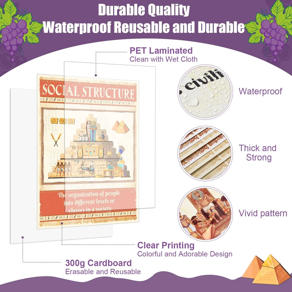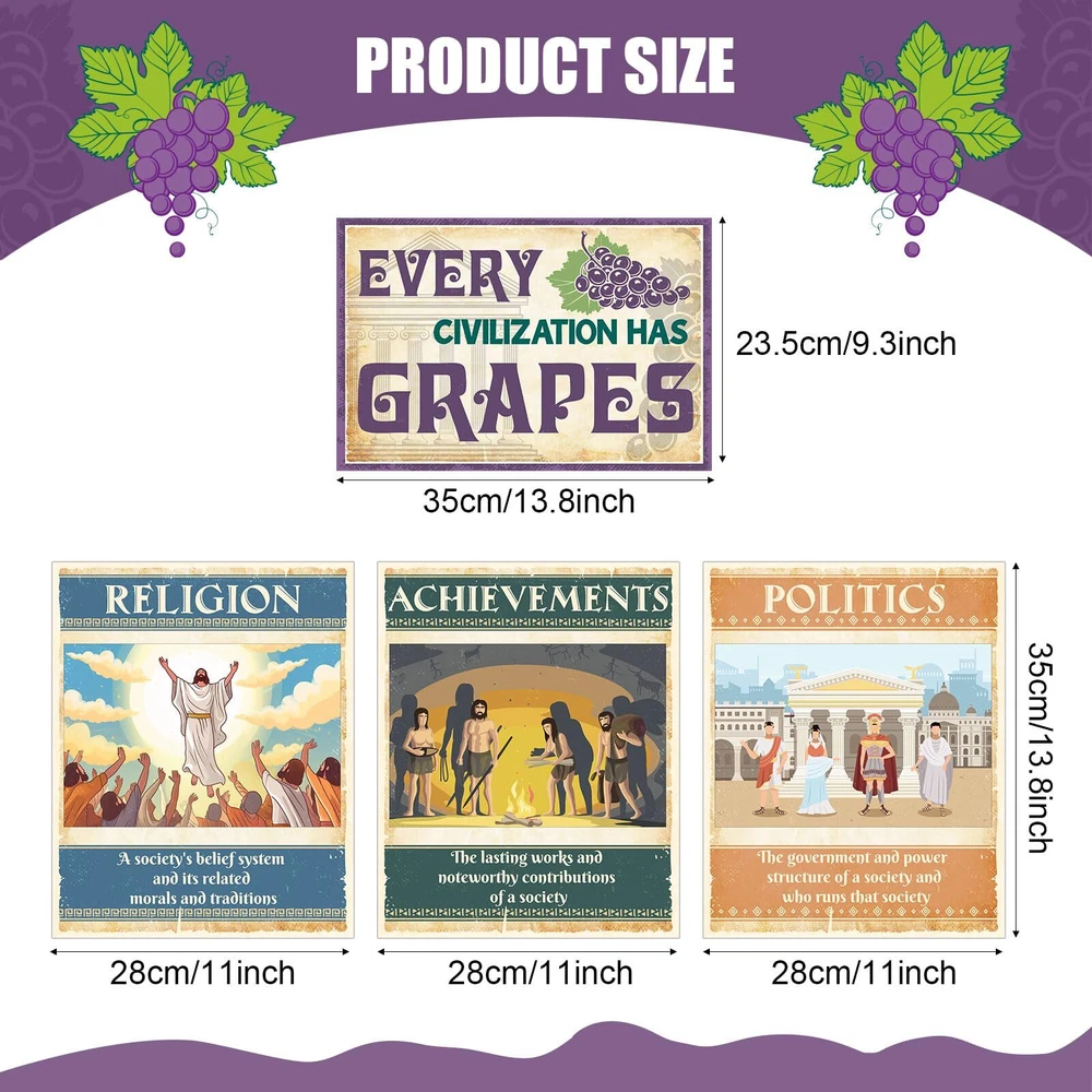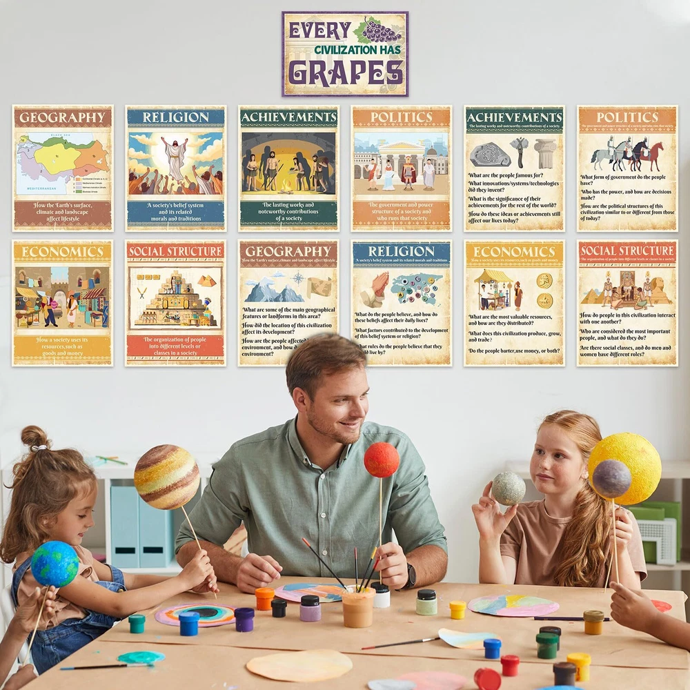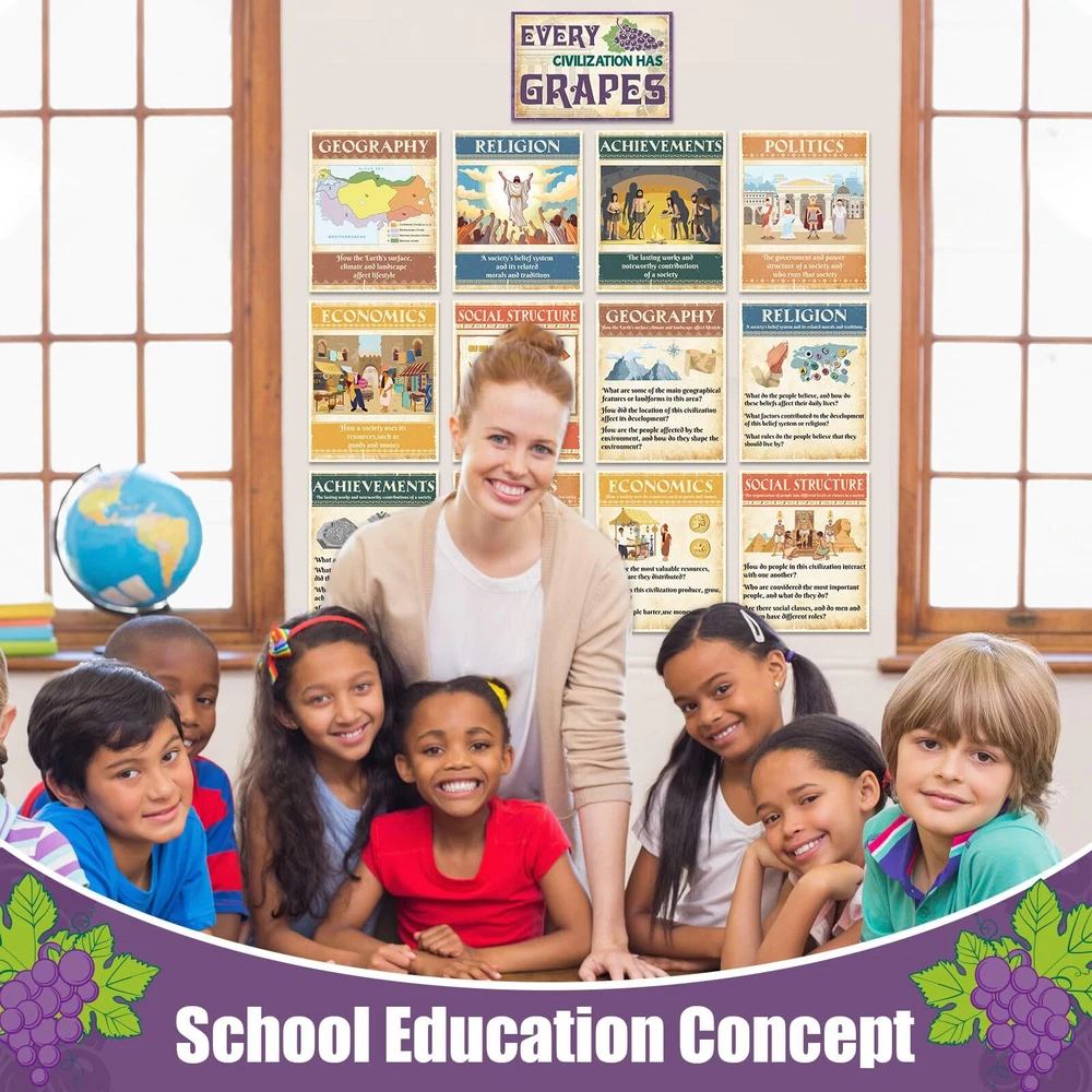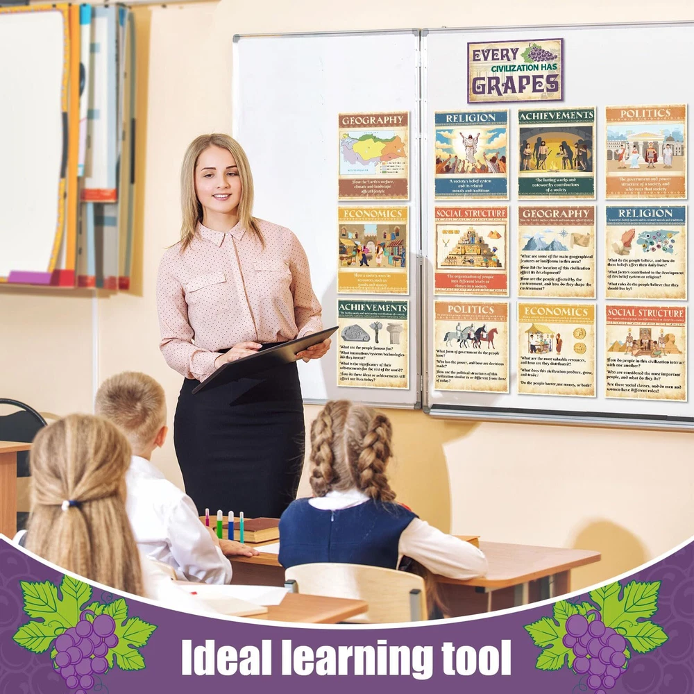 Features: Thoughtful Details: These social education posters comes with glue points, so you can easily put them on the wall to decorate classroom, saving your time and energy. Suitable for social studies teachers who want to reinforce certain fundamental geography themes in their classrooms. Outstanding Design: Our social studies posters are not just nice as bulletin board decorations, they are also a good gift to support students, families, and teachers on their learning journeys, giving students the tools they need for increased performance. Specifications: Material: card stock Color: as pictures shown Size: approx. 14 x 11 inches/ 35 x 28 cm Package includes: 13 x Social research posters Notes: Manual measurement, please allow slight errors on size. The color may exist a slight difference due to different screen displays. The words printed on the product are not as trademark or brands, just for decoration, our brand is Outus. Civilizations Poster Package Includes: the ancient civilizations classroom decorations include 13 pieces: geography, politics, economy and so on, they are all ideal for school social educational needs, social room decorations, or homeschooling needs, good for use in classroom or homeschool learning environments Meaningful Design: Our social studies posters introduce the factors that affect the development of social civilization from the perspectives of economy, politics, geography, etc., social studies wall print can popularize students' knowledge of social development Quality Materials: our ancient civilizations wall art are made of quality card stock and coated with laminated film layer, they are waterproof, tear resistant, reusable and marks on them written by water based dry erase markers could be erased Moderate Size: economic ideologies bulletin board decoration measures approx. 14 x 11 inches/ 35 x 28 cm, large enough to make sure you can see it from a distance, which can get the attention of your students, help them learn and understand ancient civilization Wide Applications: these social education classroom posters can be applied as learning tools guide, you can use classroom wall decoration to stick to the wall, bulletin board or other places where students can easily recognized, help them learn and understand ancient civilization.
