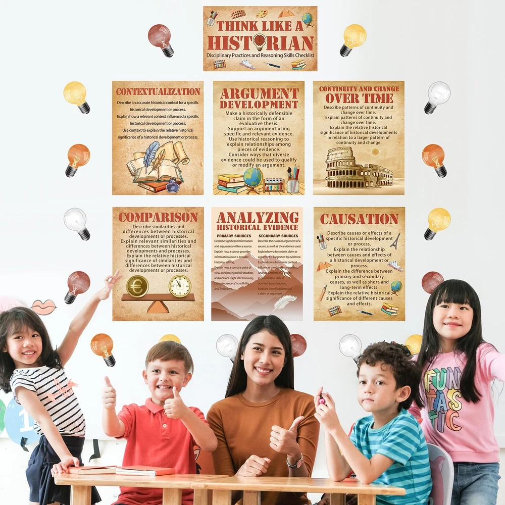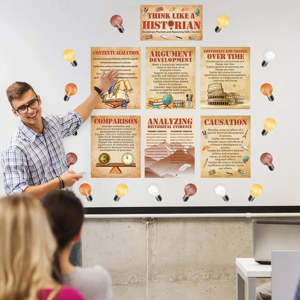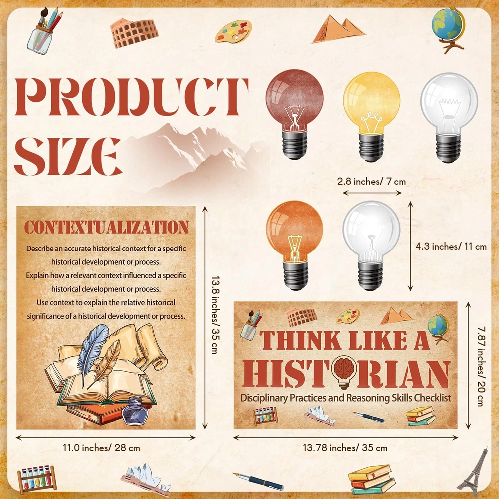 Features: History reasoning skills: How do you know what you know? Do you think like a historian? Use this checklist to help students decode the past and ask the right questions when examining historical evidence. Surprising gift: The social studies classroom supplies are suitable as a gift for lovers, classmates and friends, etc., suitable for scenes at home, bar, hallway, office, children's bedroom, home and office decoration, also suitable for Thanksgiving, birthday, Christmas, Children's Day, party favors. Specifications: Material: cardboard Color: as shown in the picture Size: as shown in the picture Package includes: 1 x Title poster 6 x Thinking posters 40 x Light bulb cutouts in 3 colors Notes: Manual measurement, please allow slight errors on size. The color may exist a slight difference due to different screen displays. The words printed on the product are not as trademark or brands, just for decoration, our brand is Outus. What Can You Get: you will get 47 pieces classroom bulletin board decoration including 1 title poster, 6 thinking poster and 40 light bulb cutouts, these cards are bright and colorful, which will be a big hit for your classroom; There are glue points provided for you to stick science cutouts and posters Nice Decorations: the thinking bulletin board posters are a nice solution for increasing students' curiosity about the world and stimulating a positive attitude and creative imagination; The thinking wall decorations are easy to show the thinking to solve the problem, providing a delightful visual reference for learners Reliable Material: our historical thinking bulletin board set is made of cardboard, which is sturdy and durable, clear printing, not easy to fade, colors bright, easy to catch the eyes, thinking poster for classroom also can be applied to explore thinking knowledge Novelty Design: the think like a historian posters are designed with steps in thinking about a problem, 6 parts such as "CONTEXTUALIZATION" "ARGUMENT DEVELOPMENT" and "COMPARISON" etc.; Thinking bulletin board for classroom can make your classroom or room full of learning atmosphere Wide Application: the bulletin board decoration with light bulb cutouts is suitable for creating novelty classroom projects on bulletin boards, windows, chalkboards, and hallways; These social studies wall decorations can be applied as decorations in classroom, office, party, etc