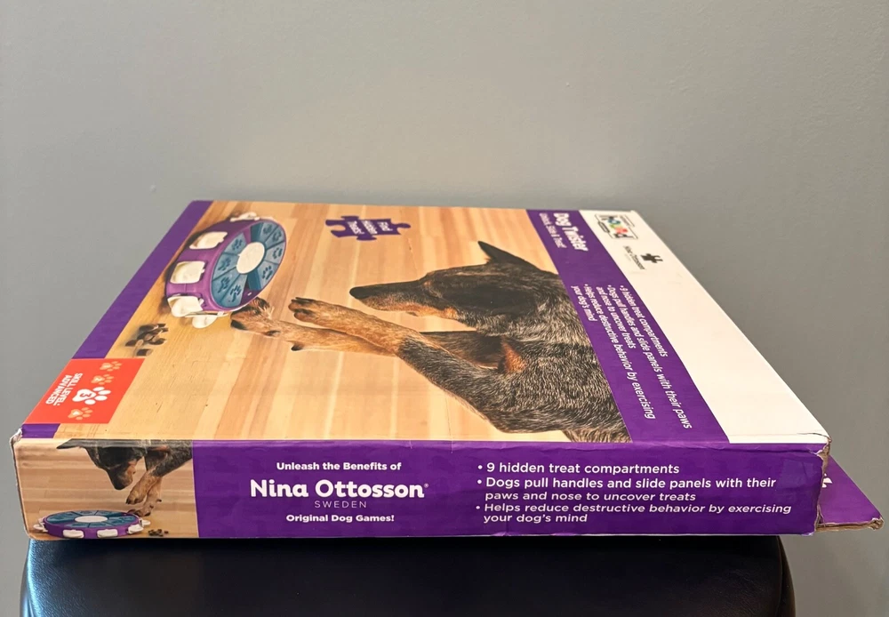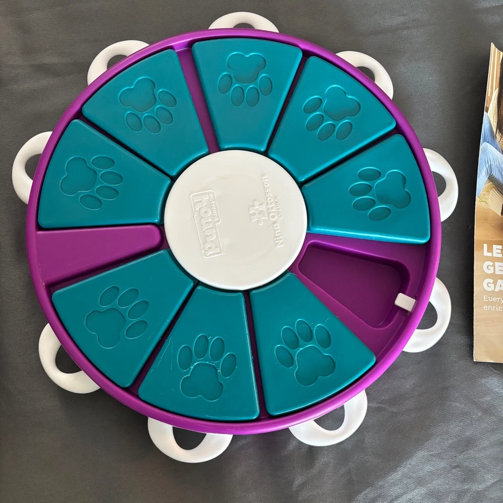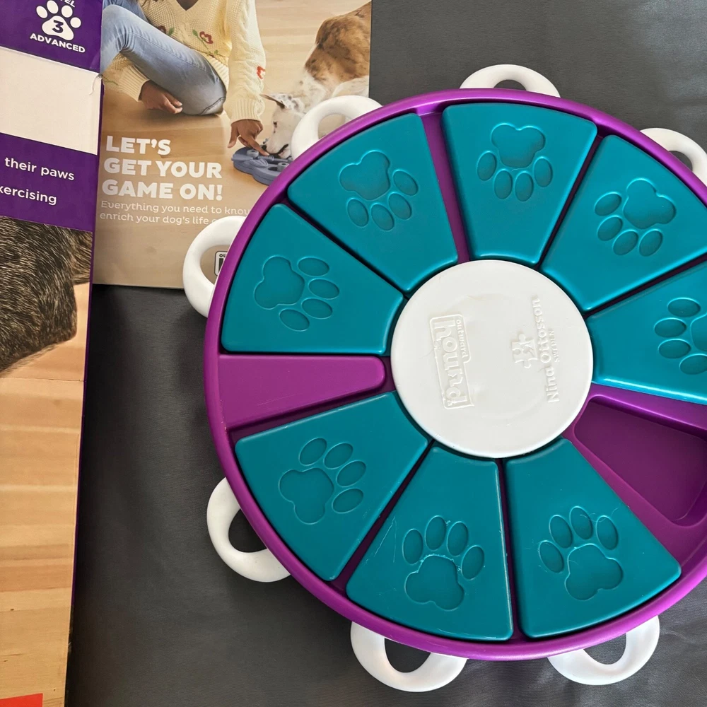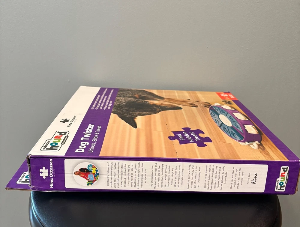 When you're looking for a toy for bored dogs who have mastered the simpler dog treat puzzles, this engaging level 3 advanced interactive treat puzzle from Nina Ottosson by Outward Hound is the perfect next step! The Dog Twister interactive dog puzzle toy features nine treat drawers for dog treats which are secured in place with nine white tabs. Just simply place the treats in the drawers, slide them in, and lock the white drawer tabs for an added sequential step challenge. Your pup will enjoy pawing, sniffing, and nudging around to reveal the hidden tasty rewards! The Dog Twister puzzle dog toy is made of durable BPA, PVC & phthalate-free material that you can feel safe using with your furry friend. Easy to clean with warm water and soap between uses. advanced level fun: The Nina Ottosson level 3 Dog Twister puzzle dog toy is designed for advanced levels of problem-solving play that challenge your dog with learning sequential steps. A fun way for your smart pups to train their brain while redirecting destructive or negative behavior in an exciting way! slide, pull, & lock to hide treats: Place the treats underneath the triangular block compartments and push in the white plastic tabs to lock the blocks in place. Your dog will have to lift the tabs sequentially to unlock the blocks and move them to reveal the treats! no removable parts & easy to clean: Built in play pieces that don't come out when your dog plays to prevent choking. Durable construction also helps to keep this dog toy intact, making it your new go-to treat puzzle dog toy. bpa, pvc & phthalate-free: Nina Ottosson by Outward Hound interactive treat dog puzzles are designed with your pet's health in mind from food safe materials that you can trust with your dog. Easy to clean with warm water and soap between uses. New - Open Box
