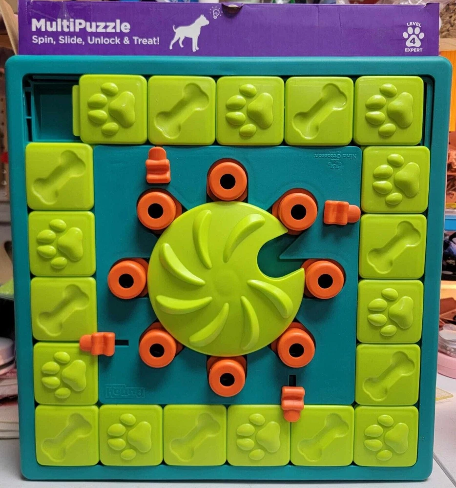 Outward Hound Multi Puzzle Level 4 Spin Slide Unlock & Treat THIS IS AN INTERACTIVE DOG TOY THAT SHOULD BE MONITORED WHILE IN USE From the back of the box: Fight boredom by keeping your dog busy Fun for all dogs regardless of age, size or breed Easy to clean Removeable center wheel Made with food safe material - BPA, PVC and phthalate free Our most challenging game yet! Sliders move one at a time. Rotate center wheel to access treats. Slide covers to reveal treats. Lift the locks over the sliders to increase the challenge. New to MultiPuzzle? Here is a few quick tips for starting out. The MultiPuzzle is an expert level game, so it is best to introduce it to your dog in stages and teach your dog how to "play by the rules" below. Start out easy without using the locks. Place treats under all the outer and inner sliders and cover the compartments. Once your dog has mastered retrieving treats from the inner and outer compartments, you can start to increase the challenge. For an increased challenge - lift the locks over the sliders. When your dog tries to retrieve the treats, the locks will fall down and lock the sliders. For the Ultimate challenge - slide the locks between the sliders. Work your way up to locking all 4 locks as your dog learns to unlock the sliders. Ships with USPS Ground (formerly First Class) package Local pick-up available. Must have eBay app on phone to scan the QR code. See my other listings below: https://www.ebay.com/usr/scruffi-dogg