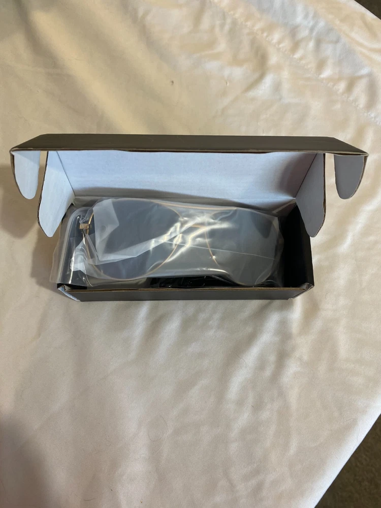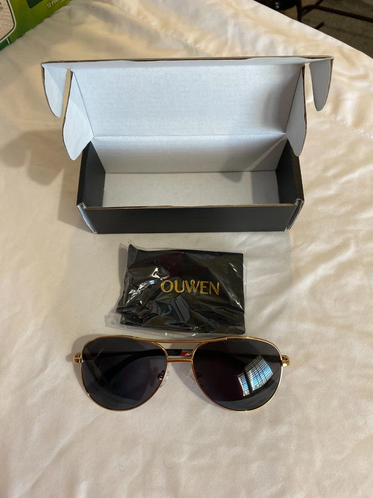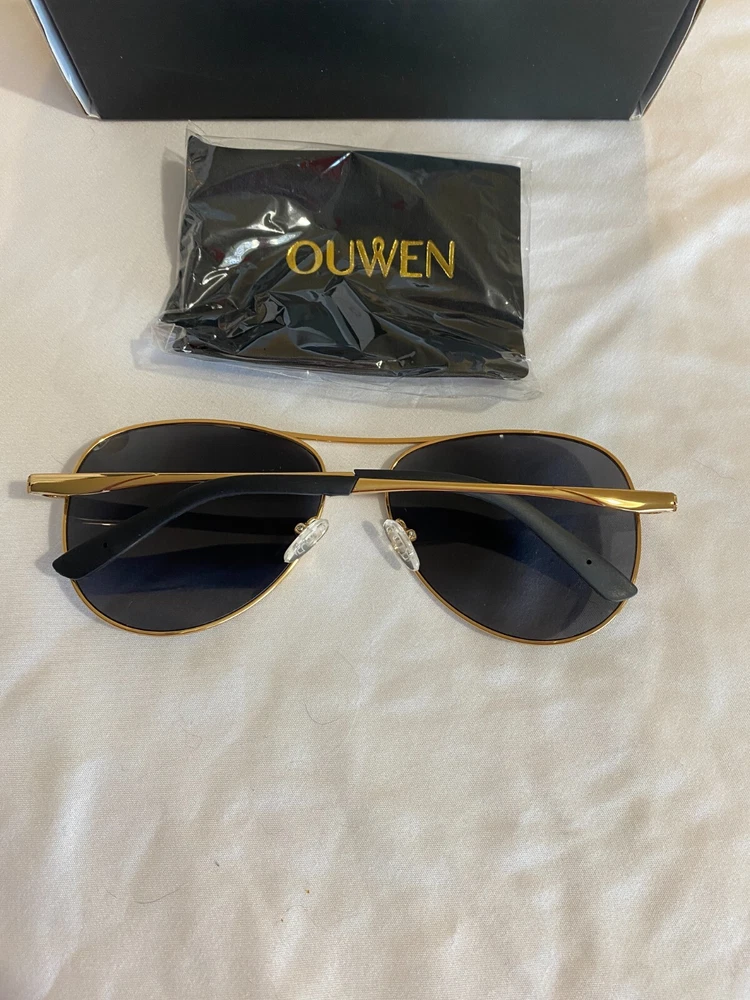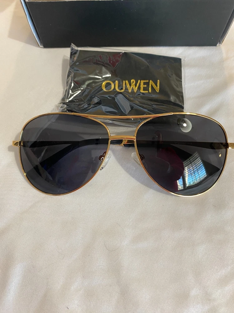 Ouwen aviator style goldtone rimmed sunglasses, new with tags original packaging Unisex aviator style sunglasses with storage box and cleaning cloth. You will receive the item in the photos. We can only ship to addresses in the US. Shipping is free! tags: sunnies, shades, glasses, eyewear, eye wear, fashion, eye protection, spring, summer