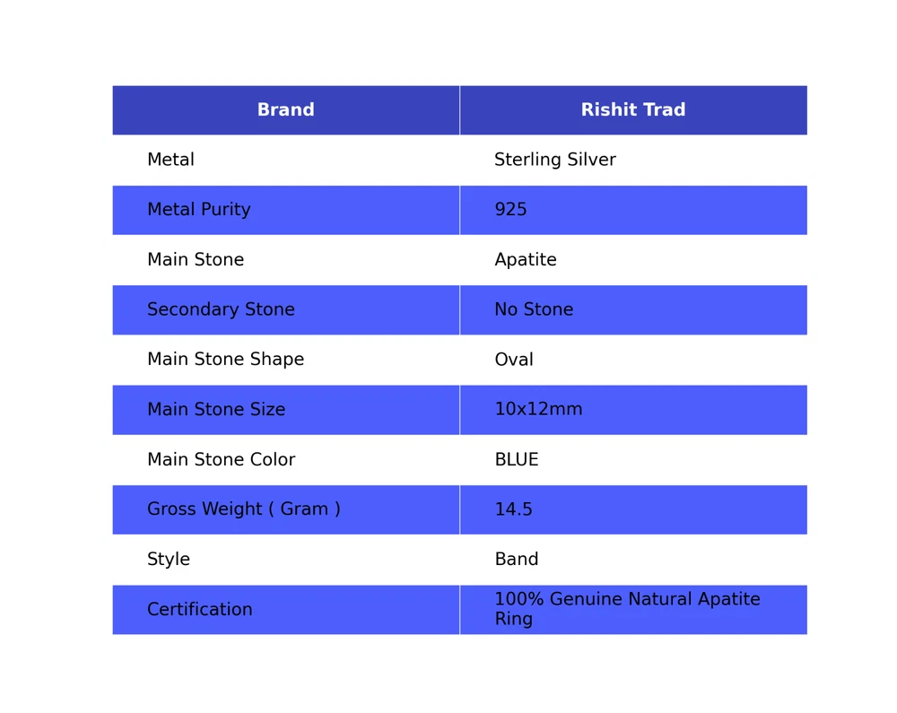 Make yourself trendy and stylish with this 925 Sterling Silver Ring glittering with Apatite that will add majestic charm and elegance to your look. Exquisitely designed, this Ring will provide you a classy look. ---------------------------------------------------- ------------ Welcome to Our Shop Rishittrad ---------------------------------------------------- ------------ Apatite Gemstone Band Ring Size 925 Sterling Silver For Women Description:- SKU : - RR-53-6 Metal : - Sterling Silver Metal Purity : - 925 Gemstone : - Apatite Gemstone Color : - BLUE Gemstone Shape : - Oval Gemstone Origin : - Setting : - Ring Size : - US ---------------------------------------------------- ------------ -------- ------------ Elegant Birthday Tribute:- Discover the essence of sophistication with our Birthday Radiance collection. Crafted with exquisite attention to detail, each piece embodies the timeless elegance and symbolic significance of birthdays. Craftsmanship Excellence:- Meticulously fashioned from premium 925 sterling silver, our jewelry pieces boast a classic and enduring design. The rich tones of natural gemstones complement the silver setting, creating a captivating harmony that resonates with wisdom and truth. Symbol of Personal Growth:- Gift with intention and meaning. Our Emblem of Wisdom pieces symbolize heartfelt wishes for personal growth and enlightenment on the recipient's special day, making it a cherished gesture of love and appreciation. Versatile Elegance:- Measuring at 1.2 inches, our creations seamlessly blend into any ensemble, offering both daily wearability and the ability to elevate sophisticated looks for special occasions. Their adaptable design ensures they become treasured additions to any jewelry collection. Thoughtful Expression of Love:- Surprise your beloved with a gift that transcends mere adornment. Our Natural Gemstone 925 Sterling Silver collection is a stylish and thoughtful token, exuding elegance and emotion while conveying warmest wishes with enduring grace. Exquisite Presentation:- Delight in the joy of gifting with our meticulously presented pieces, elegantly housed in an exquisite gift box. Make their birthday truly memorable by presenting them with a gift that captures the allure and timeless elegance of sterling silver. -------------------------- Image Policy----------------------------- All images are captured in natural lighting. The product showcased is the exact item you'll receive. -------------------------- Delivery Policy-------------------------- Standard Shipping typically takes 15-25 days, depending on your location. For expedited shipping, additional charges will apply. --------------------------- Product Policy--------------------------- You will receive the exact product depicted in the photos. All items are meticulously handcrafted. ------------------------------ Order Policy------------------------------ We welcome orders from around the globe. Custom orders are also accepted. Bulk orders are available upon request. Should you have any queries about our products, please don't hesitate to reach out. Upon receiving your product, we'd appreciate your feedback. ⋆⋆✦✧✦⋆⋆⋆⋆✦✧✦⋆⋆⋆⋆✦✧✦⋆⋆⋆⋆✦✧✦⋆⋆⋆⋆✦✧✦⋆⋆⋆⋆✦✧✦⋆⋆⋆⋆✦✧✦⋆⋆ "Discover a captivating collection of handcrafted gemstone jewelry at our boutique." https://www.ebay.com/str/rishittrad0 ♥ Thank you for choosing us ♥