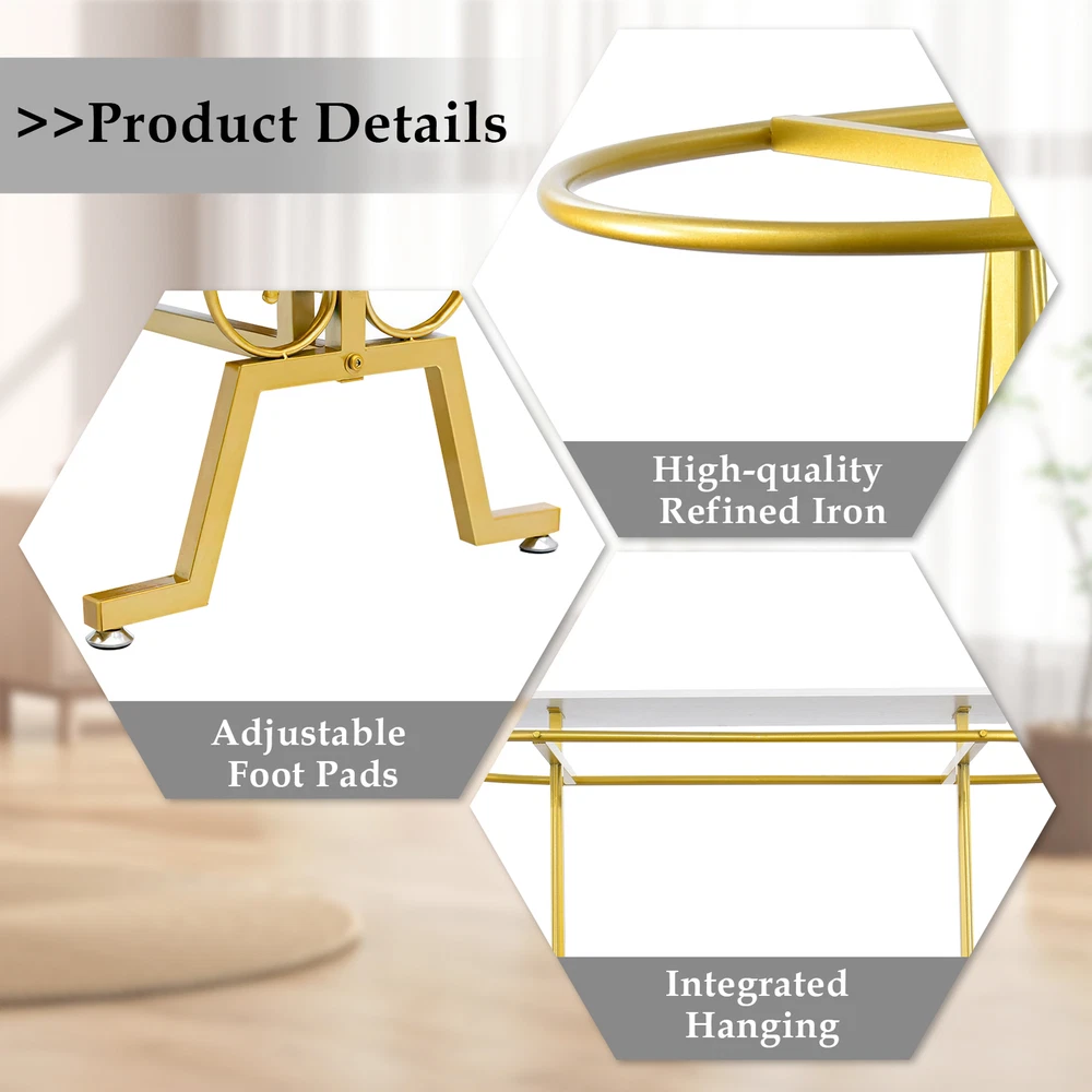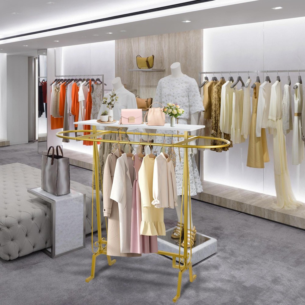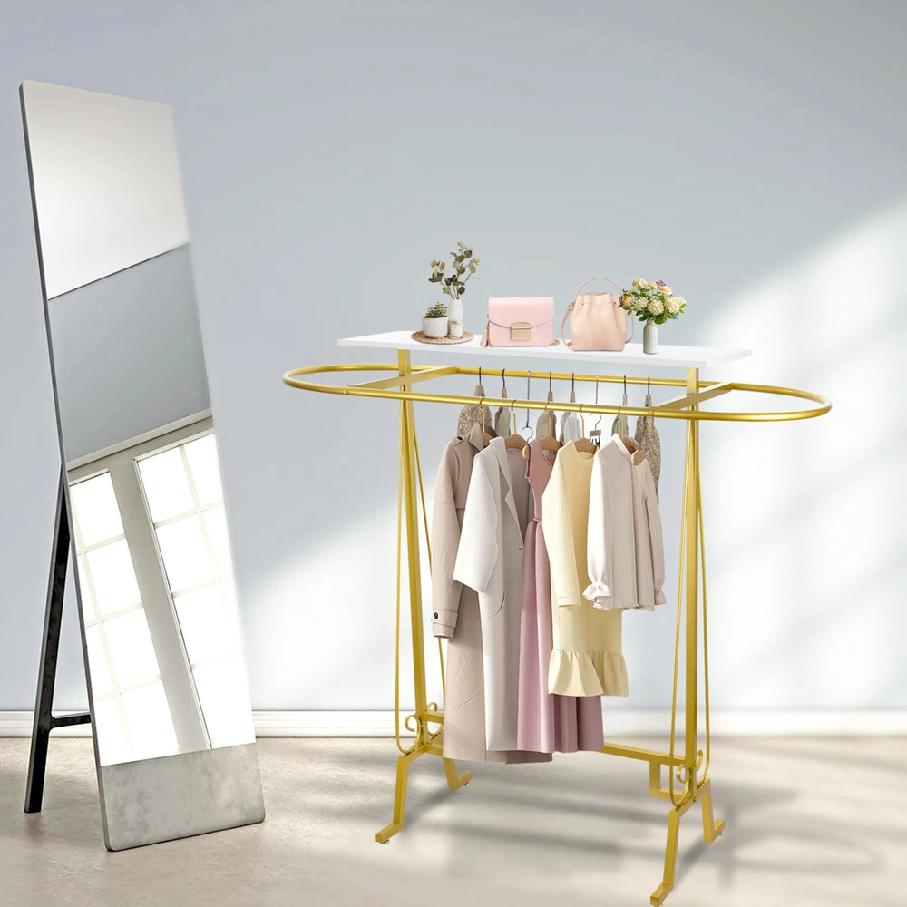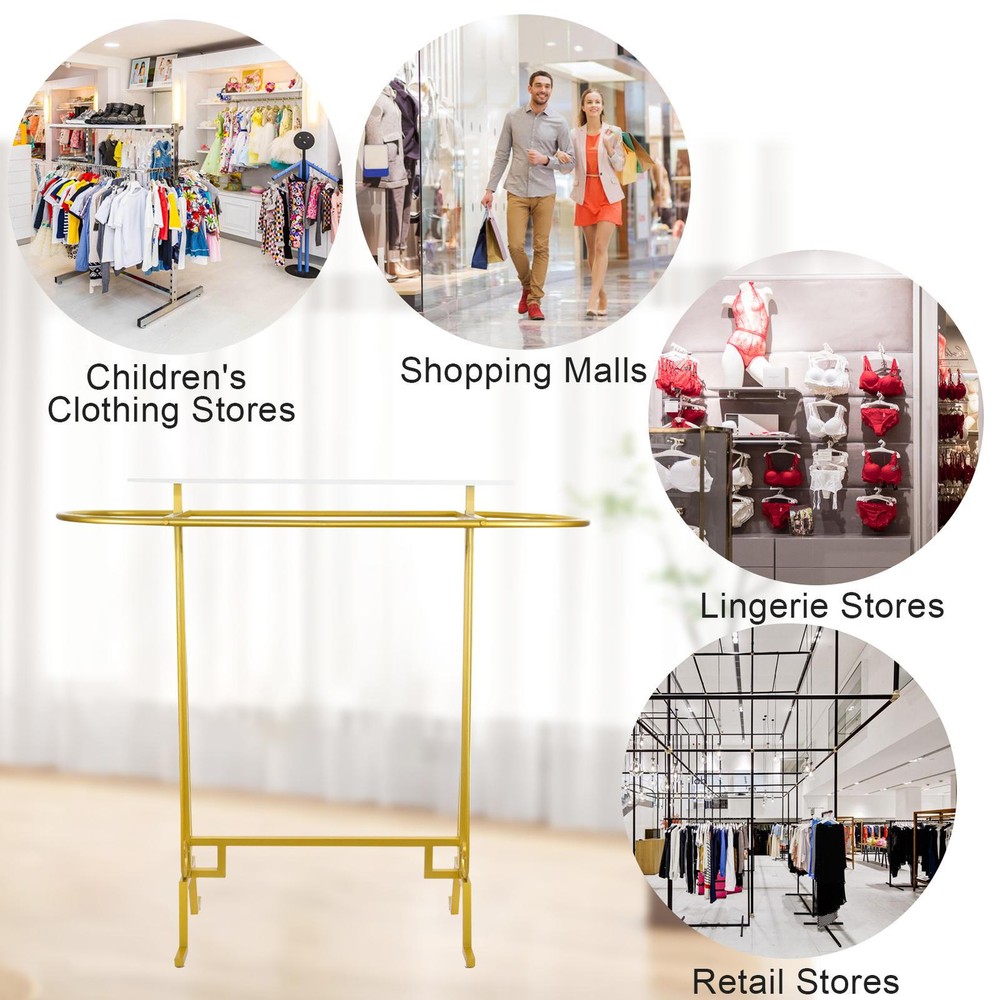 Clothing Display Rack Oval Iron Rack Garment Display Double Space decent Bullet Points: Enhanced Stability: With smooth and polished rod surfaces, the oval design prevents clothes from falling off, while 4 feet at the bottom prevent the hanger from moving at will, making it convenient to move clothes and prevent hooking Sturdy Framework: Using reinforced galvanized iron support rods, this freestanding clothing rack has a solid structure and robust load-bearing capacity, making it capable of easily supporting heavy winter clothes without deforming Sufficient Capacity: Effortlessly store a vast array of clothing with a top shelf to arrange various accessories, books, plants, and more. Keep your attire organized and efficiently accessible for easy mornings Widely Used: Our freestanding clothing rack features a distinctive design that enables you to conveniently store and access different types of clothing on a daily basis. It's perfect for use in large malls, retail stores, shopping centers, children's boutiques, and any intimate apparel shop Easy Installation: With the aid of auxiliary tools, punch the board, and tight screws, this freestanding clothing rack can be easily set up, ensuring an easy installation process This freestanding clothing rack features solid structure and smooth, polished rod surfaces to keep your clothes organized and on display. With its user-friendly design, you can easily locate any item and keep it within reach. It's perfect for retail stores and can be easily assembled by tightening the screws. Specifications: Product name: Clothing rack Product size: about 150x137x55cm/59.06x53.94x21.65 inches Color: Gold/Black Material: Iron Load bearing: 300 pounds/136 kg Purpose: Store clothes Packing list: Oval connecting rod*1 Side columns*2 Wrench*1 Screws*9 Lower connecting rod*1 Shelf*1 Foot pads*4 We accept PayPal payment,PayPal Credit,Credit card or debit card and so on. Payment should be completed within 4 (Four) days of auction closing. Or unpaid dispute will be filed for closing auction. We will leave a positive feedback immediately after payment is received. We appreciate a positive feedback as much as you do. If for some reason there is any issue with the purchase, please contact us prior to leaving feedback, we will be glad to work together and provide a satisfying solution. 1. We ship to your eBay address. Each package will be shipped via FedEx or UPS 2-8 business days with tracking number 2. Please check your shipping address carefully before checkout, it can't be changed if order completed. 3. Shipping within 1 business days once payment completed. Orders placed on weekend will be delay 1-2 days. 4. Please allow 6 business days for delivery to any destinations. 5. As a buyer, it is your duty to pay the tax when you make an order from abroad. Our price does not include taxes, VAT, or other hidden charges. 1. We maintain high standards of excellence FIVE STAR and strive for 100% customer satisfaction! 2. Positive Feedback is very important to us. We hope that you contact us immediately BEFORE you give us neutral or negative feedback, so that we can satisfactorily address your concerns. 3. We promise to offer the best price and high quality products. 1. If you have any questions, please send a ebay message. 2. We will reply within 48 hours of your email. Weekend will be delayed a bit.
