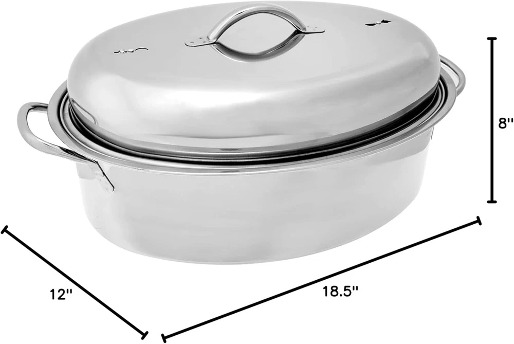 Oval Roaster Set, Stainless Steel, 10-Quart DURABLE DESIGN: This roaster set is constructed from 18/0 stainless steel, ensuring it will serve you well for many s to come. RETAIN TEMPERATURES: Featuring a high domed lid, this unique design will keep your roast at the ideal temperature. MAXIMIZE YOUR MEAT: Includes a removable chromed roasting rack that elevates your meat, underneath which will fill with succulent juices. EASY TO CLEAN: This set is dishwasher safe for easy cleaning, just be sure to keep it on the top rack. MEASUREMENTS: This oval roaster set weighs pounds and has dimensions of 12 x x 8 inches. Roast your favorite poultry, meat, seafood, or vegetables using this large 10-quart/10L Oval Roaster! Made of durable 18/0 stainless steel, heat is evenly circulated to give your dish the perfect roast. This set includes a removable chromed roasting rack that elevates your meat, underneath which will fill with succulent juices, and a high domed lid that keeps your roast at the ideal temperature. This oval roaster set is perfect for your chicken and beef dishes, as it allows proper roasting by lifting your Thanksgiving or holiday turkey, chicken, rib roast, or duck up out of its juices for an even, all-around browning. You can also easily baste your roast in its own juices to keep it moist, tender and tasty. Be the hit of the holidays with this set!