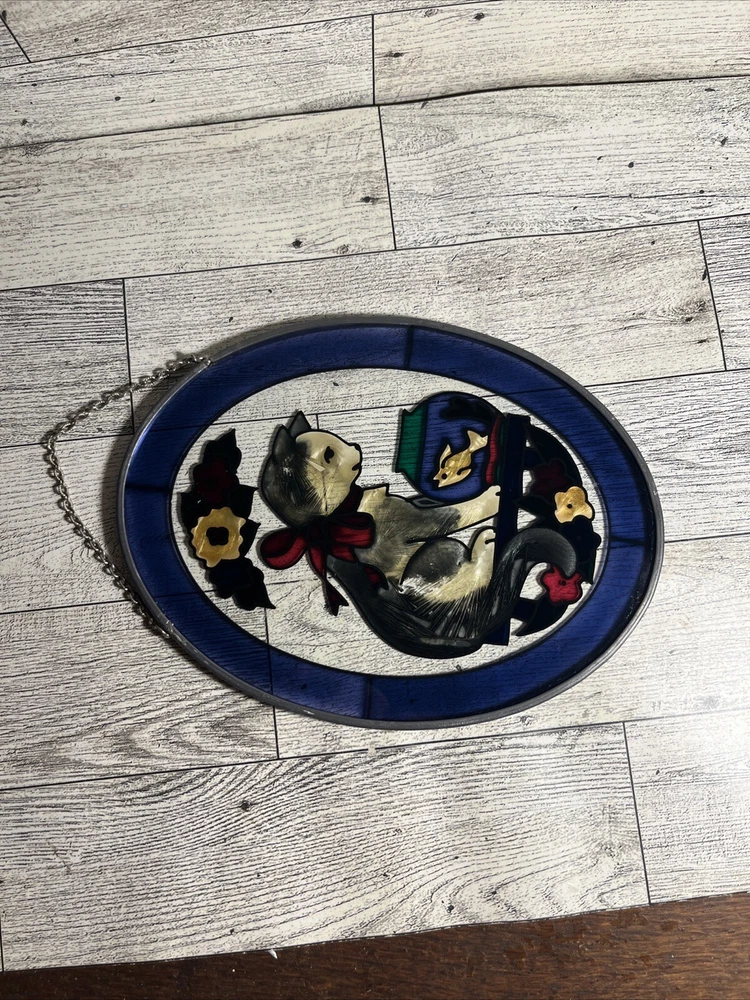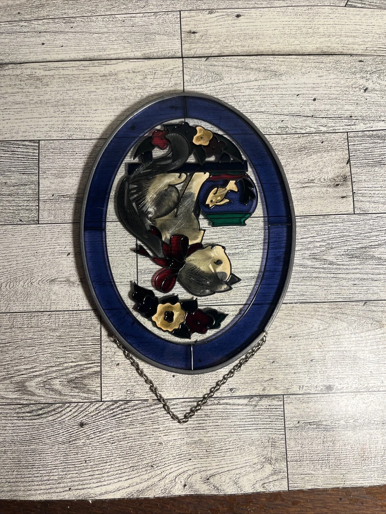 Very Good Condition! Beautiful & Vibrant Colors Add a touch of charm to any room with this beautiful oval-shaped stained glass window/wall decor. Featuring a cute cat and fish design, this piece is perfect for adults who love to add a touch of whimsy to their home decor. The multicolor glass and metal materials give it a unique and eye-catching finish that is sure to brighten up any space. Measuring approximately 8.5” in height, this window/wall decor is versatile enough to be hung in any room. The intricate cat and fish design is sure to delight anyone who sees it, making it a great addition to any home decor collection.