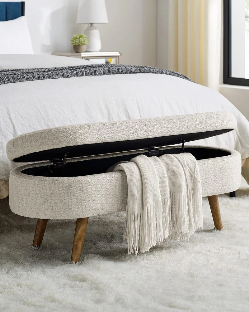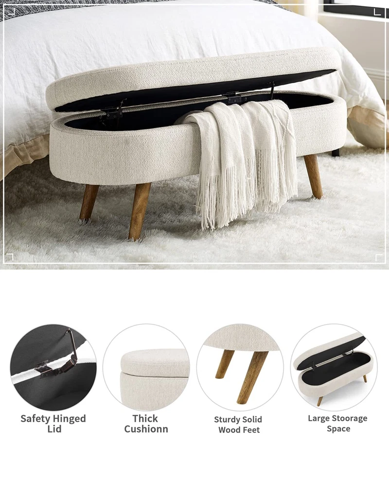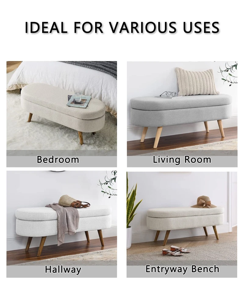 Oval Storage Bench 43.5" Linen Fabric Upholstered Entryway Bench with Solid W...