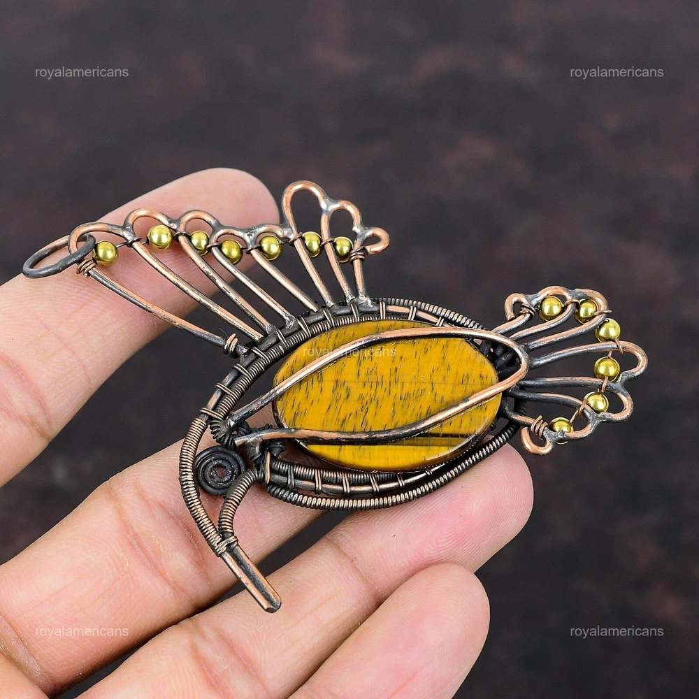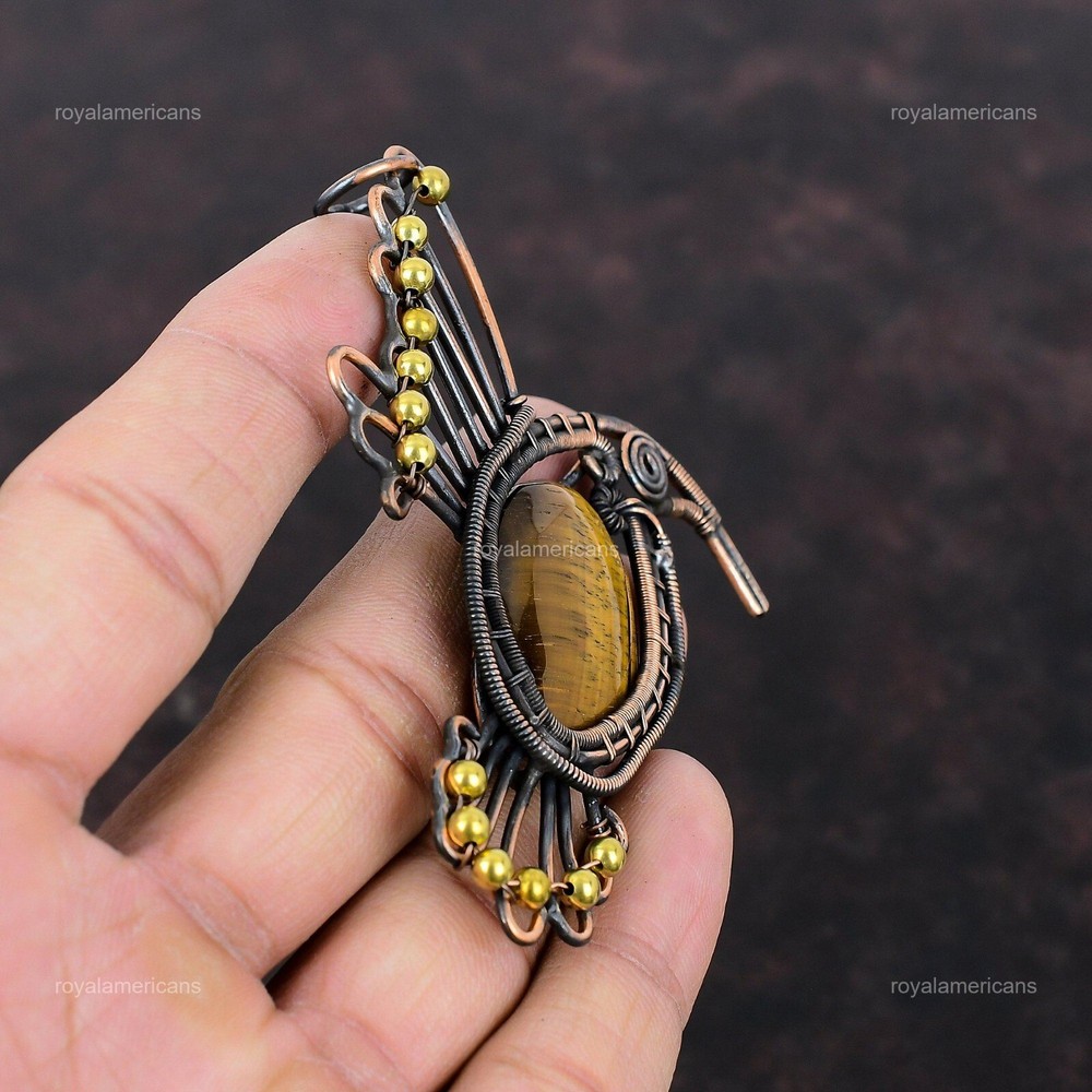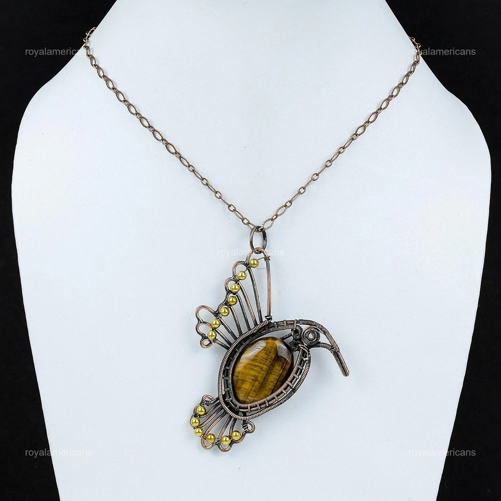 Note : Due to the natural formation of this gemstone. Slight variation in design and color are to be expected. Welcome to Royalamericans Mothers day Deal Oval Tiger's Eye Gemstone Bird Artisan Pendant Jewelry Copper Handmade Pendant, Wire Wrapped Pendant, Wire Wrapped Jewelry, Copper Pendant, Copper Wire Pendant, Wrapped Jewelry, Wire Wrap Pendant, Wire Wrap Jewelry SKU : UFWP-3335 Gemstone : Tiger's Eye Stone Shape : Oval Metal Purity : Unknown Copper Length : 91 Millimeters Width : 68 Millimeters Copper has been used for jewelry making for thousands of years, dating back to ancient civilizations such as the Egyptians, Romans, and Aztecs. Copper was valued for its beauty, versatility, and durability, and was often used to make everything from jewelry and coins to cookware and tools. In addition to its historical significance, copper jewelry also offers several benefits. Copper is a natural conductor of heat and electricity, which makes it ideal for energy healing and therapeutic purposes. Wearing copper jewelry is believed to have various health benefits, such as improving circulation, reducing inflammation, and boosting the immune system. Some people also believe that copper jewelry has the ability to balance energy and improve mood. For Mother's Day Gift For Father's Day Gift For Promise For Valentine's Day For Halloween Party For Christmas Day Gift For New Year Party For Mom For Her If you can't find the information you need or need some advice for your design? Feel free to contact us. We are fast to reply :) All our work is made by hand with Love and Care in our workshop Thank you so much for visiting and hope you enjoy shopping with us Royalamericans is committed to delivering the best quality sterling silver jewelry to customers. As a handmade jewelry manufacturer, we offer an extensive selection of copper gemstone jewelry that showcases the brilliance of our craftsmanship. We are an experienced handmade jewelry supplier with expertise in embellishing gemstones to suit every style. We offer you the liberty to create your jewelry ensemble with sparkling, earthy, and pure gemstones. Our Talented artisans masterfully handcraft each piece of jewelry you see here. Our pieces are made with genuine gemstones.