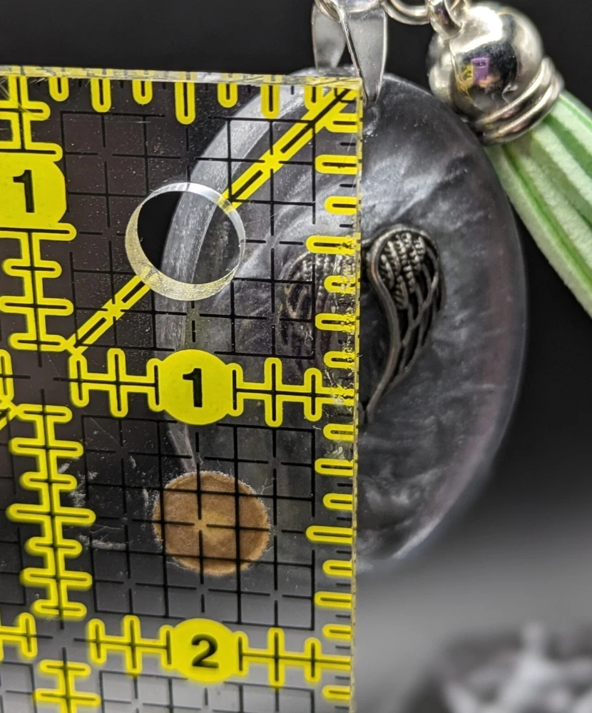 Add a touch of elegance to your keys with this beautiful handmade oval silver resin keychain. The keychain features an angle wings charm and a green tassel that adds a pop of color to your keys. Made in the United States, this keychain is a perfect addition to your collection of handcrafted pieces. The unit quantity is one keychain. This item is perfect for those who love handmade one of a kind items. This keychain is a unique piece that will make a great addition to your collection. DISCOUNTED: The price is lowered about 25% due to slight imperfections. Original price - $5.00, discounted price $3.75