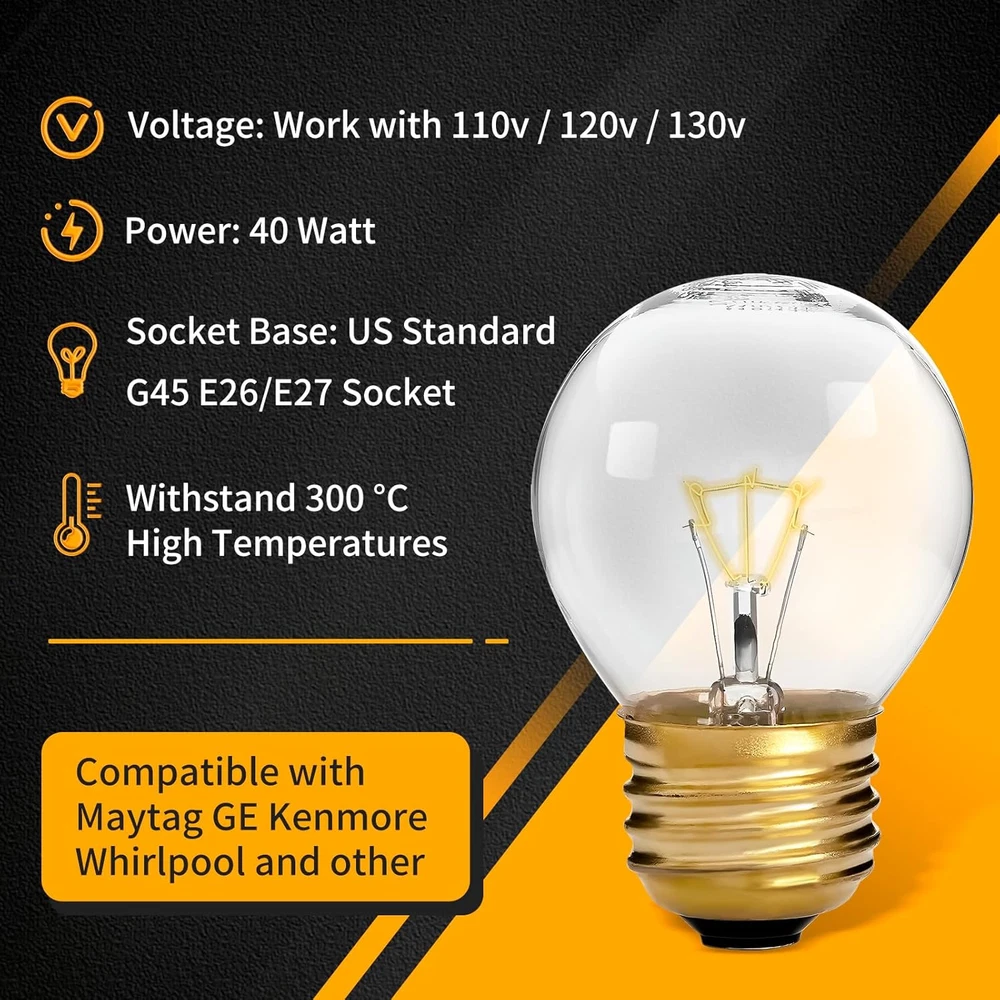 This appliance light bulb could be used in oven, stove, range hood, microwave, refrigerators, fridge, garden light fixtures and other household appliances Compatible with Maytag GE Kenmore Whirlpool and other brand. US Standard G45 E26/E27 Socket, work with 110v / 120v / 130v, 40W, Medium Brass Lead-Free Base Withstand 300 °C high temperatures, durable and long lasting. Pack of 4 appliance light bulbs. Bulb size: 2.68" X 1.76" Product Description Store Bulb Model List Add to Cart Add to Cart Add to Cart Add to Cart Add to Cart Add to Cart Customer Reviews 4.2 out of 5 stars 938 4.5 out of 5 stars 637 4.5 out of 5 stars 6,549 4.5 out of 5 stars 5,295 4.7 out of 5 stars 171 4.5 out of 5 stars 618 4.5 out of 5 stars 183 Price $9.13 $ 9 . 13 $8.06 $ 8 . 06 $7.99 $ 7 . 99 $6.68 $ 6 . 68 $8.59 $ 8 . 59 $5.43 $ 5 . 43 $6.58 $ 6 . 58 Socket Base US Standard G45 E26/E27 Socket E17 G8 bi-pin base E17 Base E17 E17 Base E12 Power 40W 40W 20W 40W 40W 40W 15W Voltage 110v / 120v / 130v 130V 120V 125V 130V 125V 120V Replaces for the Part / WB36X10003 WB25X10019 WB36X10213 8206232A WB36X10003 8206232A WE05X20431, WE4M305 etc Quantity 4 Pack 2 Pack 2 Pack 2 Pack 3 Pack 3 Pack 2 Pack