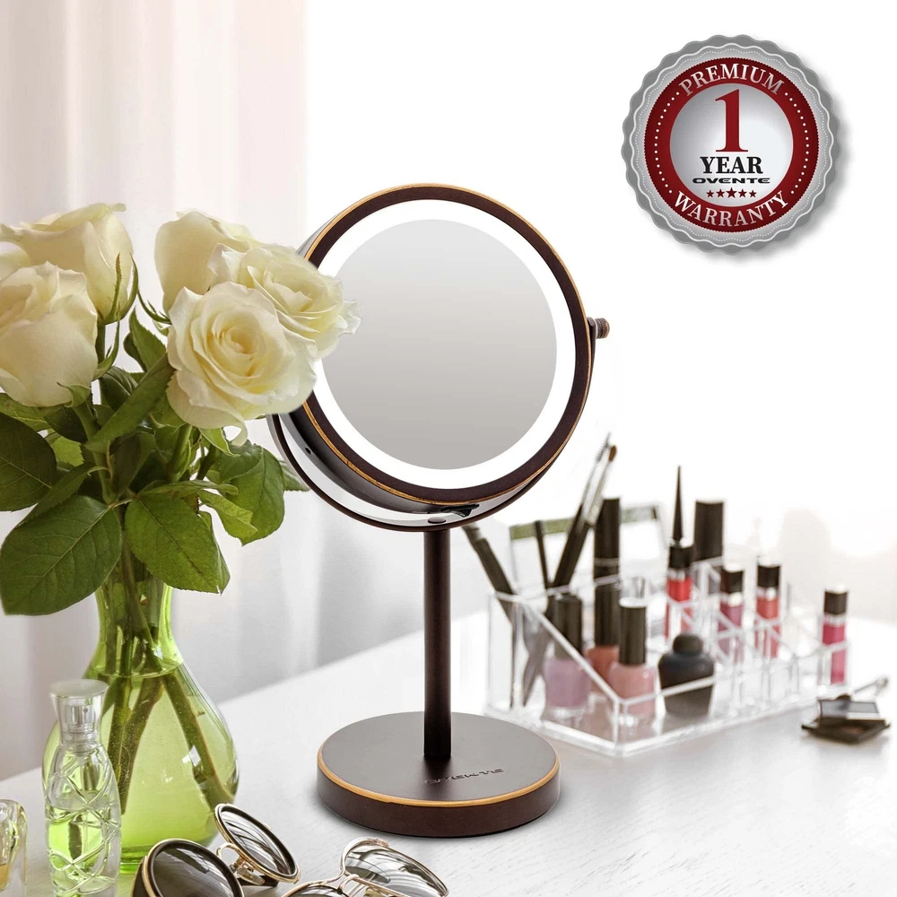 Ovente Lighted Vanity Mirror 6 Inch Table Top 1X 7X Magnification LED 360 Adjustable Double Sided Spinning Personal Makeup Stand Desk Bathroom Battery Powered Circle Large Antique Bronze MLT60ABZ1X7X Product Details Color: Antique Bronze Brand: OVENTE MPN: MLT60ABZ1X7X UPC: 814667022813 EAN: 0814667022813 Brand: OVENTE Room Type: Bathroom Shape: Round Product Dimensions: 7"L x 1"W Frame Material: Stainless Steel Brand: OVENTE Room Type: Bathroom Shape: Round Product Dimensions: 7"L x 1"W Frame Material: Stainless Steel Style: 7X Magnification Mounting Type: Tabletop Mount Finish Type: Antique Bronze Special Feature: Dual Sided, Fog Free, Dimmable, Lighted, Magnifying Color: Antique Bronze Theme: Antique Specific Uses For Product: Makeup Number of Pieces: 1 Number of Items: 1 Material: Glass, Iron Frame Type: Framed Item Weight: 1.5 Pounds Assembly Required: Yes Frame Color: Antique Bronze Magnification Maximum: 7 Inches Manufacturer: OVENTE UPC: 814667022813 Global Trade Identification Number: 13 Item Weight: 1.5 pounds Country of Origin: China Item model number: MLT60ABZ1X7X Is Discontinued By Manufacturer: No Finish types: Antique Bronze Warranty Description: Us-based customer service: ovente warranties that the product shall be free from defects in material & workmanship under normal use & conditions, for 1 year from the original purchase date. Batteries required: Yes Import: Imported Dual-sided & 7x Magnifying This dual-sided 360 swivel design luxury mirror features 1x & 7x magnifications. The 1x provides a view of your face all at once and 7x for precision, because every detail counts. Distortion Free View Look 10 inches away for a distortion free view. This means this mirror will not stretch or shrink in its reflection. Cool Tone LED Ring Light This mirror is equipped with a Cool Tone LED light which simulates natural lighting. With LED lights, there is no need to worry about replacing light bulbs because they will last the entire lifetime of the mirror. Battery Operated - This mirror is powered by 4 AAA batteries (not included). Introducing the revolutionary MLT60 Series Mirrors—a game-changer for your grooming rituals! More than just a practical accessory, this tabletop makeup mirror serves as a stunning focal point that effortlessly complements various decor themes, from vintage charm to Hollywood glamour. Elevate the atmosphere of your office, bathroom, bedroom, or vanity space with its elegant design, infusing a touch of sophistication wherever it's placed. Engineered for convenience, ensuring optimal visibility for all your grooming needs. With its hands-free design, multitasking becomes effortless whether you're at home, in a hotel, at the dentist's office, or even in the powder room. Bid farewell to cluttered countertops—this tabletop gem offers a sleek solution, keeping your space tidy and organized. Experience unparalleled clarity with the magnified vanity mirror, enabling you to attend to every detail of your beauty routine with precision. Whether sculpting eyebrows or refining facial hair, this mirror guarantees impeccable results every time. Emitting positive vibes, it enhances the ambiance of any room, catering to individuals of all ages, from kids to adults. Its ability to magnify and showcase your accessories adds an extra layer of luxury to your grooming experience. Take your pick from four deluxe finishes— Matte Black, Antique Bronze, Nickel Brushed, and Polished Chrome—in size 6 inches with 1X/ 7X magnification. Transform your grooming haven with OVENTE’s MLT60 Series Tabletop Cosmetic Makeup Mirror—a perfect blend of style and functionality that elevates your space to new heights!