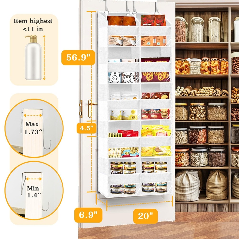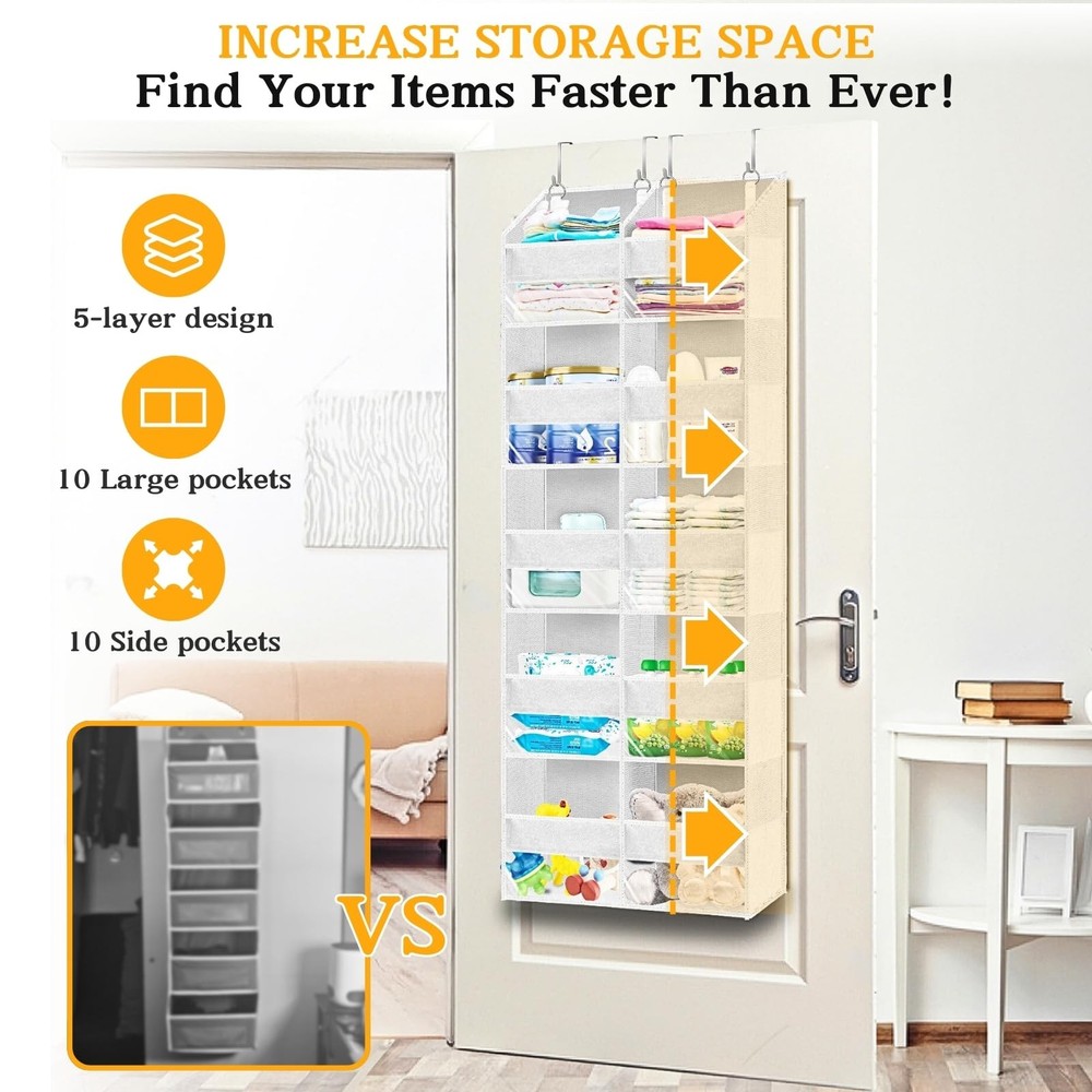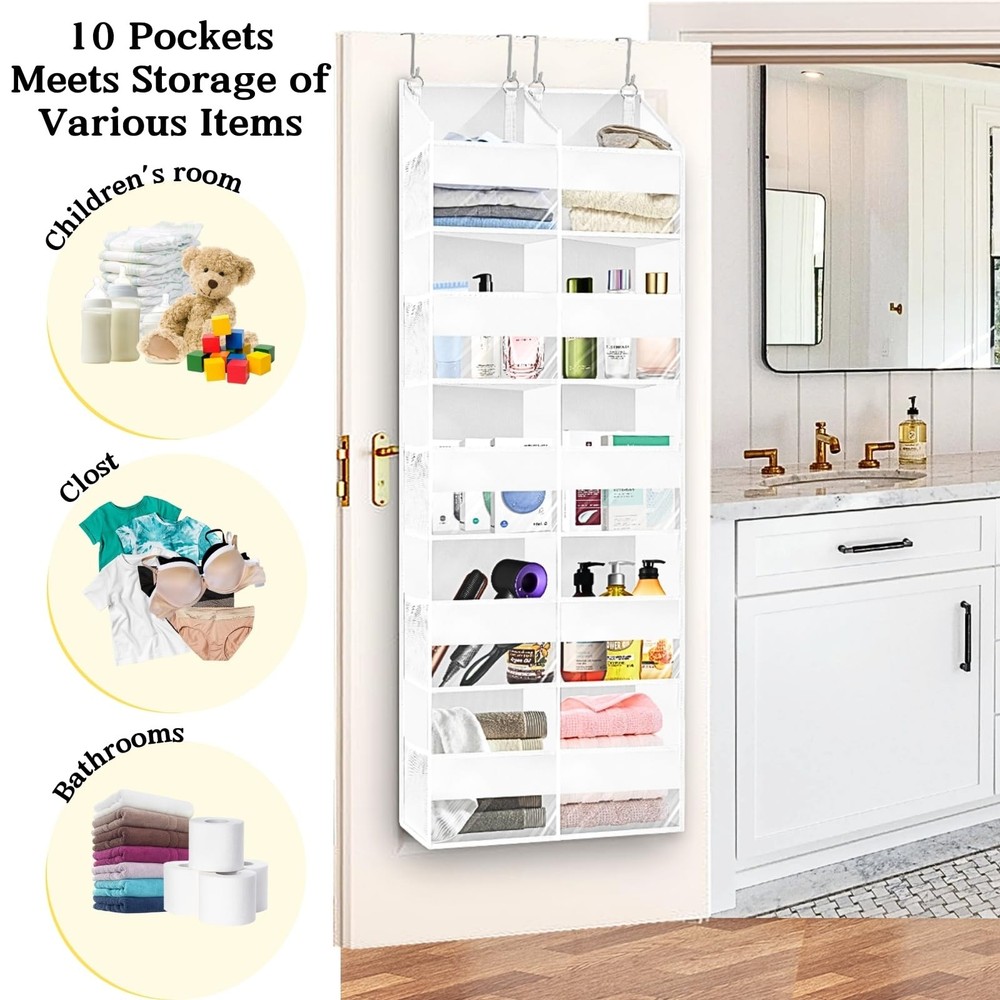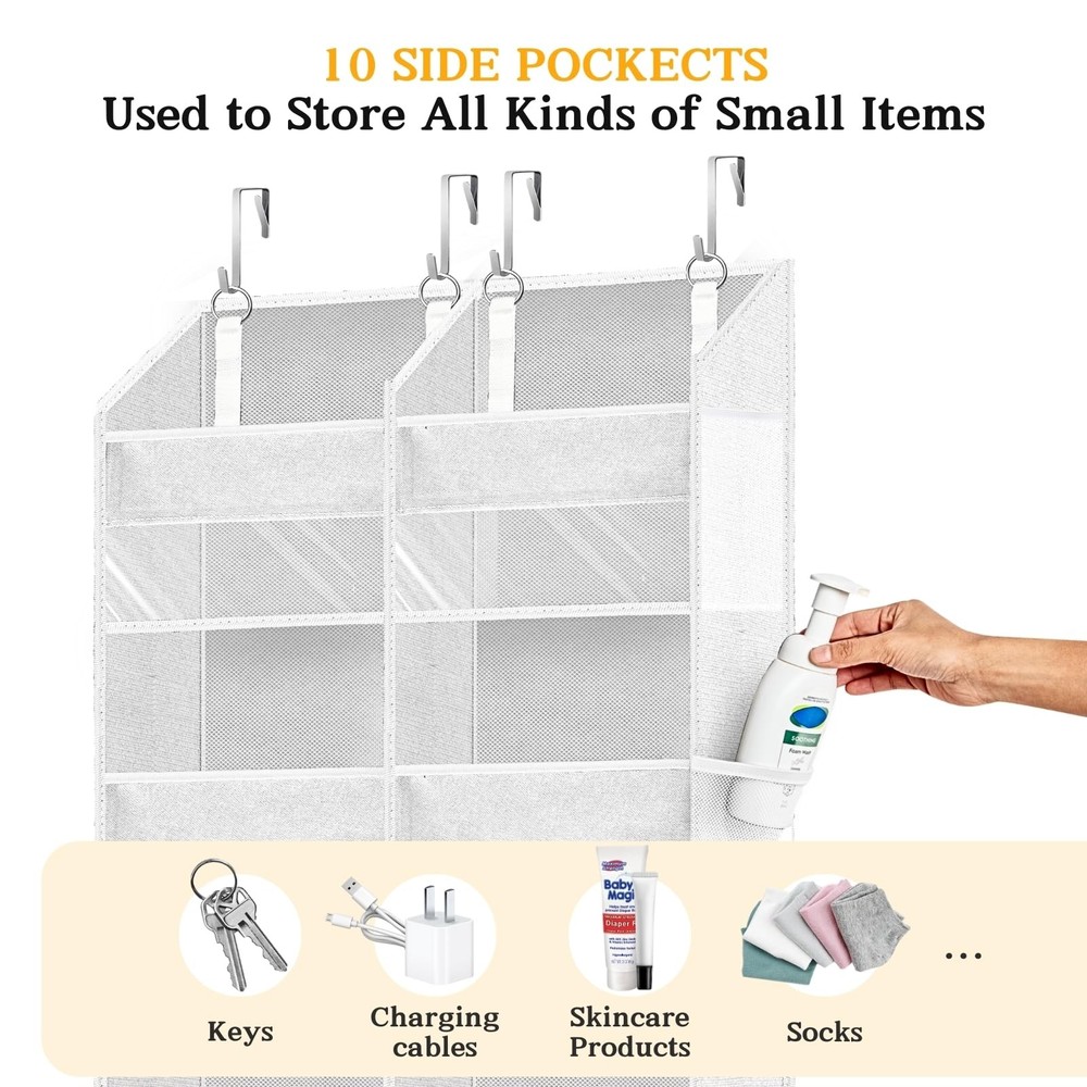 Transform Your Space with Over the Door Organizer – Your All-In-Solution for Stylish and Efficient Storage! Are you tired of clutter and searching for the perfect organization and storage solution? Look no further! Our Over-the-Door Organizer is designed to meet all your storage needs, from small spaces to baby essentials and everything in between.storage organizer Key Features: Versatile Storage: Revolutionize your space with this all-encompassing organizer. Ideal for pantry, bathroom, closet, kitchen, and nursery use, it's the perfect addition to any room. Space-Saving Wonder: Maximize your living area with this space saver. Perfect for small apartments, studio apartments, and those in search of efficient storage solutions. Yarn Organizers and Storage: Crafters rejoice! Dedicated compartments for yarn storage ensure your creative supplies are neatly organized and easily accessible. Studio Apartment Must-Haves: Essential for studio apartment living, this organizer is a must-have for those looking to optimize their space without sacrificing style. Hall Closet Organizers: Keep your hallway clutter-with this organizer, designed to seamlessly fit into hall closets and enhance organization. Additional Features: Baby Registry Essential: Aspiring parents, take note! Our organizer is a baby registry essential, ensuring you have all the newborn must-haves and essentials at your fingertips. Purse Bins and Nursery Storage: Keep purses and nursery essentials in check with dedicated bins, providing a chic and organized look to your space. Effortless Installation: No need for complex setups. Enjoy easy installation and revel in the benefits of a clutter-and organized space. Multilingual Convenience: Our organizer caters to a global audience with the inclusion of the term "organizador." Invest in the perfect solution that seamlessly combines functionality, style, and adaptability. Our Over-the-Door Organizer is your ticket to an organized, efficient, and visually pleasing home. Order now and experience the transformative power of efficient storage! 【5 Tiers & 10 Compartments, Extra Large for More Room】 over the door organizer is the only *2-in-1 design among all similar products. Its *10 compartments satisfy more classification needs rather than traditional 5 partitions. A must-have storage for small spaces that making items more organized and freeing up more space, an optimal choice in all of the behind door storage products. 【20 Inch Expanded Width & 50lb Capacity, Load More Stuffs No Tilting 】This room storage is able to load *50lb household goods without tilting. Dimension *20”(Width) X 56.9”(Height) X 6.9”(Deep), though wider but reasonable dimension designed for doors, this is the another advantage makes it to be your idea closet organizer. 【4 Supporting Hooks &10 Mesh Side Pockets, Reliable and Convenient】 *4 hooks gives the closet organizers and storage reliable rather than traditional 2 hooks. You can hook it on all the regular thick doors (1.4”~1.73”). It also have 10 mesh pockets on the side for small items like keys and combs or flip flops and frequently used stuffs, keep your essentials at your fingertips. 【 Environmentally Friendly Fabric& See-through Clear Window】Our back of door storage is made of durable, breathable, and odorless non-woven fabric. The transparent PVC front allows for easy searching of household goods. It can be used as a diaper organizer, yarn storage, towel organizer, clothes organizer, storage organizer. 【Easy to Install & Versatile for Multiple Storage Purpose】Designed for easy installation, you can complete the setup in less than 5 minutes. Our Over the door organizer is suitable for storage room, baby room, children’s room, bathroom, bedroom, kitchen and more. Package include: 1X 5-Tier Over the Door organizer; 4 X Hooks; 1 X User Manual.