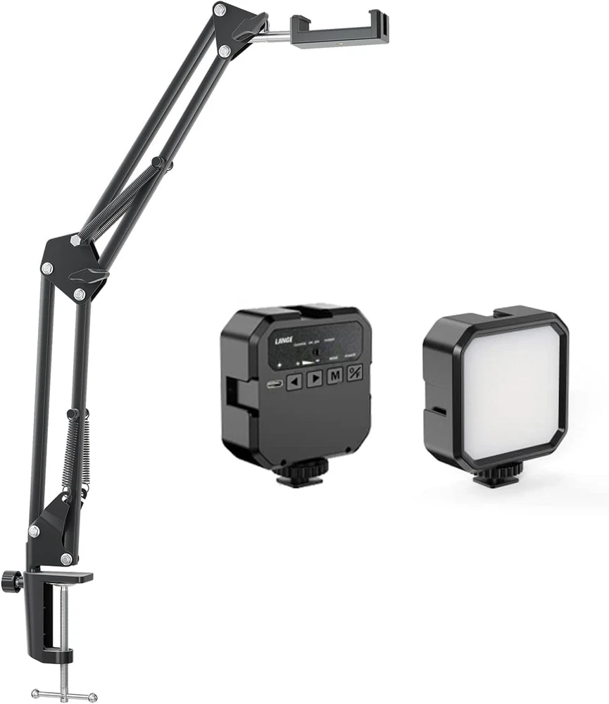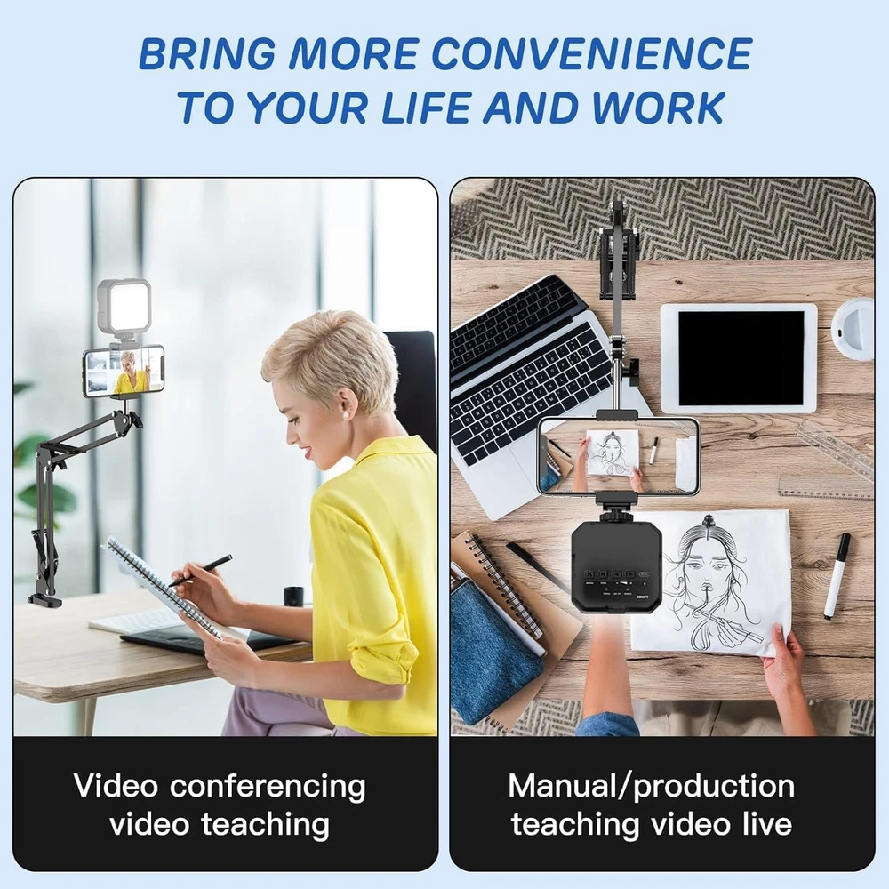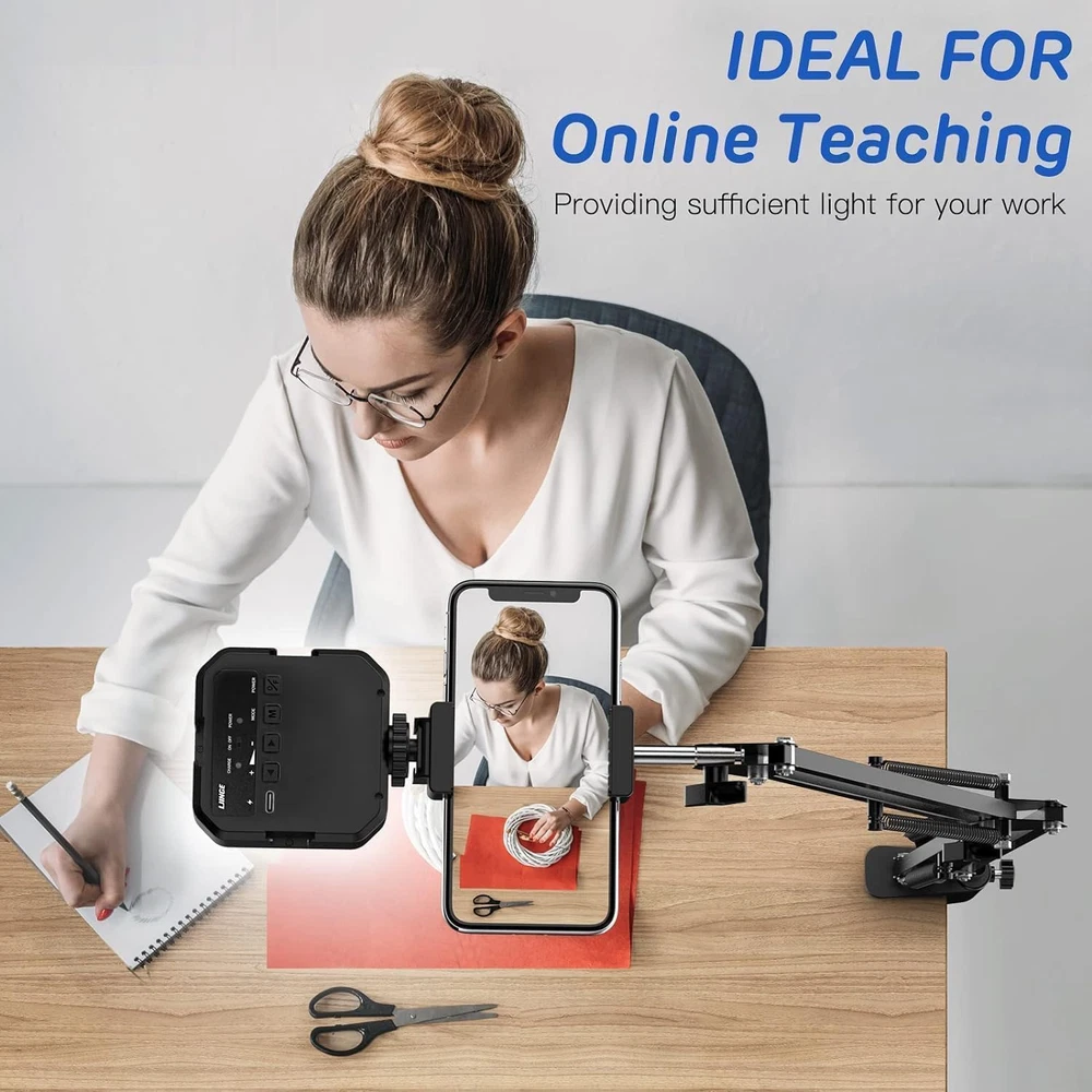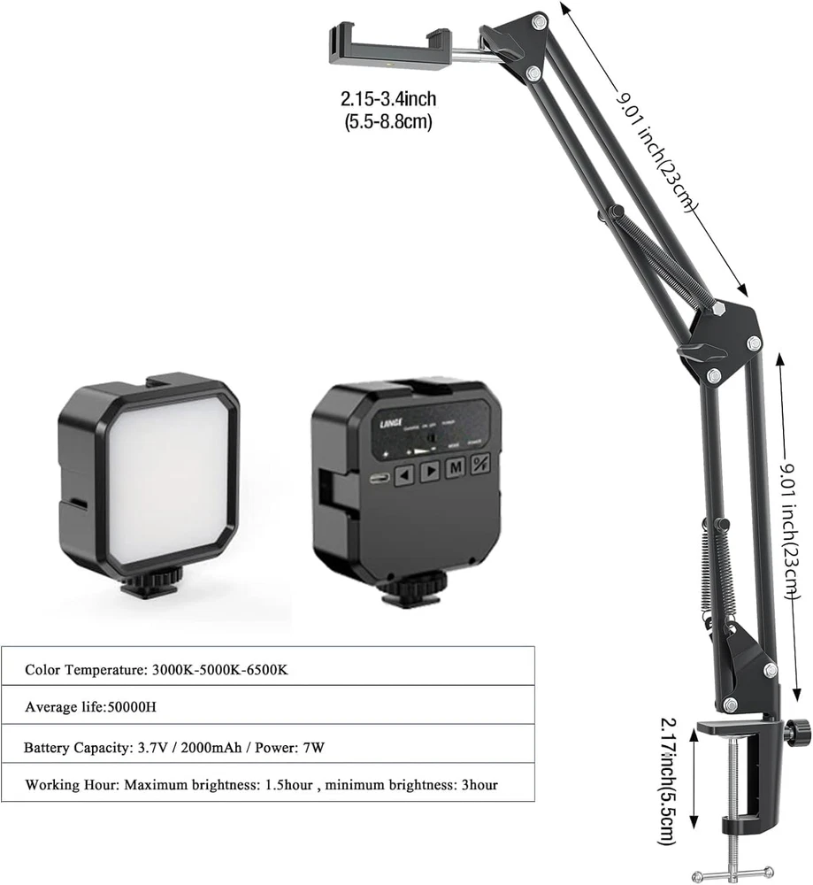 【More clear and Bright】The overhead phone mount is equipped with an led light, which has 3 modes and 10 adjustable brightness, provide proper but sufficient light for different occasions. Warm tips: This product is only suitable for providing supplemental lighting during photography, video recording, and more. It is not phone projection 【2000mAh Rechargeable Battery】Built-in large-capacity lithium battery, charging time is 2 hours, maximum brightness output up to 90 minutes, minimum brightness output up to 180 minutes.Supports with type c charging port, 3.7V 7W output,safer and more convenient to use 【Universal Compatibility】The phone bracket is compatible with a Width of 2.15-3.45 inches (5.5-8.8 cm) phones, included almost all the smartphones. Table mounting clamp has rubber pad to protect your desktop from scratches. The clamp can be adjustable to maximum height 2.16 inches (5.5 cm). 【Flexible Arm】This overhead tripod comes with 2 arms, suspension Arm can free to adjust to any angle. Keep your phone at appropriate distance from your eyes. Warms tip:It has a max load weight of 2 lbs/0.9 kg(Not for heavy duty Cameras or devices) 【Please note】 To enhance user convenience, we have extended the charging cable. However, we don't recommend using the device while charging, as the light may dim and not achieve the desired brightness Product Description Why Choose LJINGE Overhead Phone Mount? The way it shoot ahead to your documents, crafts and scenes is broad and bright, no more shakings, no more shadows, no more tripod stand in the views. Clamp the table top tripod mount stand on anywhere and bend it to any angles to create your video, free the hands for better creation. Phone Suspension Arm: With dual suspension springs, make it more solid and stable; the flexible boom arms allow you to carry it easily and adjust with suitable angle and height to meet your need. USB powered led light saves the worries for batteries, it is a led fill light or led desk lamp. Ideal for video recording, online teaching, remote working, broadcasting, Zoom calls, drawing, cooking, sketch shooting and document scanning, making study and work more efficient. Live Streaming Video Recording Cooking Drawing LED Vidoe light *1 Color Temperature: 3000K-5000K-7000K Average life:50000H Battery Capacity: 3.7V / 2000mAh / Power: 7W Working Hour: Maximum brightness: 1.5hour , minimum brightness: 3hour Lamp dimensions: 3 inch metal cantilever bracket *1 Phone holder *1 The phone bracket is compatible with a Width of 2.15-3.45 inches (5.5-8.8 cm) phones USB charging cable *1