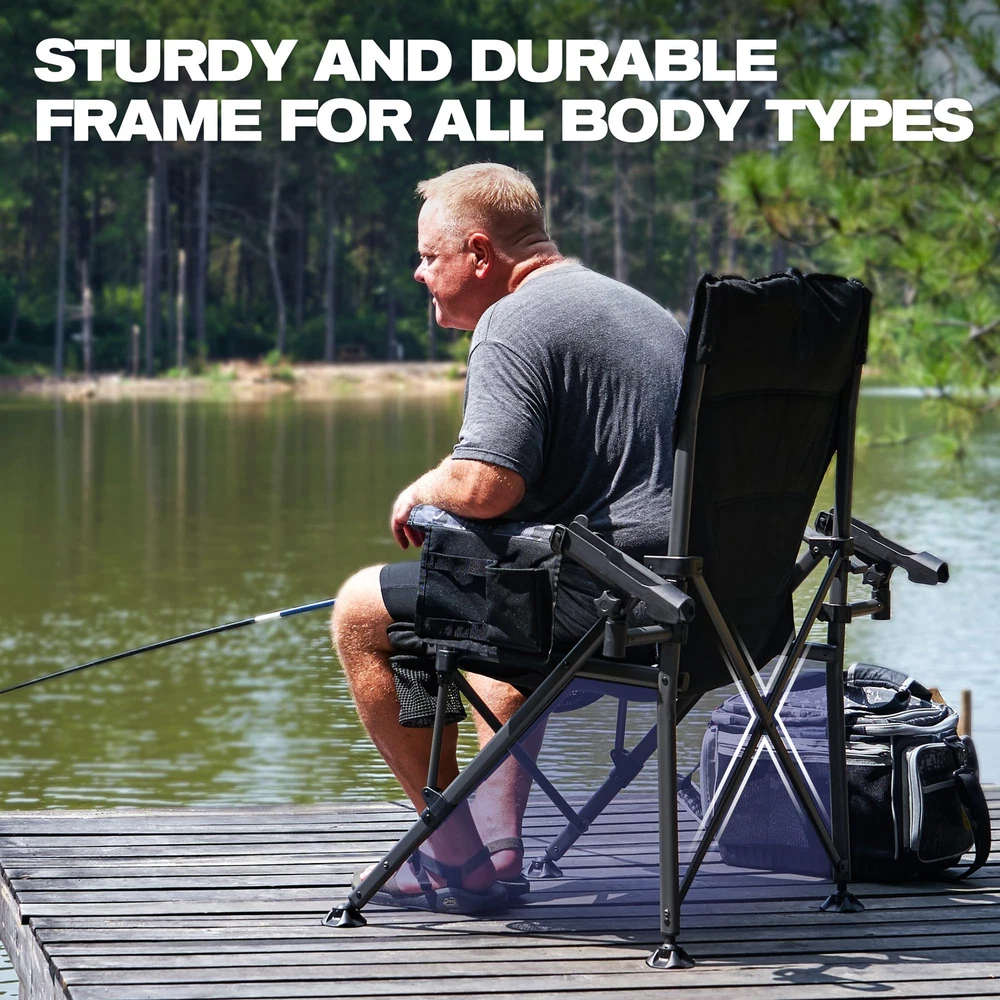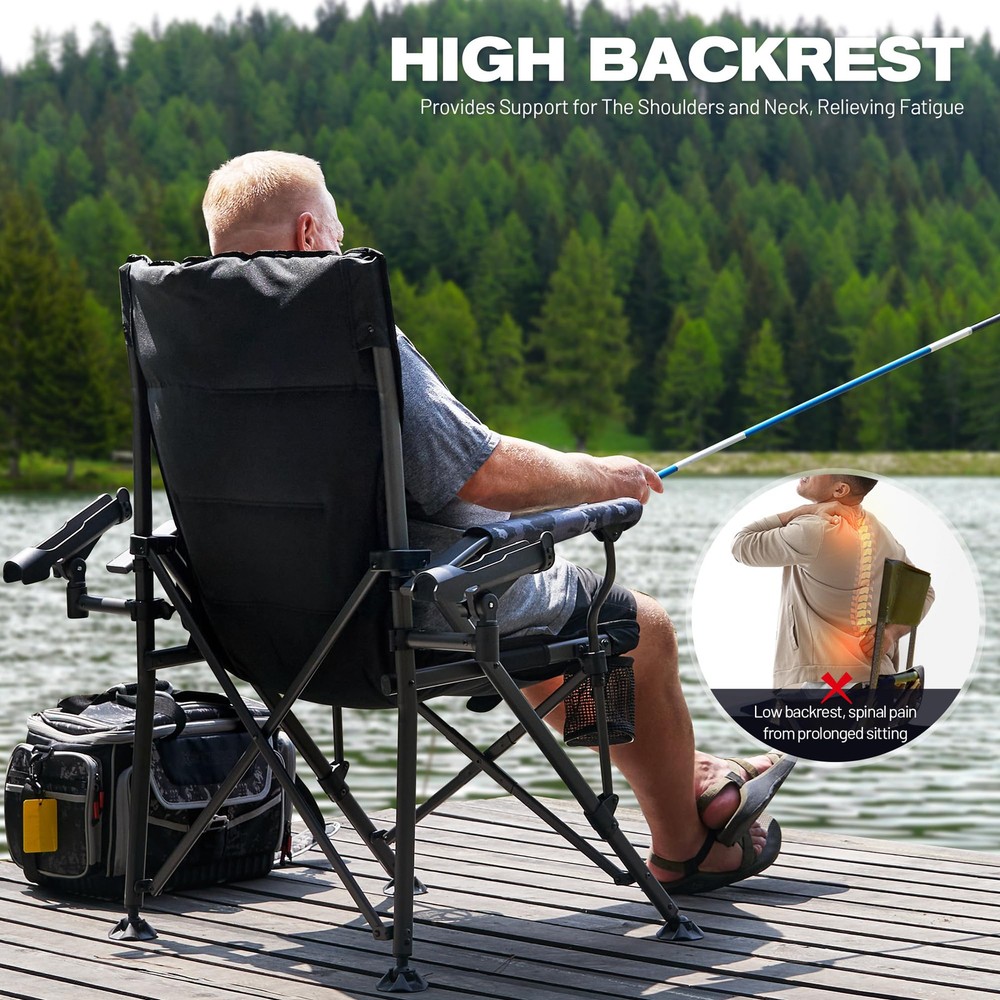 OVERSIZE FISHING CHAIR: Our new large-size fishing folding chair is made of durable 500D polyester dyed fabric, capable of supporting up to 350 lbs. It features a high backrest and padding, making it more comfortable than small fishing chairs. It is perfect for camping, fishing, picnics, and other outdoor activities, suitable for most people to use. ALL-TERRAIN ROTATABLE FEET: This fishing chair features rotatable feet that keep it stable on any rugged terrain. It allows you to rotate the feet on the front legs, and the wider chair legs help reduce pressure and prevent the chair from sinking into soft ground. It can be easily applied to any terrain, allowing you to enjoy fishing in wetlands, glaciers, valleys, and more. ADJUSTABLE ROD HOLDER: Our folding fishing chair is equipped with removable rod holders on both sides, which can be adjusted up and down, as well as left and right, without moving the chair. You can adjust the height of the fishing rod as needed, freeing your hands to do other things, allowing you to focus more on fishing. EXTRA STORAGE SPACE: The fishing chair features durable mesh cup holders on both sides for conveniently placing drinks or equipment. It also has a black storage bag on the side that can hold all your fishing tools and accessories, such as pliers, scissors, and other tools, providing maximum convenience during your fishing experience. MULTIPURPOSE OUTDOOR FOLDING CHAIR: This chair is specifically designed as a professional fishing chair, catering to various fishing needs. In addition, it can be widely used for camping, picnics, outdoor patios, balconies, lawns, backyards, gardens, and any other outdoor activities. No matter where you are, you can sit down and rest your tired body.