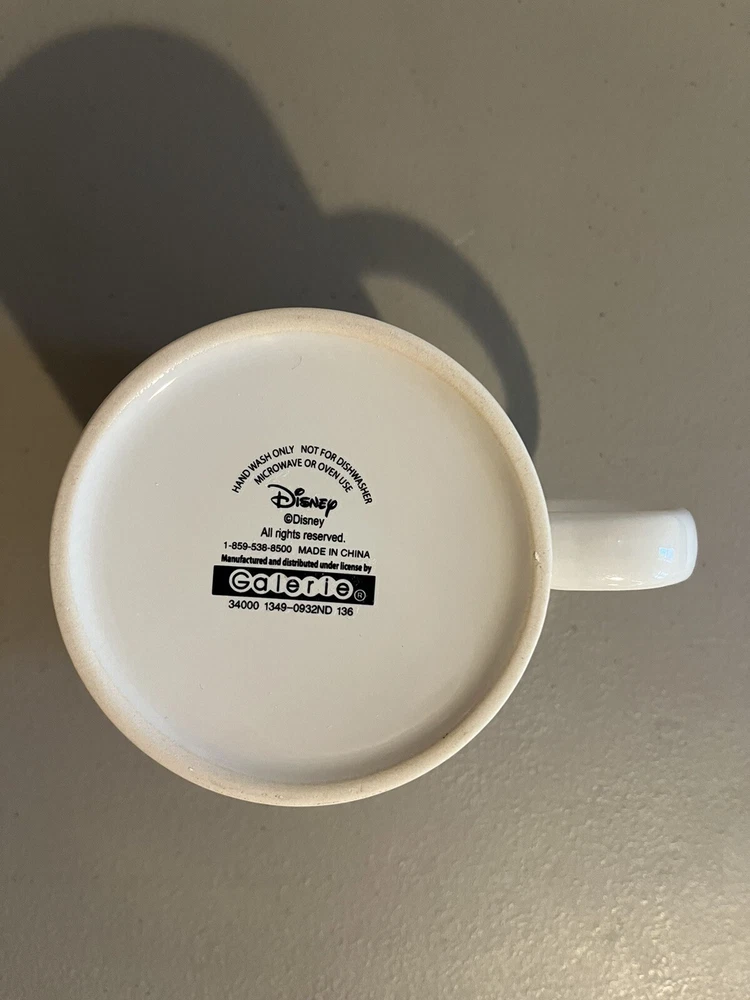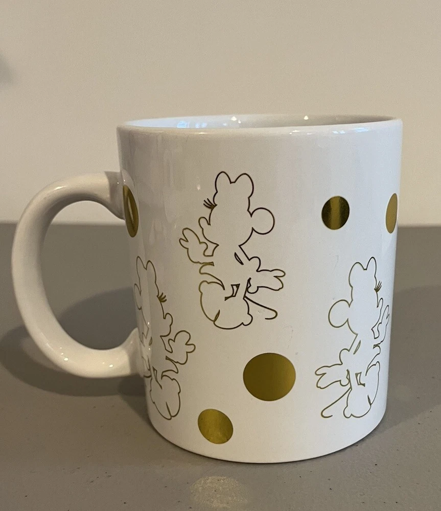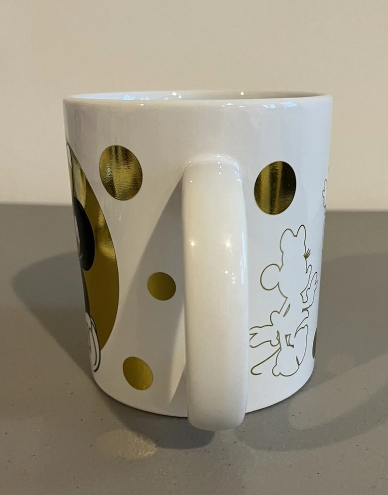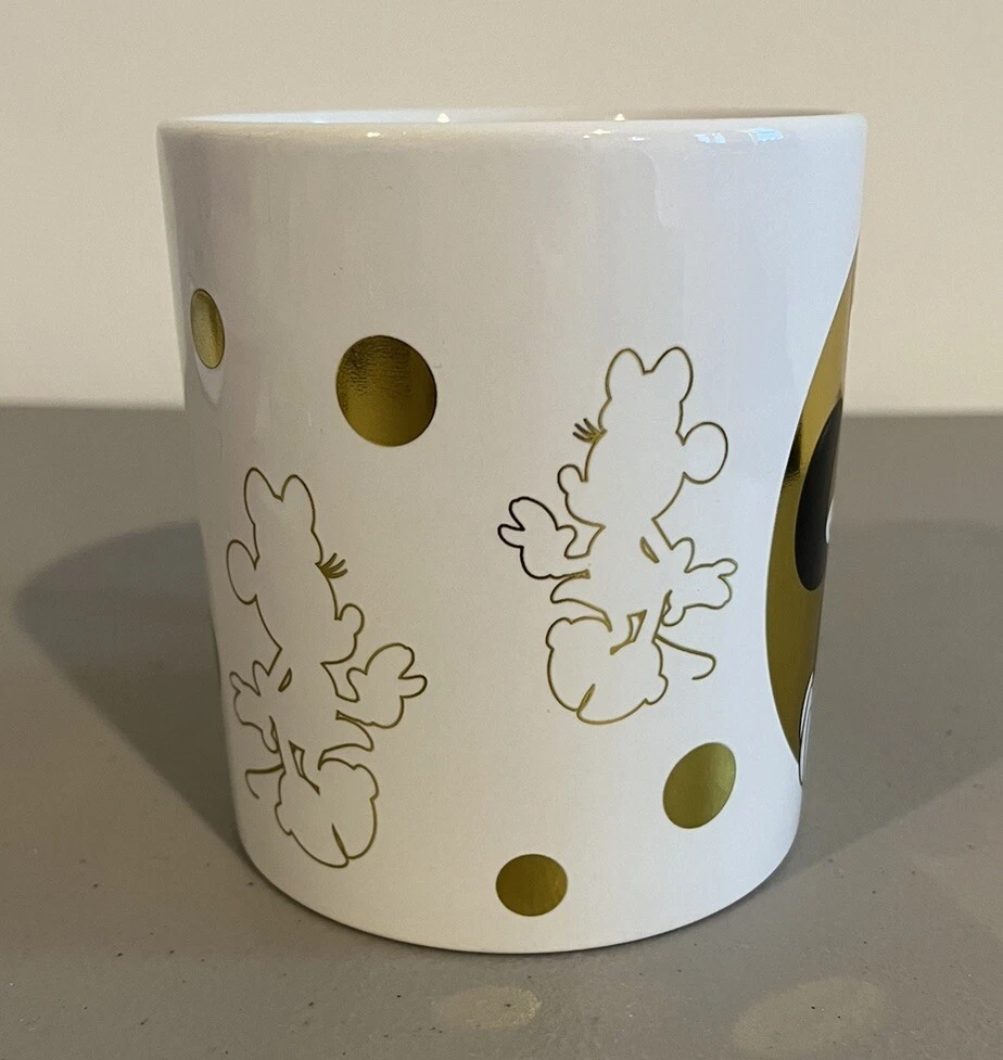 This oversized coffee mug features Minnie Mouse in a playful polka dot design on a white and gold background. Made by Disney's Galerie, this mug is a must-have for any Disneyana collector or Minnie Mouse fan. It is made in China and is an official Disney franchise product. Perfect for morning coffee or as a decorative piece on a shelf, this mug is sure to bring a smile to any Disney lover's face.