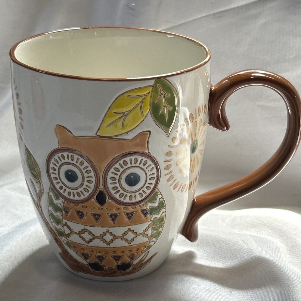 The Owl Cup Mug is a colorful and charming coffee or tea mug featuring an owl design with branch and leaves accents. Made of ceramic and or porcelain, this 16 oz. mug is perfect for all occasions and hot beverages. The multicolor pattern and animal-themed design make it a fun and unique addition to any kitchen or home decor. This round mug is a personal favorite for those who appreciate cute and whimsical items in their collection. Does have one very small chip on bottom as seen in pictures!