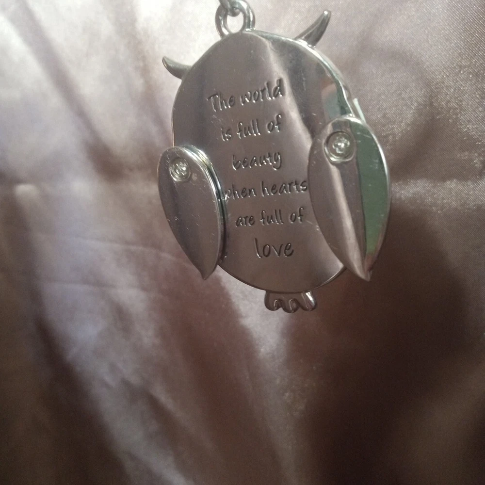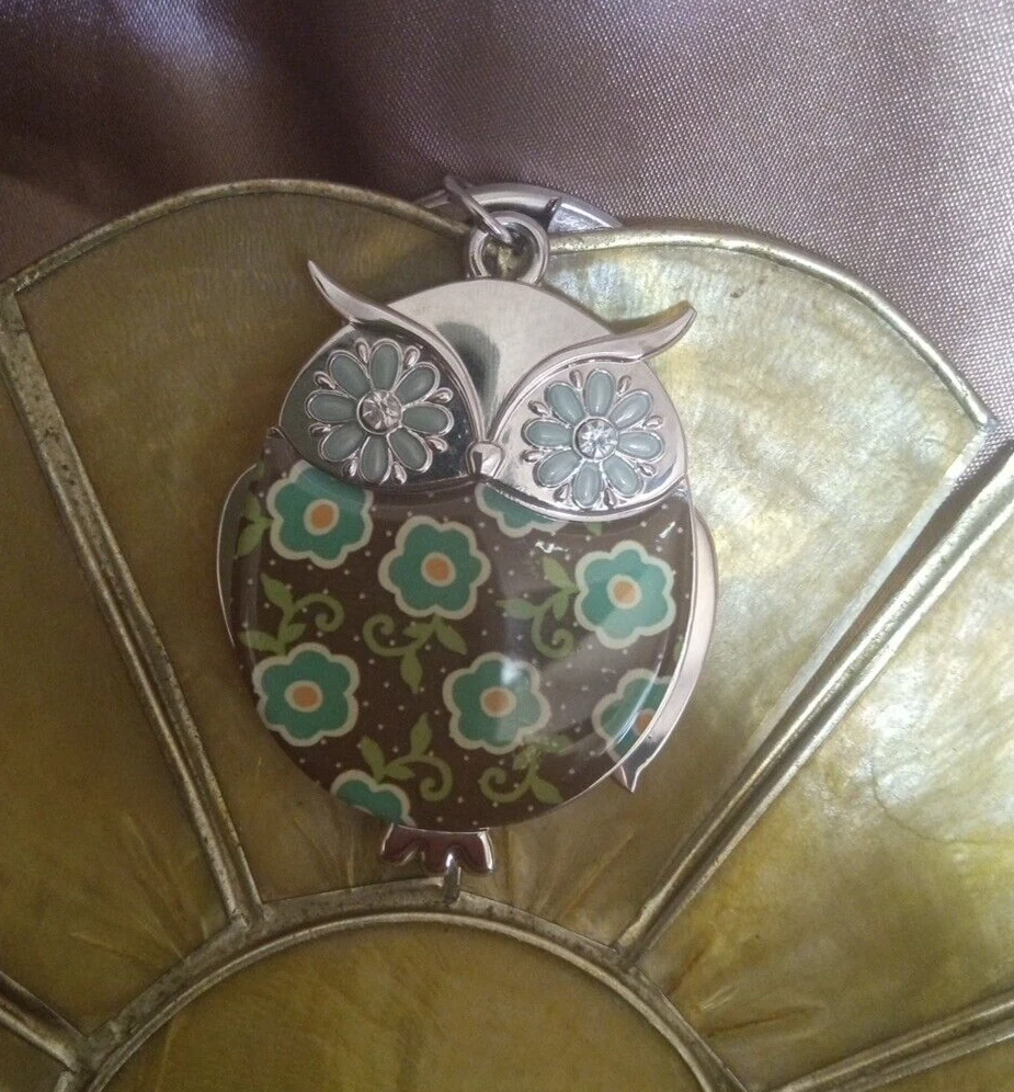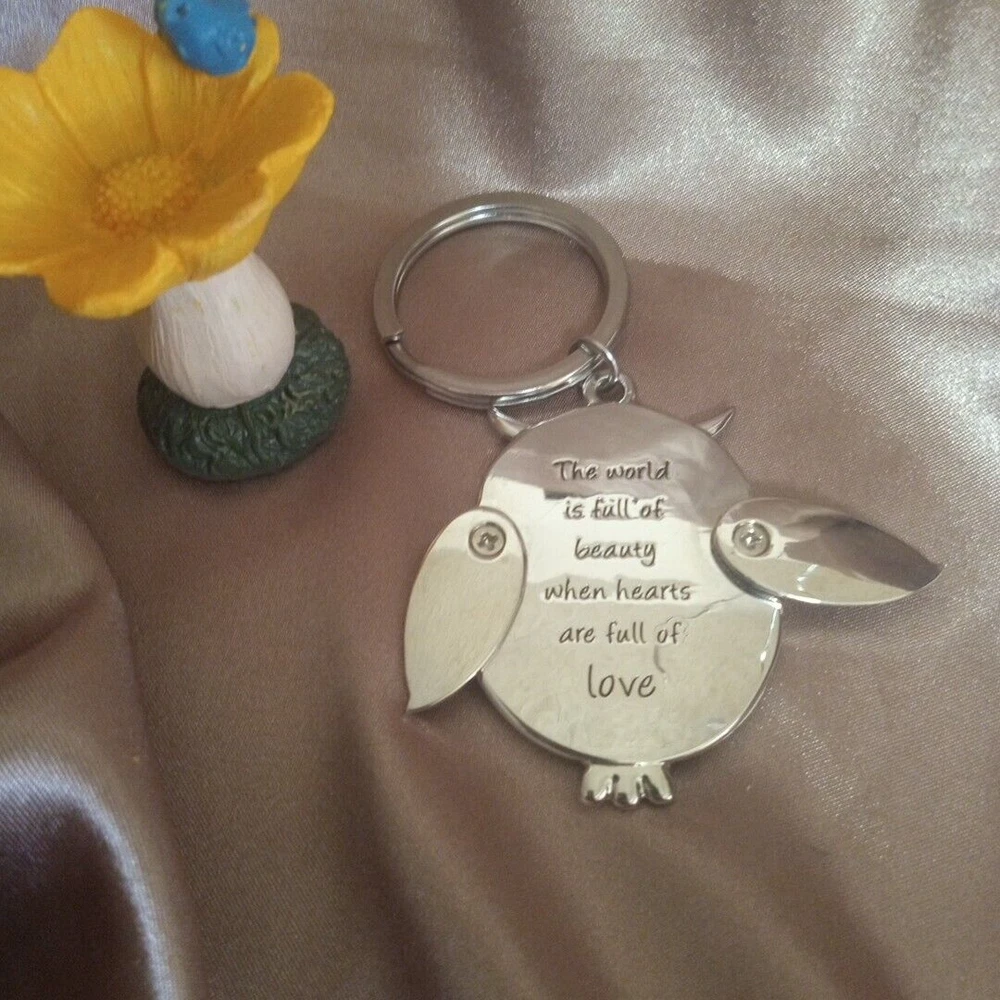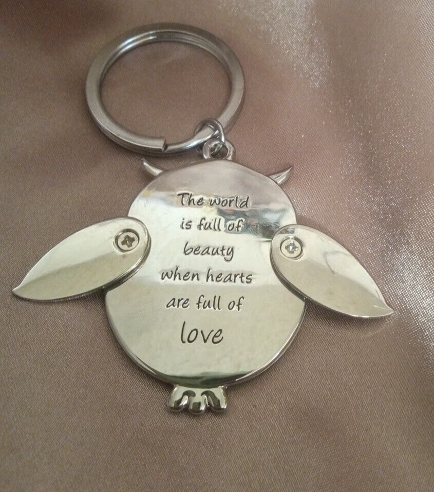 This adorable owl is brown and silver with green and yellow flowers. It has flower shaped eyes with rhinestones in the centers. On the back it says The world is full of beauty when hearts are full of love. AND it is on a heavy duty key ring. Please carefully review the pictures for the best description and contact us with any questions. Check out our store for great items that light up or beep, shoes, clothing, toys, home goods, and more. Thank you for looking!