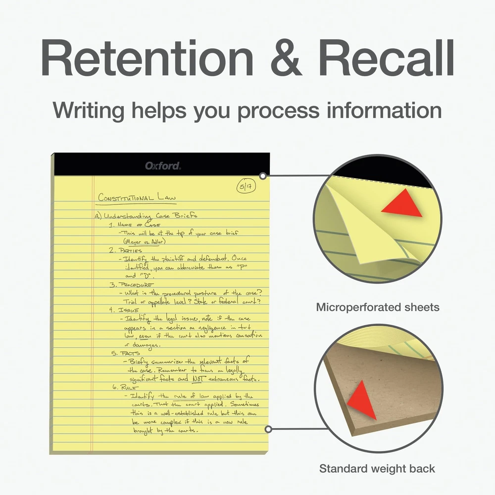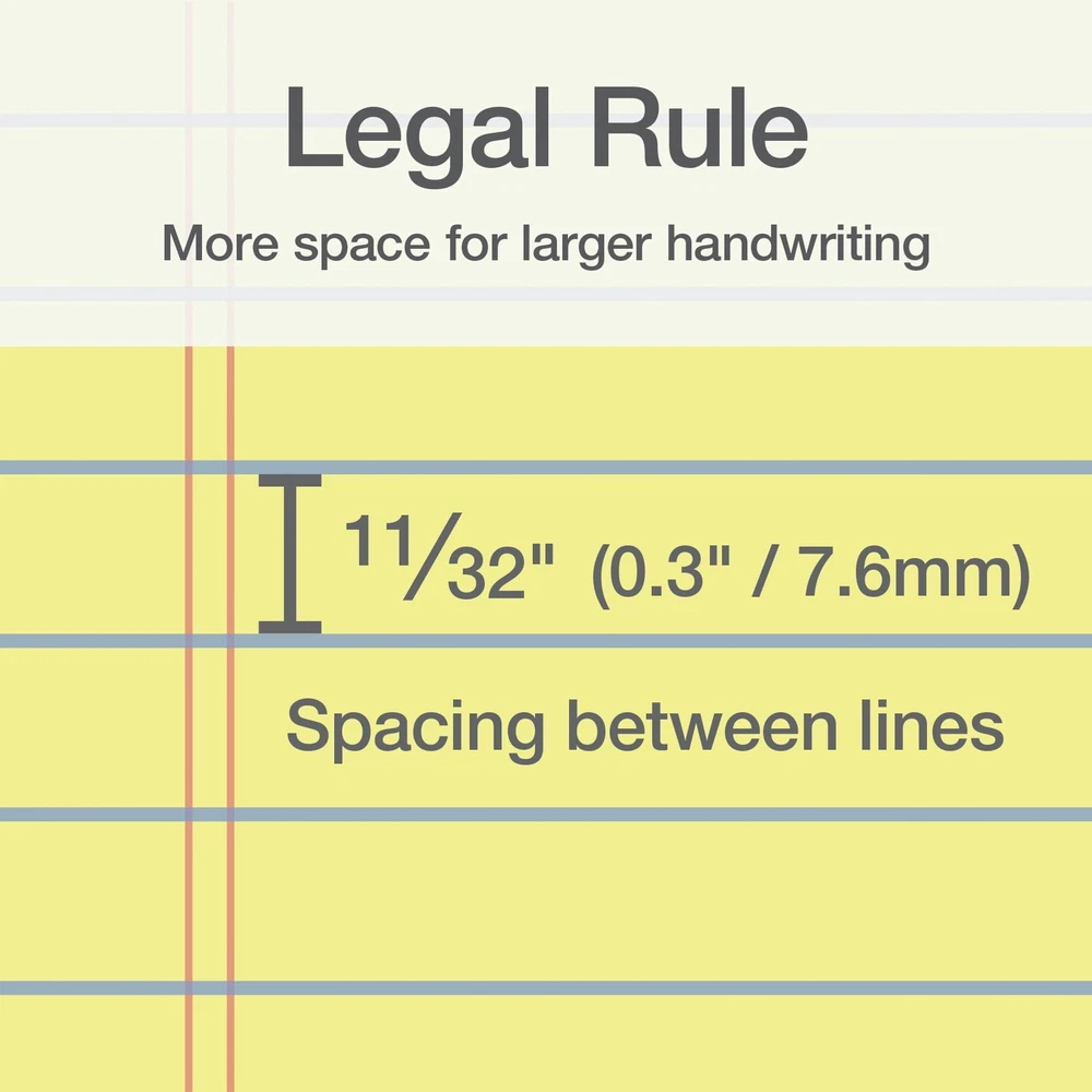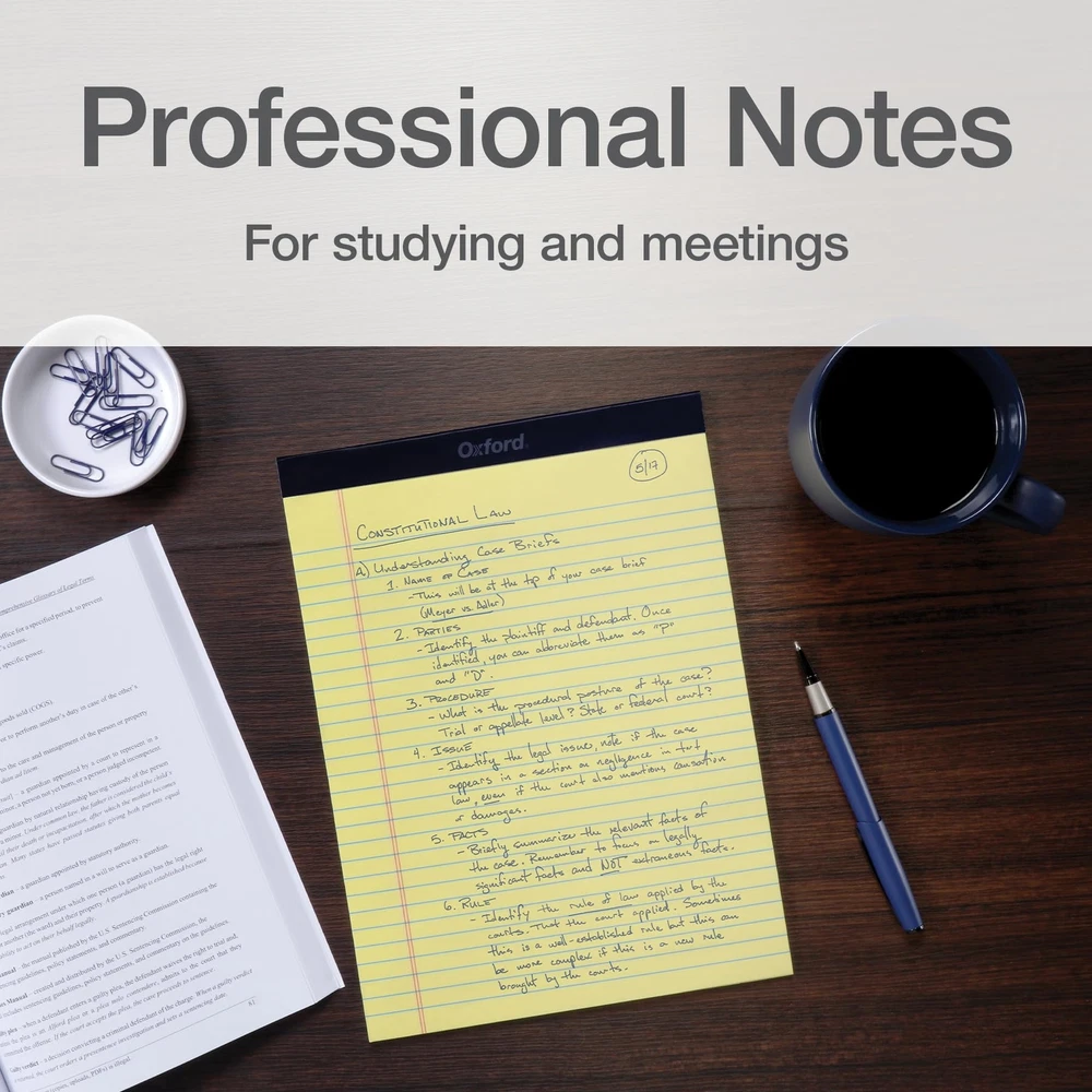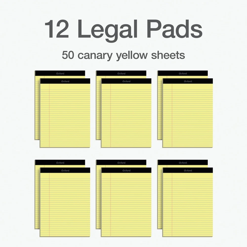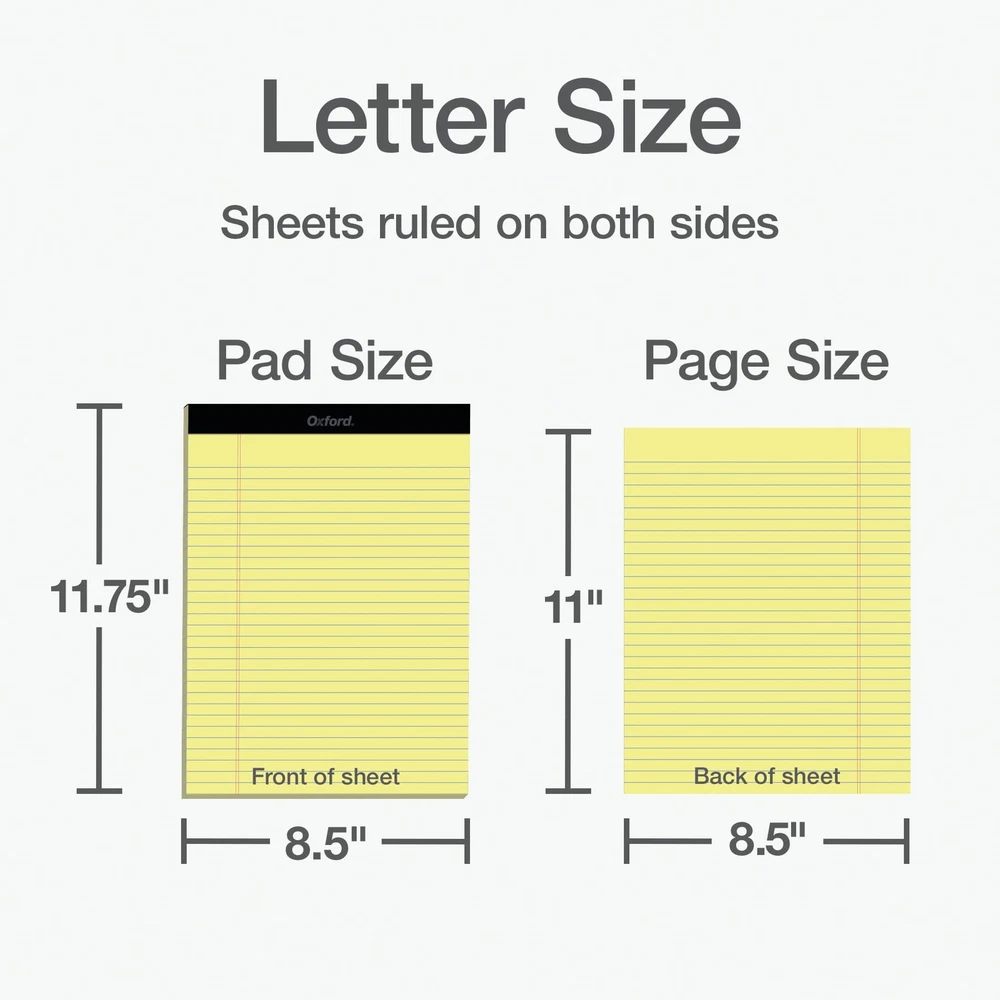 Oxford Legal Pads are made in America—manufactured in Covington, TN. These letter size legal pad 12 packs are great for law school notes, meeting notes, creative notes, long to do lists, and more. Each notepad has 50 perforated sheets of canary yellow paper, so you can always remove it cleanly and start notes on the next page. Yellow paper is less straining to your eyes, making these an optimal choice for power users. These yellow legal pads are wide ruled on both sides. Wide rule is also known as legal rule and provides 11/32" or 0.3" between lines so you can write a little larger. Each legal pad is 8.5 x 11.75 inches overall, and each sheet tears out to letter size (8.5 x 11 inches). Stock up on a 12 pack of 8.5 x 11 legal pads; each yellow legal pad has 50 perforated, wide ruled sheets and is ruled on both sides This legal pad pack is great for longer lists, and school and work notes; with more room to write, you won't miss any important details; yellow legal pads can be less straining on your eyes These notepads are proudly made in the USA; all Oxford legal pads are manufactured in Tennessee The overall dimension of each letter size notepad is 8.5" x 11.75"; each perforated sheet tears off to letter size (8.5" x 11"); pages are wide rule for larger, more legible writing The Oxford brand represents lifelong learning; taking notes on these Oxford legal notepads can help you better retain and recall information from the classroom to your career