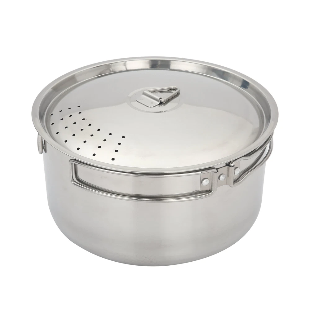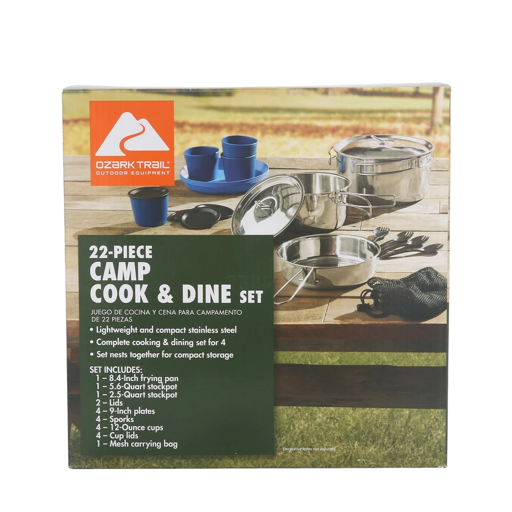 If you enjoy camping, you’re going to really enjoy this 22-piece cook and dine set during your next outdoors adventure. This set made by Ozark Trail, provides 4 place settings and a durable and versatile variety of cookware. Pot and lid are made from non-stick material for easy cleanup. The dinnerware is made from polystyrene and the cook ware is made from sturdy aluminum, promising years of use. The set is also earth-friendly! It comes with it’s own polystyrene flatware and re-usable plastic cups so you won’t need to rely on single-use alternatives. When you’re done eating, just clean it and pack it all up in a mesh carrying bag for easy transport. This lightweight and compact stainless-steel collection is a complete 4-person dining set. The Ozark Trail Cook and Eat Set Features: 1 - 8.4 inch frying pan, 1 - 5.6 Quart stockpot, 1 - 2.5 Quart stockpot, 2 Lids, 4 - 9inch plates, 4 Sporks, 4- 12 ounce plastic cups, 4- plastic cup lids and 1 Mesh carrying bag. Weighs 4.2 lbs. SPACE SAVER- Entire set easily packs into a mesh carrying bag for easy set up and break down for easy storage. WON'T STICK- The silver-colored pots feature a non-stick coating that will make clean-up effortless DURABLE- Cookware is made from stainless steel and are sure to be a camping companion for years to come LETS GO CAMPING- Great option for campers to use when looking to travel light, but still have a variety of cook & dine ware available. Set weighs 4.2 lbs. The polystyrene dine ware is dishwasher safe, but the cook ware must be hand washed. 22 Pieces
