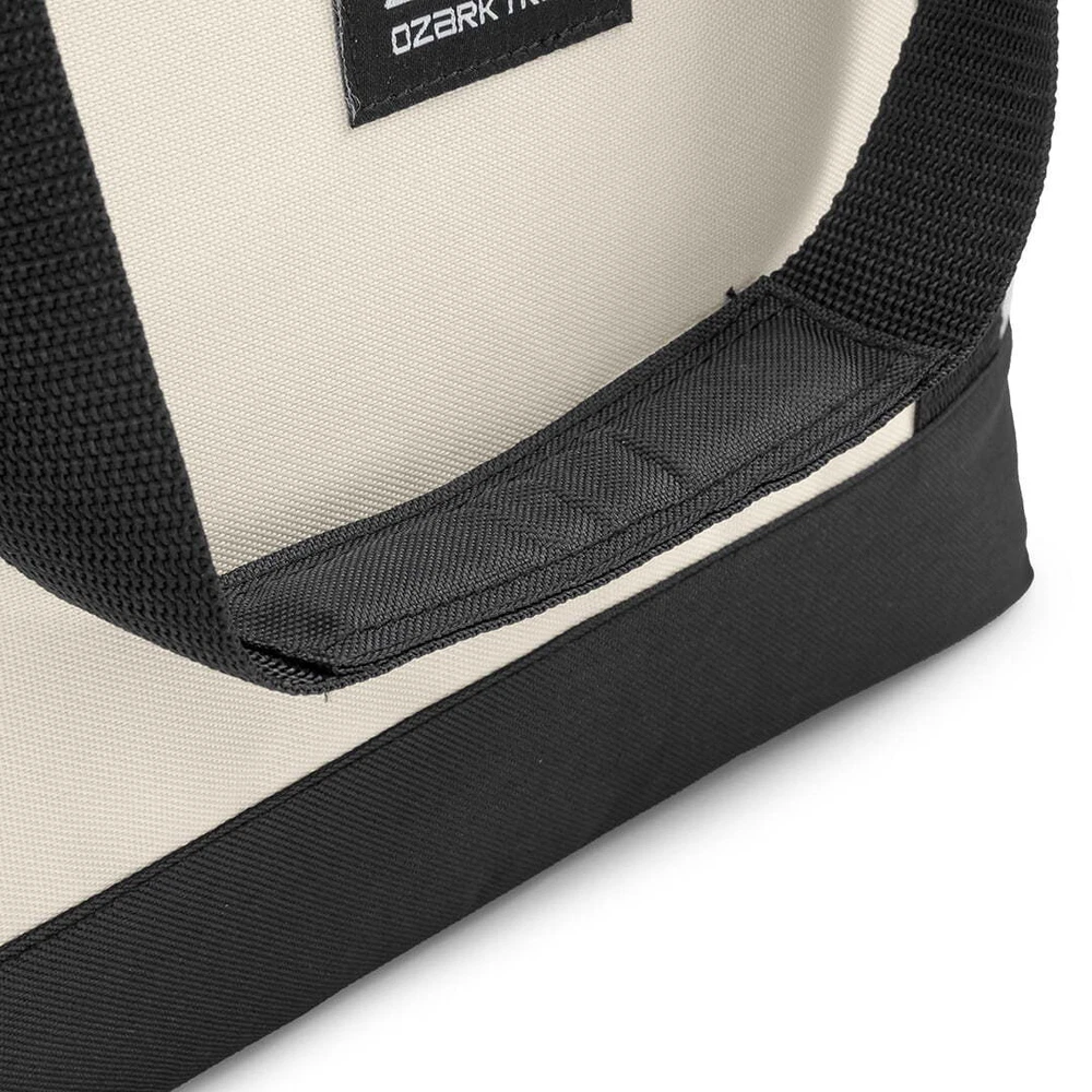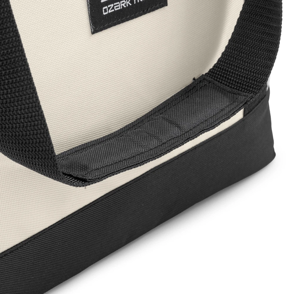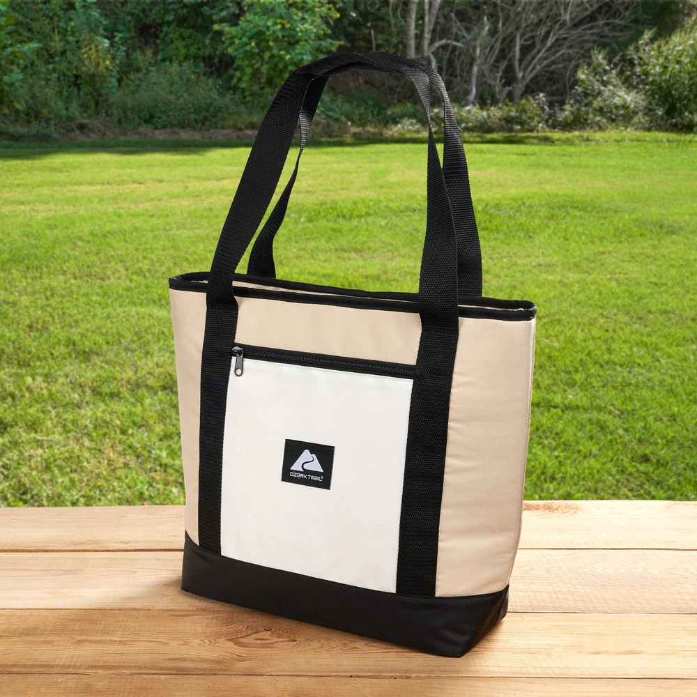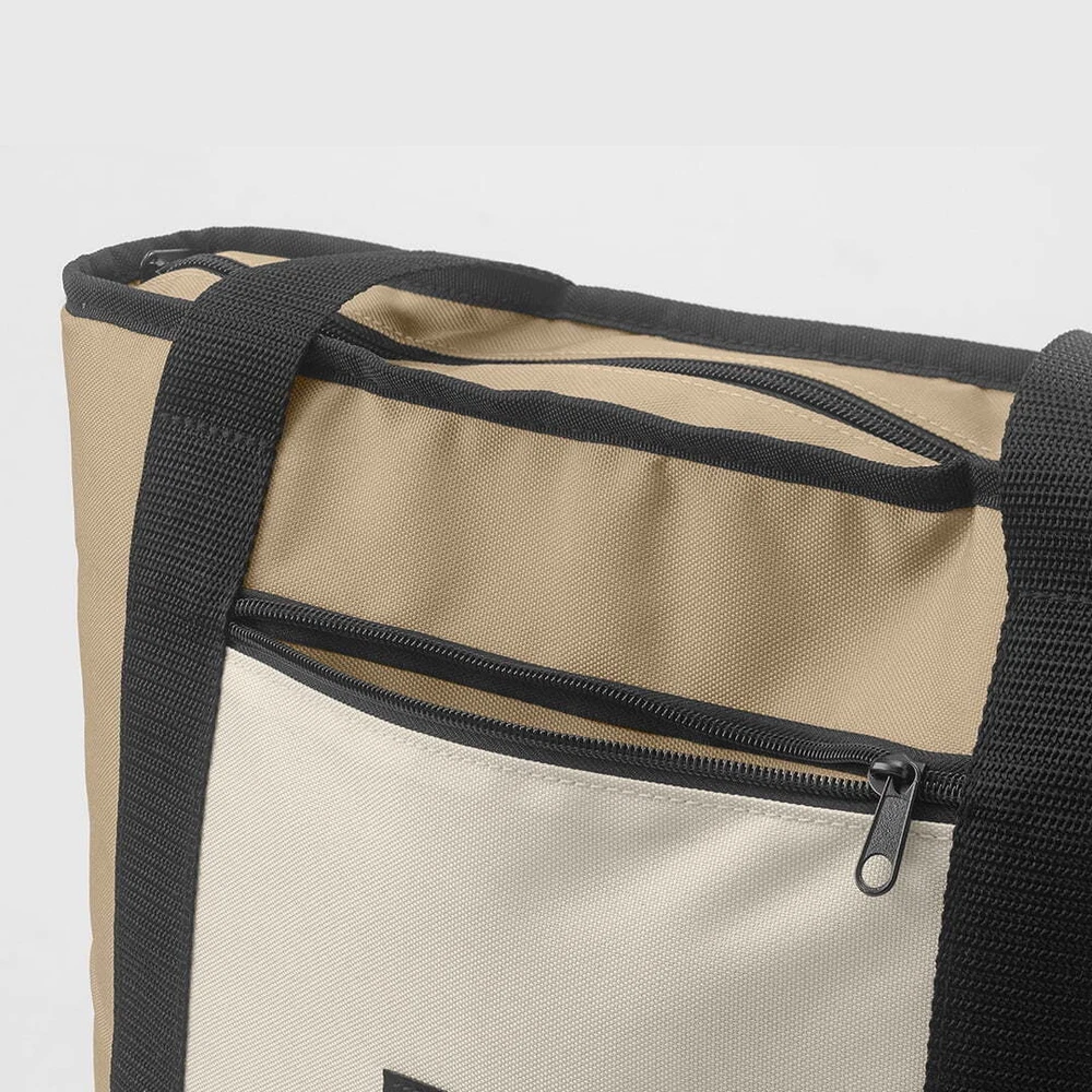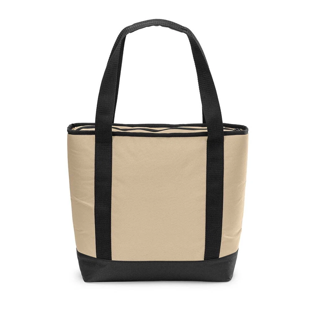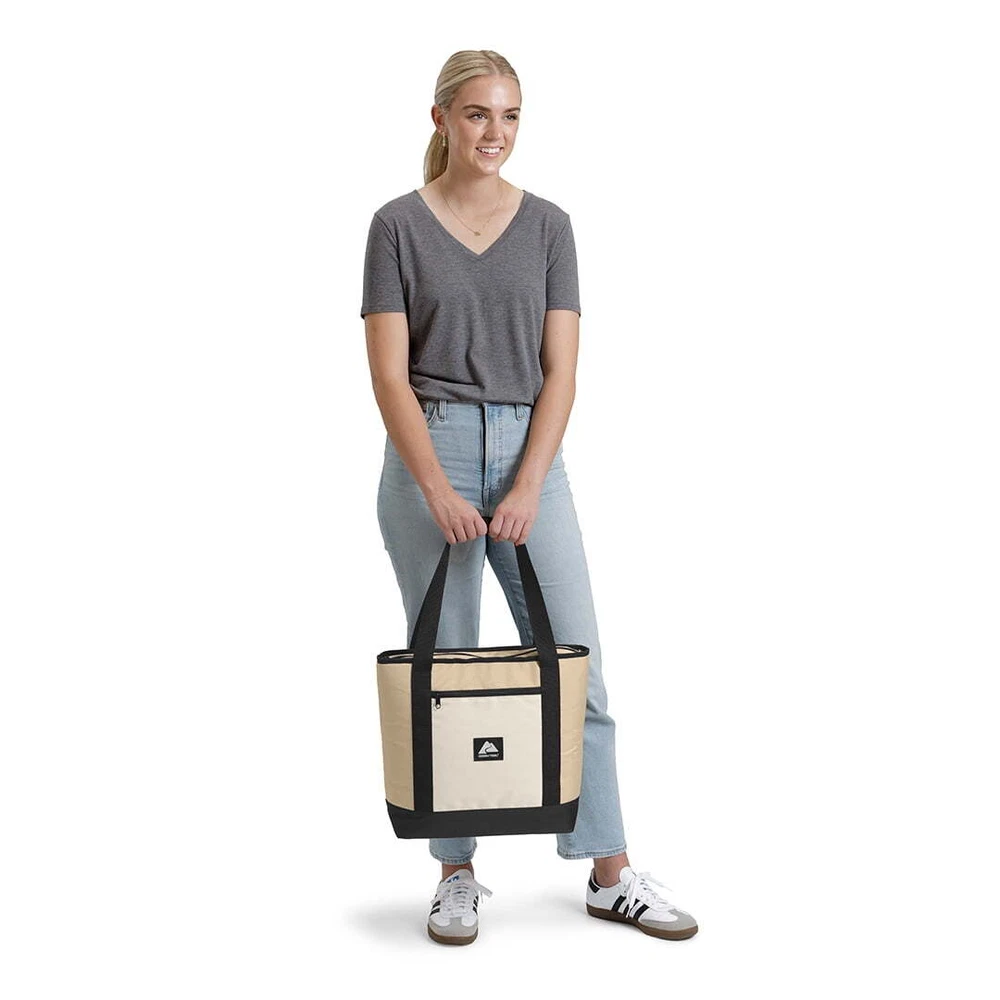 Keep your food and beverages cool with this soft-sided, 14.8 quart with 24 can capacity, Tote Cooler. This tote cooler keeps ice for up to 12 hours. The tote cooler is made with premium polyester outer fabric with nylon zipper closures. The perfect bag for the grocery store, camping and other outdoor adventures, sport events and tailgating. This tote cooler features an insulated main compartment with an easy-to-use top zipper and a front zippered pocket perfect for small snacks, your phone, sunscreen and keys. The leakproof interior has an easy clean PEVA lining with foam insulation. The dual-padded handle straps make this a comfortable to carry accessory for your next adventure. When not in use, this tote packs down flat for easy storage. Fits 24 cans 14.8 quart capacity Ice retention up to 12 hours Polyester outer shell fabric Nylon zipper closures Padded shoulder straps for comfortable carry Leakproof interior with easy clean PEVA lining Front accessory pocket Packs down flat for easy storage Product dimensions: 13.1” x 5.5” x 13.9” Available colors: Pink, Tan