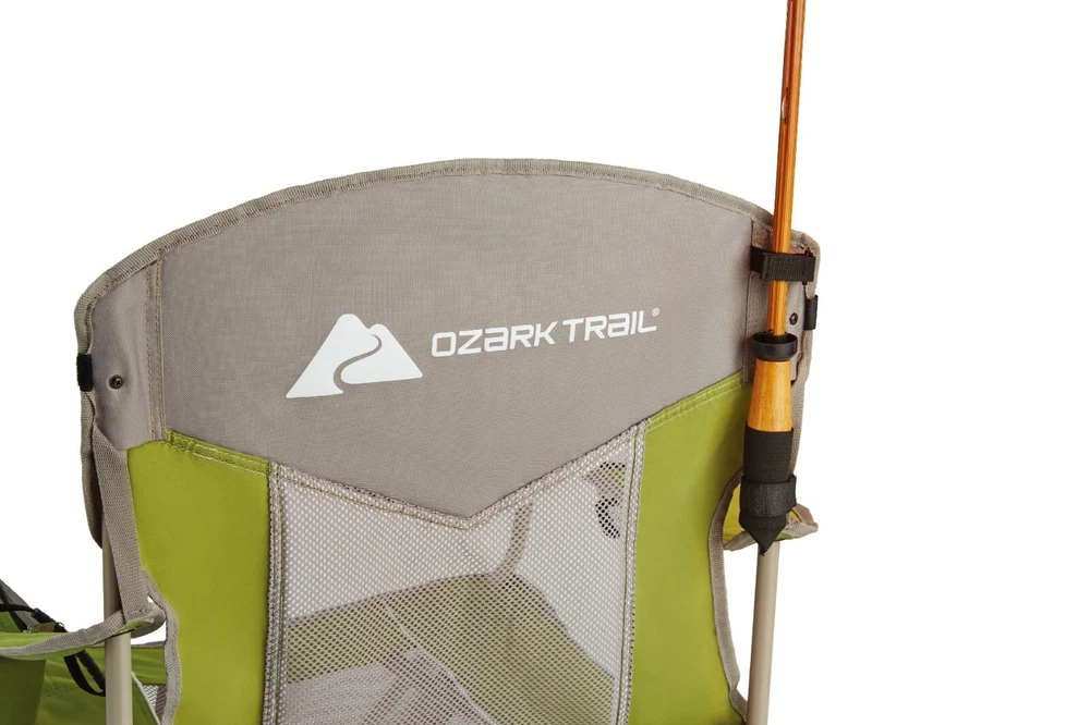 Ozark Trail Adult Oversized Mesh Camp Chair with Cooler, Green / Basil Leaf Product details Enjoy the ultimate comfort experience in the Ozark Trail Oversized Mesh Camp Chair with Cooler. The integrated breathable mesh will keep you cool on warmer days. To cool you off on those hot days, the chair features a built-in cupholder and a three can insulated cooler with a dual zipper and attached aluminum bottle opener. The durable power-coated steel frame has a 400-pound weight capacity for adults. With a built-in universal umbrella holder, you can seek shade and stay dry from the rain. The chair collapses to a stand-alone position and features two built-in carry straps for easy transport with or without the carry bag. The Ozark Trail Oversized Mesh Chair with Cooler is the perfect chair for any camping trip, concert, sporting event or just to have at home on your patio! Adventure is where memories are made, whether it's campouts in the back yard with the kids, Saturdays at the river with friends, or a week in the wilderness alone. Ozark Trail helps you and your family create everyday adventures with gear and accessories built with you in mind. From backpacks to tents, they're rugged, dependable, and priced to be practical. Because adventure is not a destination; it's a lifestyle. Ozark Trail Adult Oversized Mesh Camp Chair with Cooler, Green & Gray Built-in carry strap folds the chair quickly for fast and easy transportation Durable power-coated steel frame with built-in mesh cup holder Adult Weight capacity: 400lbs Built-in universal umbrella holder Integrated aluminum bottle opener Includes carry bag with carry strap 6.9 lbs Dimensions: 36in x 23in x 38in