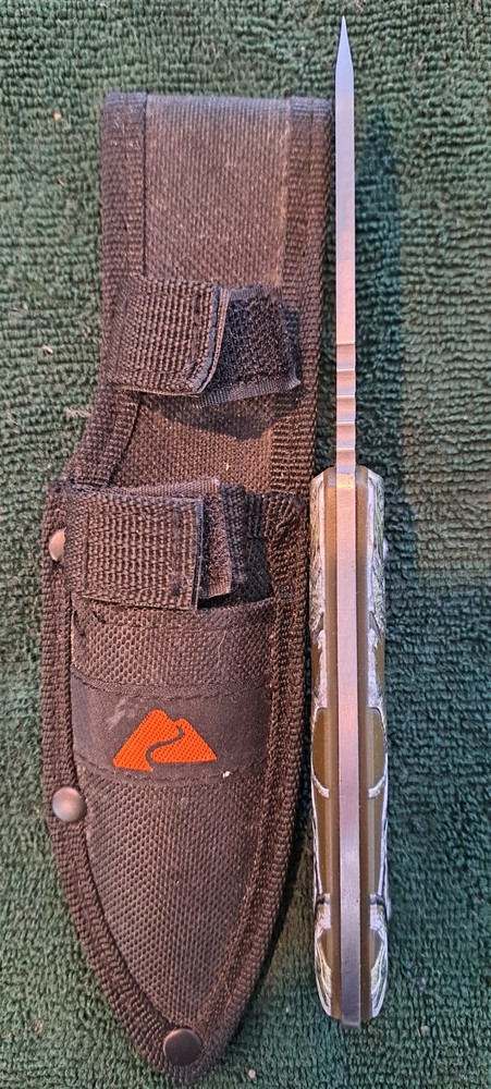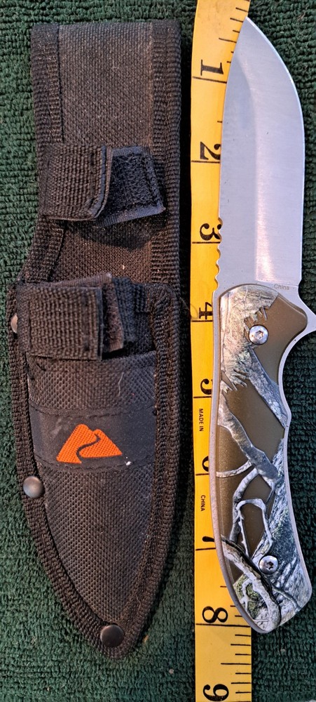 The Ozark Trail fixed blade knife is a modern factory-manufactured collectible. It falls under the category of knives, swords, and blades, specifically in the subcategory of collectible fixed blade knives. This knife offers a sturdy fixed blade design suitable for various outdoor activities and tasks. Mossy oak handles. Good skinning knife with sheath