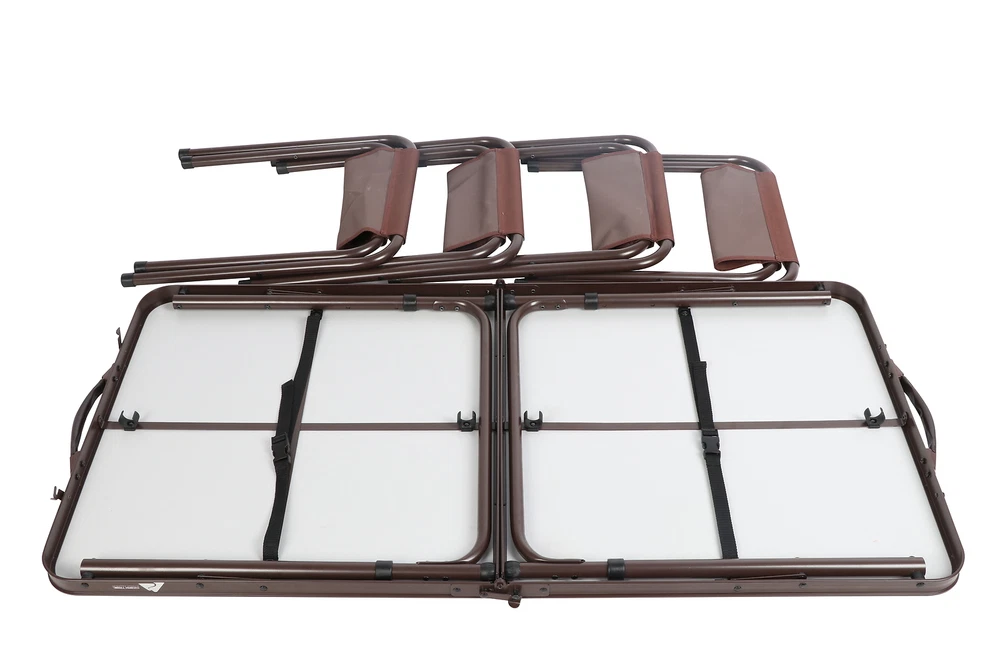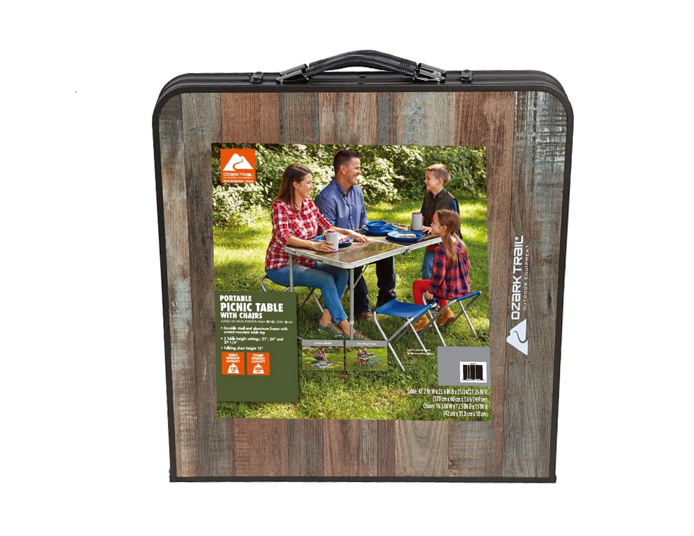 Product details Keep a portable and durable table and chairs handy on your next campout or backyard party with the Ozark Trail Durable Steel and Aluminum Table Set with Stools. The table has a heat-resistant and easy-to-clean MDF table top, while the steel legs on the table and chairs are coated for resistance to chips, scratches, and corrosion. Sit and comfort on the stools, made with a durable polyester fabric and coated to be water and weather-resistant for season after season of use. The convenient pack and carry design makes it easy to move and put out of the way. Enjoy the great outdoors and great company with the Ozark Trail Durable Steel and Aluminum Table Set with Stools. " Table: 47.2 x 23.6 x 21/ 24/ 27.25 chair: 16.5 x 12.5 x 15" Ozark Trail Camping Table, Brown: Fabric: 600D polyester fabric with PVC coating for weather and moisture resistance Three Table Heights (inches): 21", 24", and 27.25" Table Dimensions (at tallest height): 47.2" x 23.6" x 27.25" Stool Dimensions (inches): 10.6" x 7.8" x 14.1" Table top: Heat-resistant and easy-to-clean MDF table top board in wood grain design Durable steel frame with powder coating for resistance to chips, scratches, and corrosion Convenient pack and carry design for easy moving and storage Weight Capacity (lbs.): Table 110 lbs.; Stool 300 lbs. Specifications Features Foldable, Portable Assembled Product Dimensions (L x W x H) 47.20 x 23.60 x 27.25 Inches On Nov 13, 2024 at 09:43:21 PST, seller added the following information: On Jan 2, 2025 at 18:12:09 PST, seller added the following information: