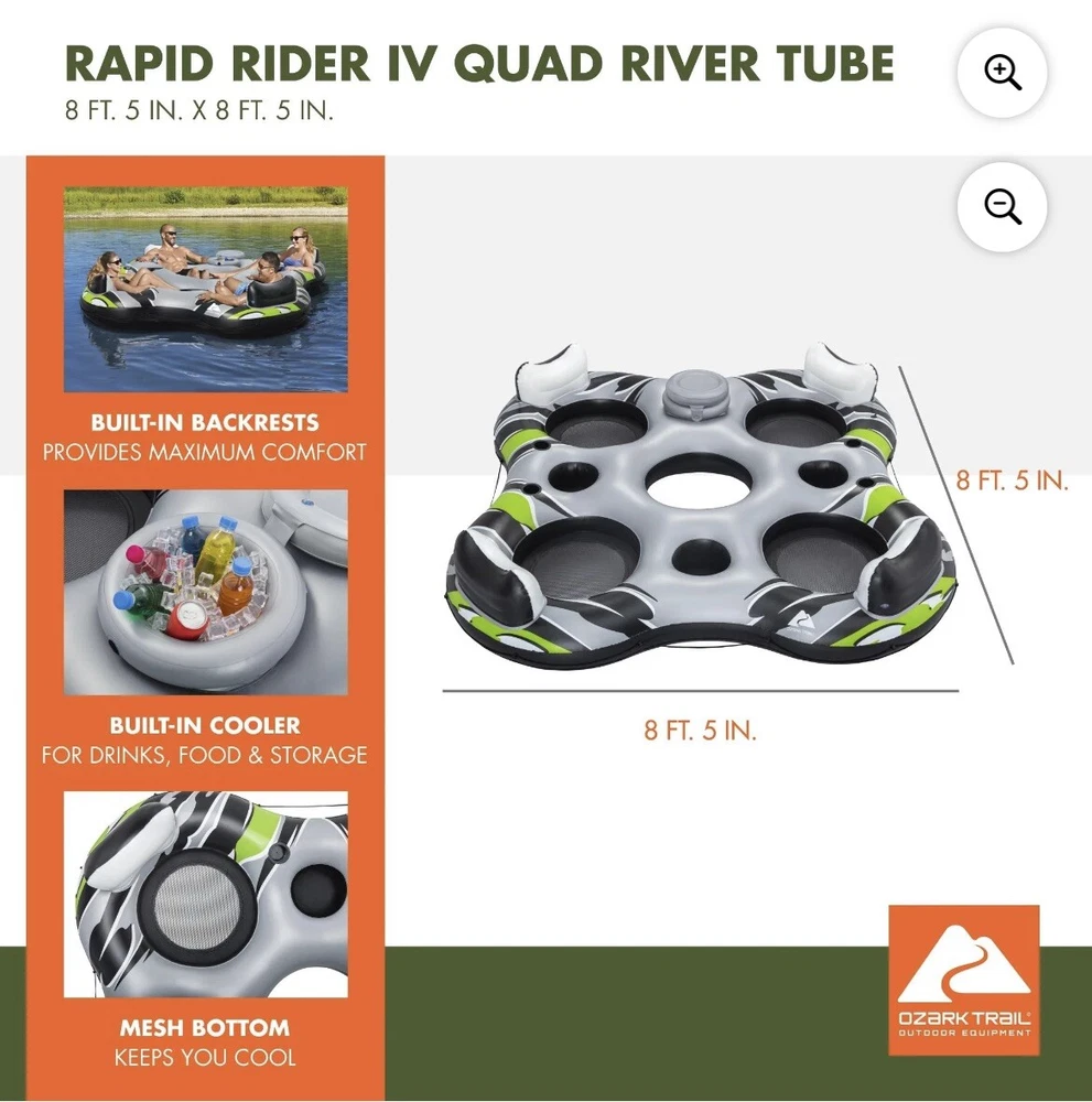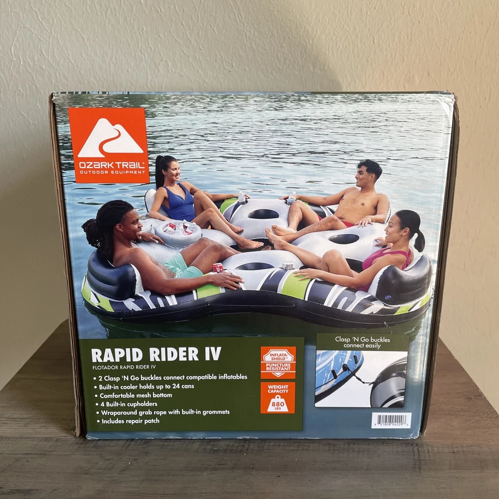 Experience the ultimate fun on the water with the Ozark Trail Rapid Rider IV Quadruple River Tube. This rectangular-shaped tube is designed for quadruple the adventure, with built-in coolers and cupholders to keep your drinks and snacks chilled while you enjoy the ride. Made by Ozark Trail, a trusted brand in outdoor products, this river tube is perfect for kayaking, canoeing, and rafting enthusiasts. With its sturdy construction and ample size, you can invite your friends and family to join you on an unforgettable water adventure. Get ready to ride the rapids in style with the Ozark Trail Rapid Rider IV Quadruple River Tube.