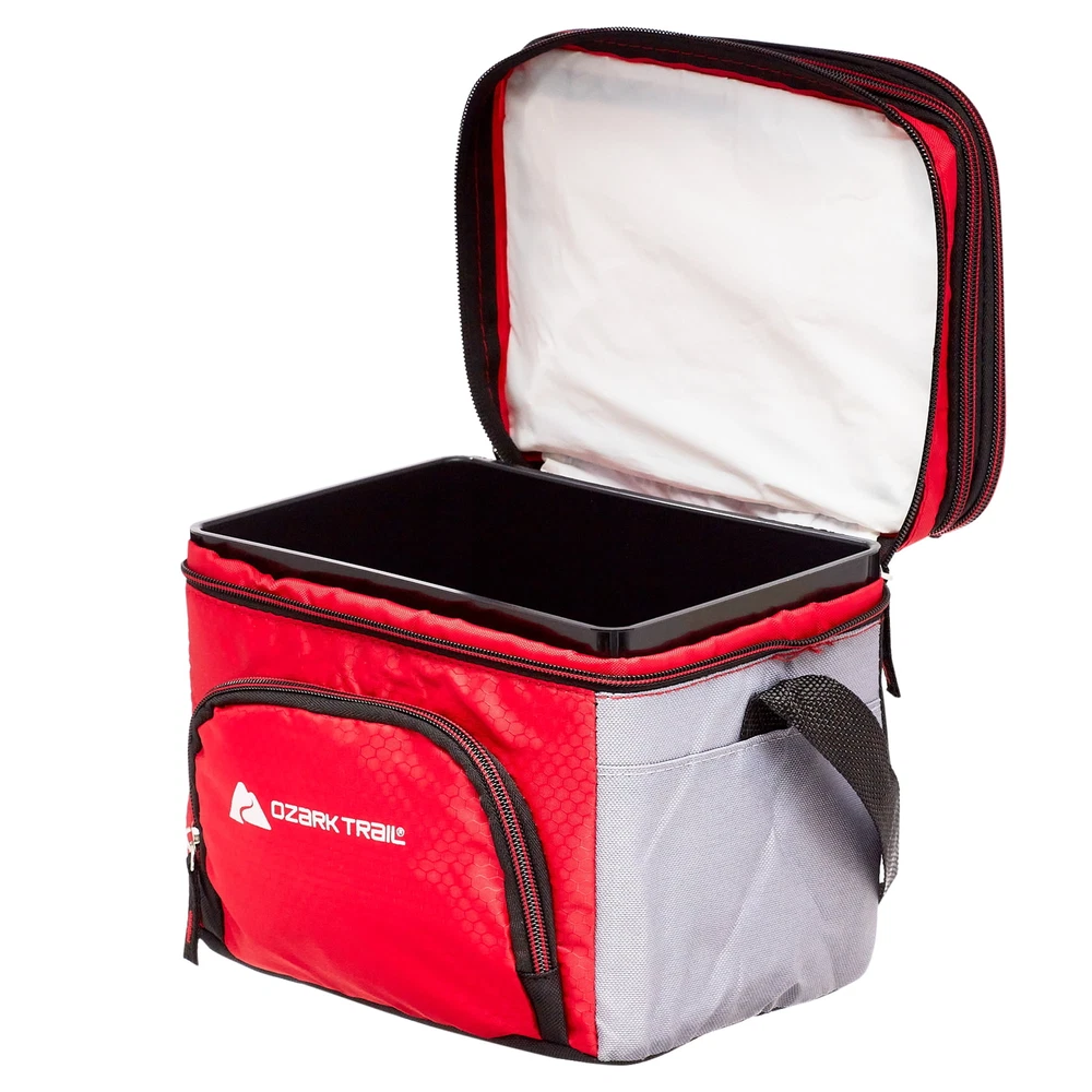 Keep your food and beverages cool with this handy Ozark Trail 6-cans soft-sided cooler with a removable hardliner. It features an easy-to-use front zipper pocket for additional storage. The shoulder strap adjusts to different lengths to make it easy to carry. This cooler also comes equipped with a removable, easy-to-clean hardliner and showcases the Ozark Trail logo on the front. It cans be useful while camping, hiking, tailgating, or spending the day at the beach. Make your next purchase the correct and affordable one. Stock up with this affordable 6 cans cooler today. Adventure is where memories are made, whether it's campouts in the back yard with the kids, Saturdays at the river with friends, or a week in the wilderness alone. Ozark Trail 6 cans Soft Sided Cooler, Red Soft-sided Cooler convenient size allows for 6 cans + ice capacity. 3" Expandable top dry storage compartment. The hard liner cans be easily removed and cleaned. The front zipper pocket is great for storing small accessories. Fully adjustable shoulder strap. Product Dimensions: 9.5"W x 7"D x 8"H