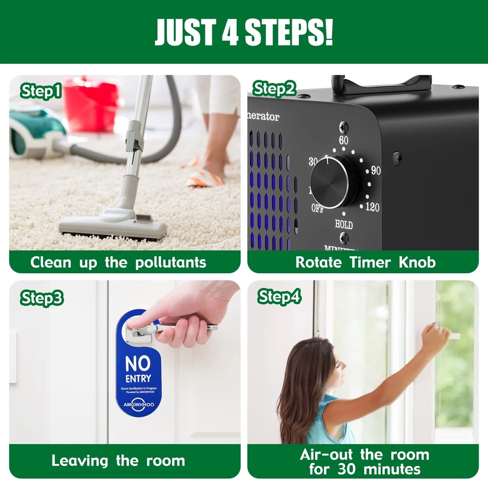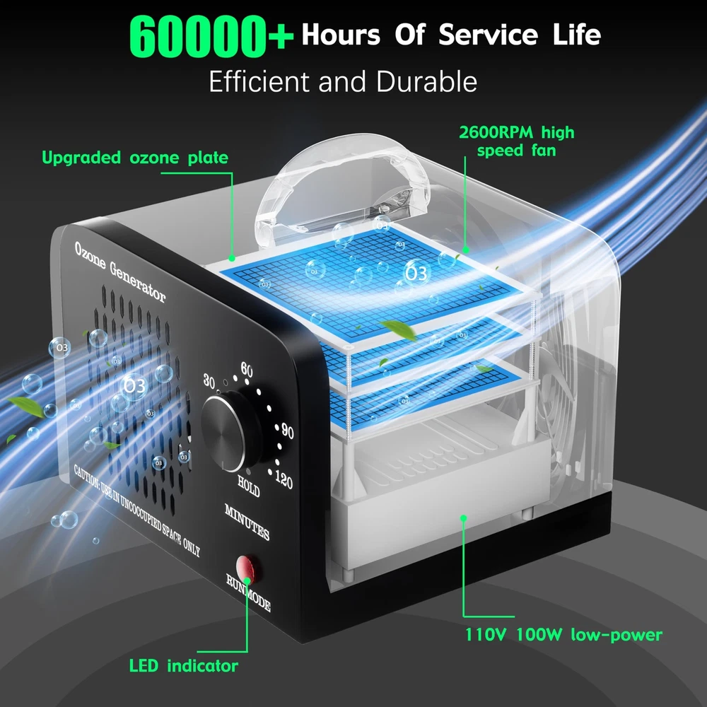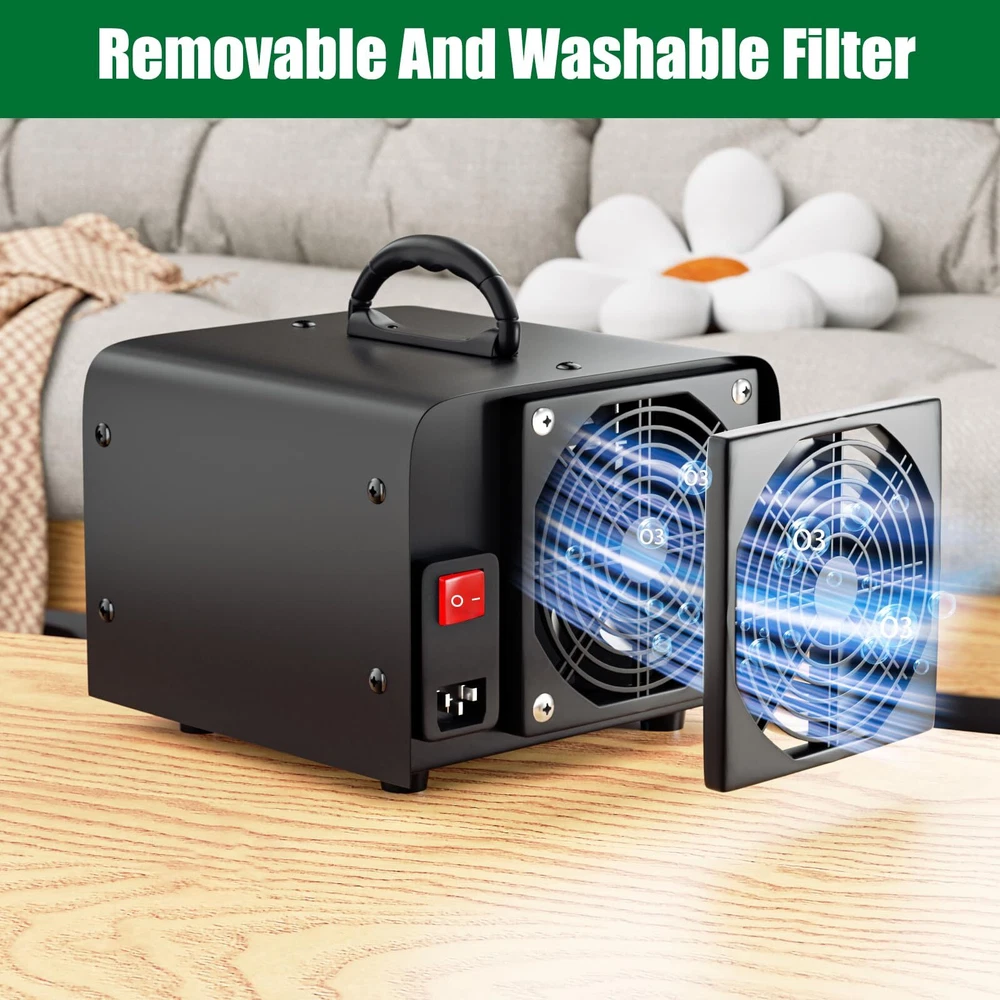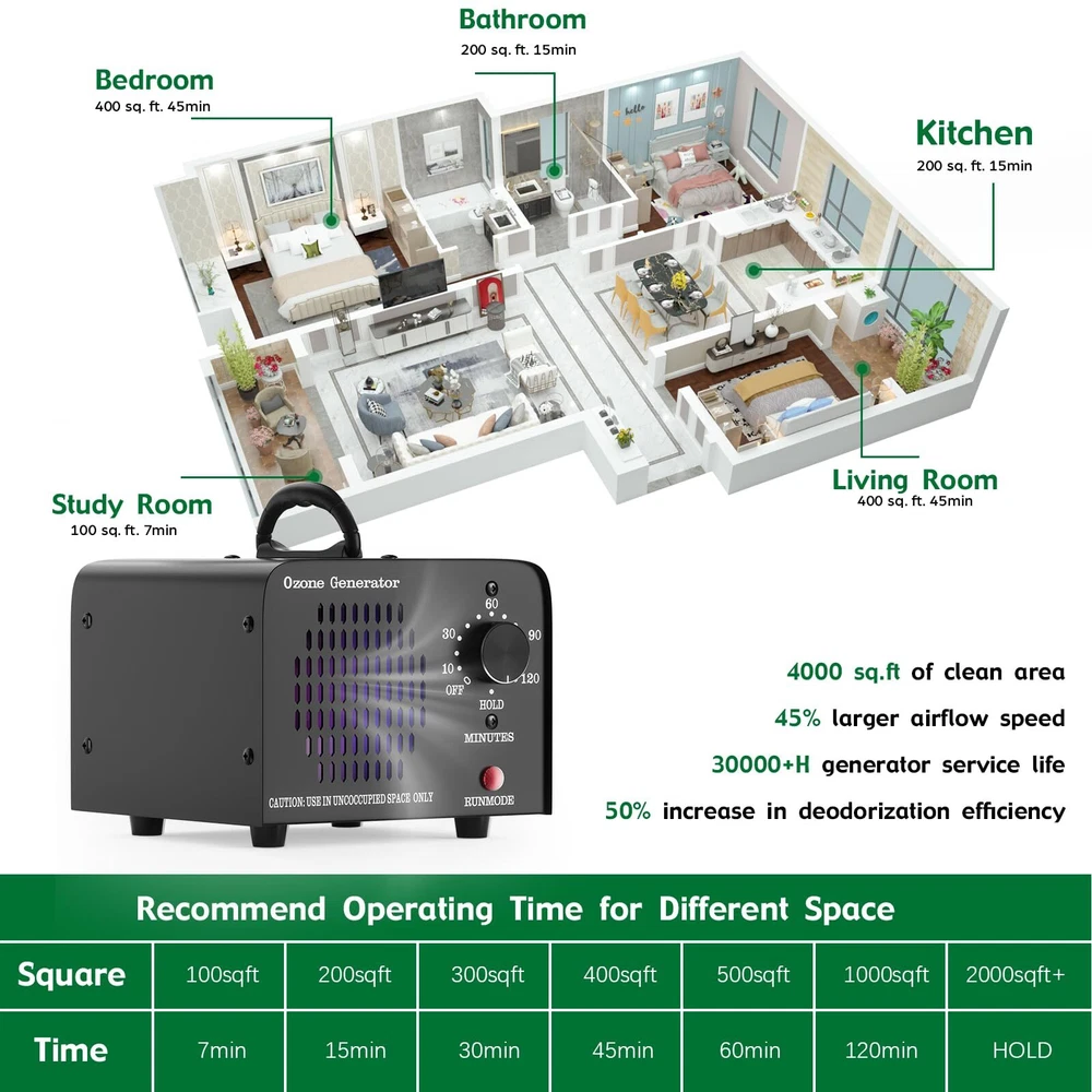 【High Capacity Ozone Machine】Upgraded high capacity ozone generator, it has max output 80,000mg/h, ozone machine odor can cover up to 7,000 square feet of space. And it's made of metal which makes it elegant and sturdy. 【Multi-Application Scenarios】This ozone generator is suitable for several different application scenarios. By using this ozone generator, it'll help you to create a more pleasant and welcome environment. 【Portable Design】Weighs only 4.5 pounds, and comes with a non-slip handle for you to carry around. This is an excellent ozone machine for home, industrial or commercial use. 【Easy to Use】Turn the timer knob to set. The ozone generator is meant to be operated in unoccupied spaces only. Do NOT allow people, pets or plants in the room while the ozone machine is in operation. When ozone generation is finished, please allow another 30 minutes for the residual ozone to completely evaporate. 【High Quality】Up to 35,000 hours of service life and does not require any replacement parts. Not for sale in California.