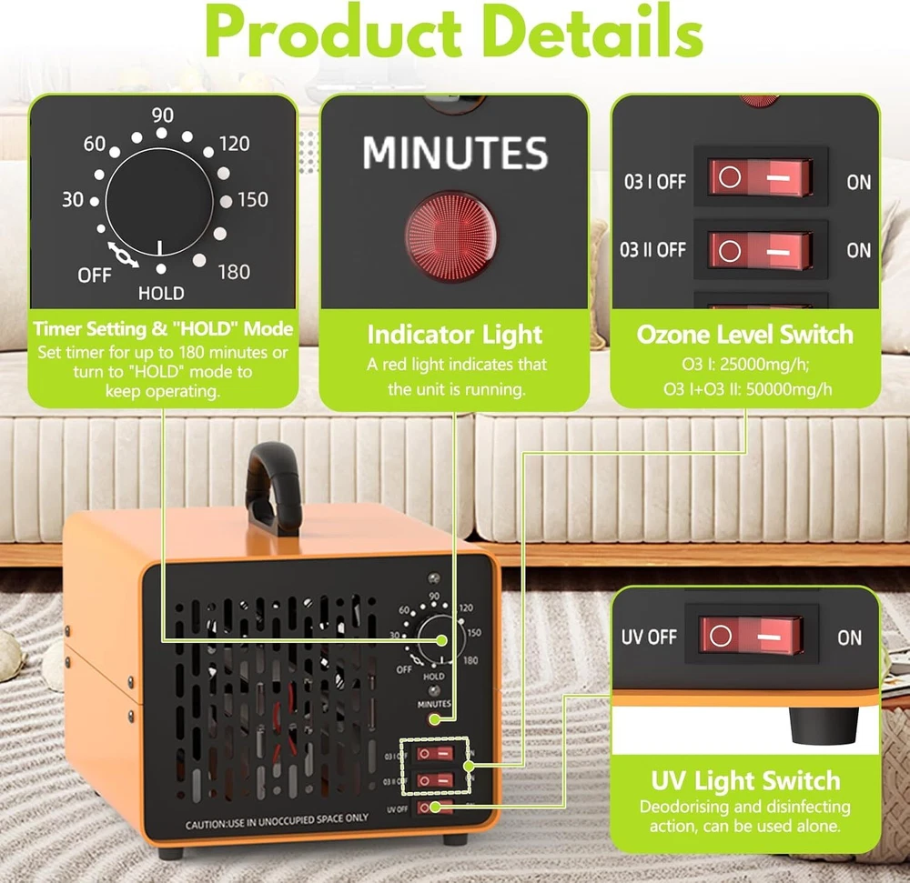 Product Description Colour Orange Brand RemixOri Product dimensions 29D x 22.5W x 18.5H centimetres Wattage 175 watts Power source Corded Electric Item weight 3.5 Kilograms Features: Powerful Odor Removal --- This ozone generator produces an impressive 50,000 mg/h of ozone, effectively eliminating unpleasant odors in homes, cars, and pet areas. Say goodbye to stale smells and enjoy fresh, clean air in your living spaces. Fresh your home in minute! Convenient Timer Function --- Equipped with a 180-minute timer and HOLD function, this air purifier allows you to customize operation based on your needs. Set it and forget it, ensuring that your environment remains odor-free without constant monitoring. Portable and Easy to Use --- Designed with portability in mind, this ozone machine is lightweight and easy to transport. Use it in any room or vehicle, making it an ideal solution for anyone looking to purify air quickly and efficiently wherever they are. Perfect for both home use and commercial use! Effective Against Bacteria and Mold --- Added UV Light function, beyond odor elimination, this ozone generator also targets bacteria and mold in the air, promoting a healthier living environment. Perfect for families who want to enhance indoor air quality and protect their loved ones from airborne contaminants. Safety Precautions --- After using the ozone generator, it’s crucial to ventilate the area for at least 30 minutes before re-entering. This step ensures that any residual ozone dissipates, creating a safe and comfortable environment for you and your family.