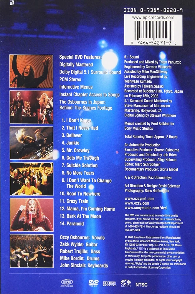 Actor: John Sinclair Language: English Director: Jeb Brien UPC: 0074645427195 Movie/TV Title: Ozzy Osbourne - Live at Budokan Rating: Unrated Run Time: 3 hours and 36 minutes Release Year: 2002 Title: Ozzy Osbourne - Live at Budokan Region Code: DVD: 1 (US, Canada...) No Of Discs: 1 gtin13: 0074645427195 Studio: Sony Legacy Release Date: 06/25/2002 EAN: 0074645427195 Format: DVD