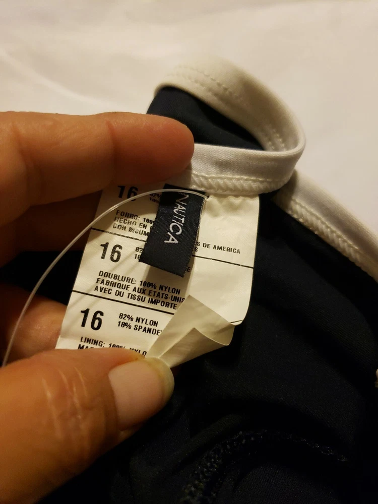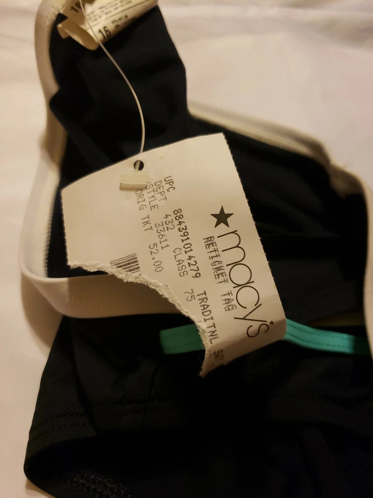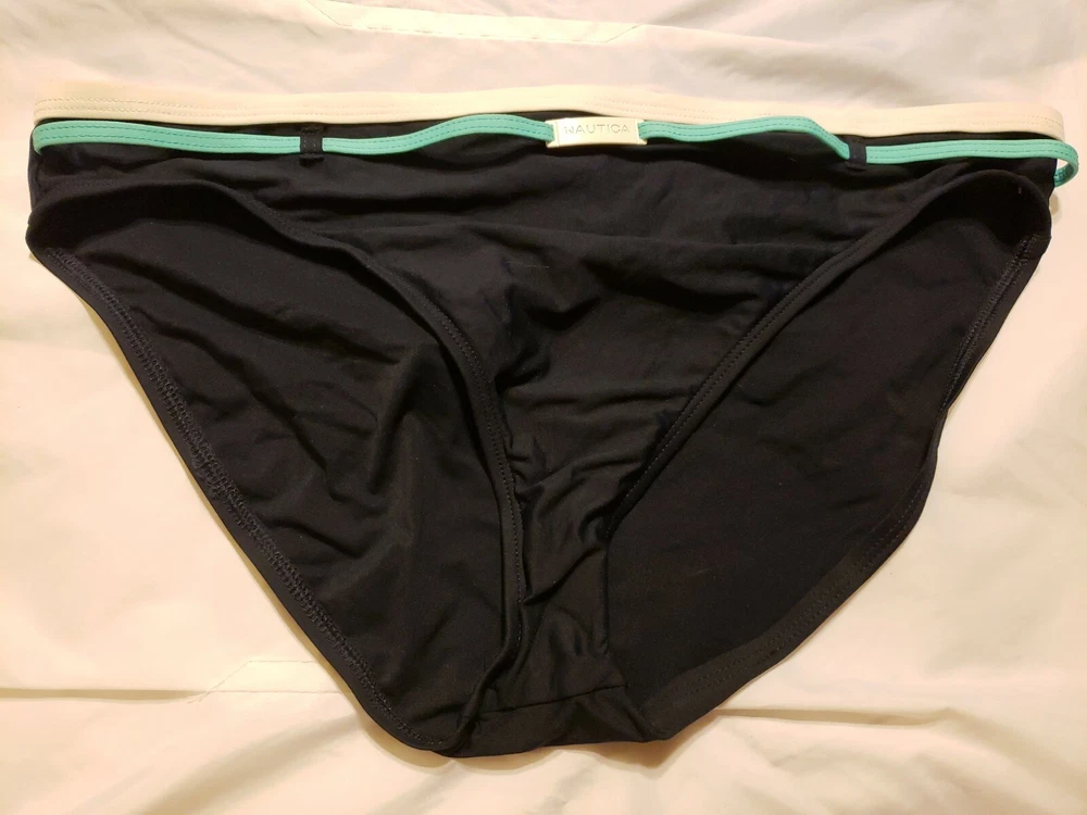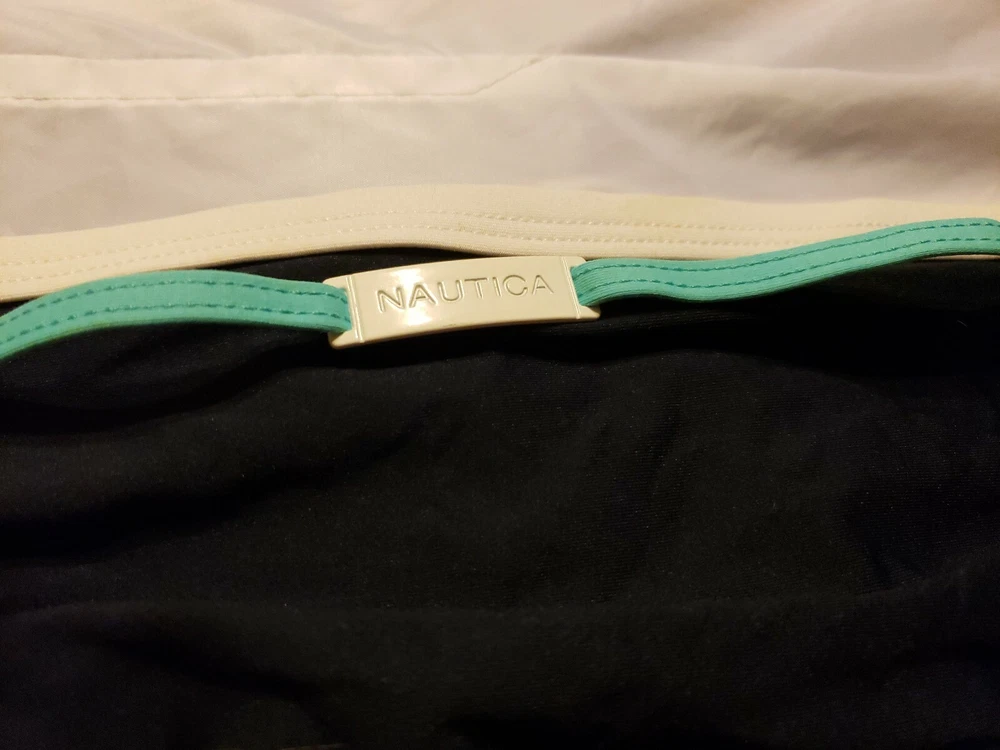 BRAND NEW with original store replacement tag attached. This item lost it's original tag while in store, so a "Macy's" store tag has been attached. Macy's Nautica Dark Blue with a white waistline and a baby / teal blue skinny belt. Original Price $52 CLEARANCE - ONLY $22.00 And I pay for the shipping! Less than half price.