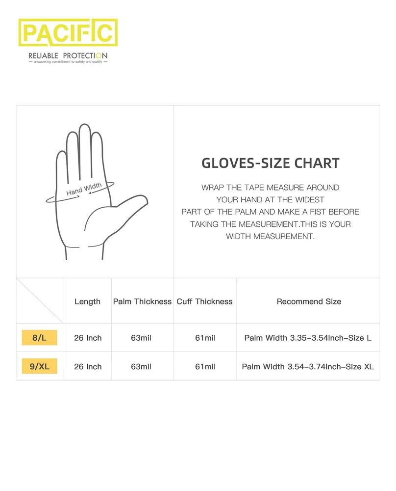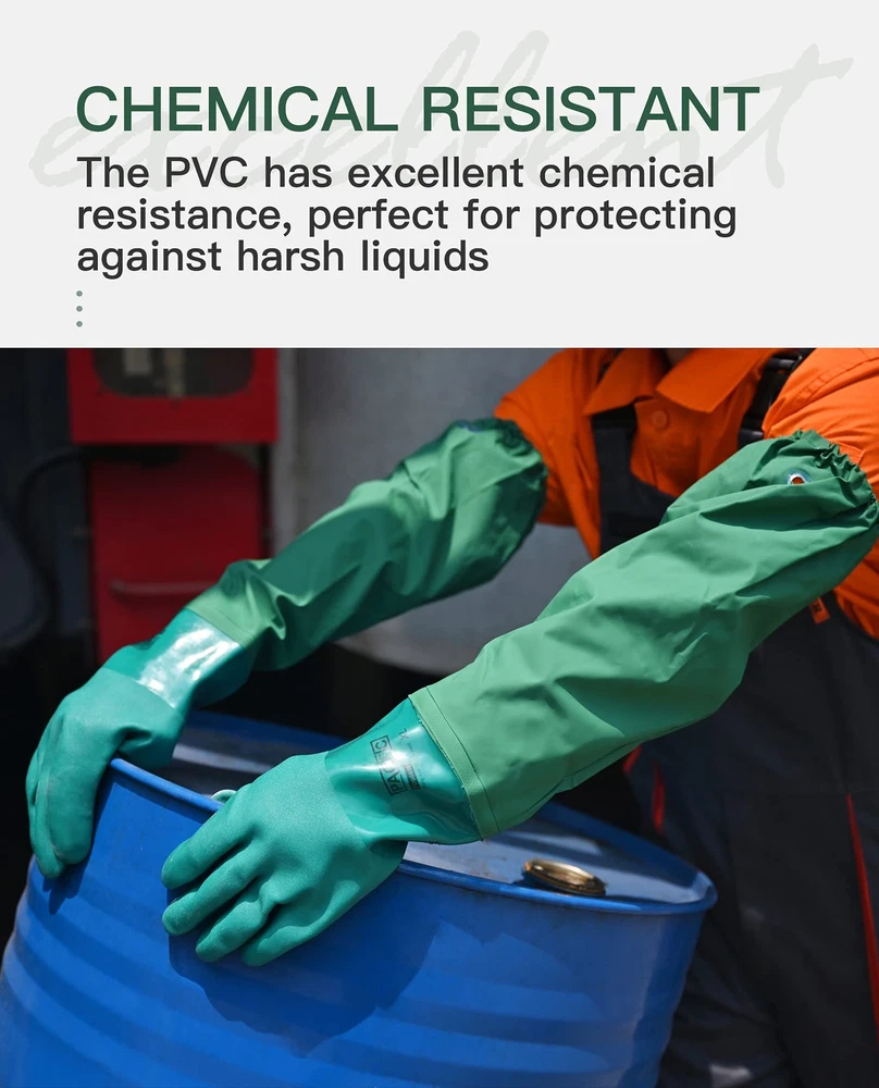COLOR: Green LENGTH: 26 INCH Attention: 1. Do not touch for high-concentration chemicals. 2. Do not use work gloves as heat resistance protection. 3. Do not wear sharp ornaments like the diamond ring and other jewelry in case of a scratch. 4. Keep away from sharp items like needles and toothpicks in case of a puncture. Maintenance & Cleanup 1. The gloves can be hand washed with neutral detergent and running water. If machine washed, please do not put them into the dryer, just air dried. 2. The PVC gloves should be stored in a dry and dark place to help extend its lifespan. Pacific PPE Oil Resistant Gloves Pacific PPE oil resistant glove,pure seamless cotton liner, close to human skin, is very soft and comfortable for use. Sandy-texture palm offers a strong grip and high resistance to abrasion, mechanical risks, gas & oil, and other chemical risks. ๐๐ฑ๐๐๐ฅ๐ฅ๐๐ง๐ญ ๐๐ก๐๐ฆ๐ข๐๐๐ฅ ๐๐๐ฌ๐ข๐ฌ๐ญ๐๐ง๐๐: The ergonomically shaped reusable work gloves are made of PVC, offer high resistance to chemicals, alkali, solvent, and mechanical risks, also can be used a long time at work no fracturing, become hard, oil impregnate and more. And our reusable long rubber gloves are anti-aging and the mechanical strength can be maintained above 90% under continuous operation for 96 hours at 158 degree Fahrenheit. ๐ ๐ฅ๐๐ฑ๐ข๐๐ข๐ฅ๐ข๐ญ๐ฒ & ๐๐จ๐ฆ๐๐จ๐ซ๐ญ๐๐๐ฅ๐: With 13 gauge seamless cotton liner, these heavy duty chemical resistant gloves are breathable, easy to pull on and off. You will be able to wear these chemical resistant gloves for long periods of time without discomfort. The amazing flexibility of these extra long sleeve 26 inches gloves are the most notable feature, provide effective barrier protection for wrist and arm from splashes, abrasives and dangerous chemicals. ๐๐ญ๐ซ๐จ๐ง๐ , ๐๐ฎ๐ฉ๐๐ซ๐ข๐จ๐ซ ๐๐ซ๐ข๐ฉ: The non-slip sandy textured palm chemical resistant gloves offer good grip to grab the wet and greasy parts. They meet the highest level 4 (at least 8000 cycles) of abrasion resistance, level 1 (1.2 index) of blade resistance, level 2 (25 newton) of tear resistance and level 1 (20 newton) of puncture resistance. ๐๐ฎ๐ฅ๐ญ๐ข๐ฉ๐ฎ๐ซ๐ฉ๐จ๐ฌ๐: The rubber work gloves are latex free, better solutions for people with sensitive skin. They are ideal for handling chemicals, petrochemical and oil refining, mechanical manufacturing, mining, agriculture, farm, gardening, construction, automotive industry, forestry and more. ๐๐๐ฅ๐ข๐๐๐ฅ๐ ๐๐ซ๐จ๐ญ๐๐๐ญ๐ข๐จ๐ง: This chemical gloves are compliant with Intertek and meet CA Prop.65 regulations for phthalates.