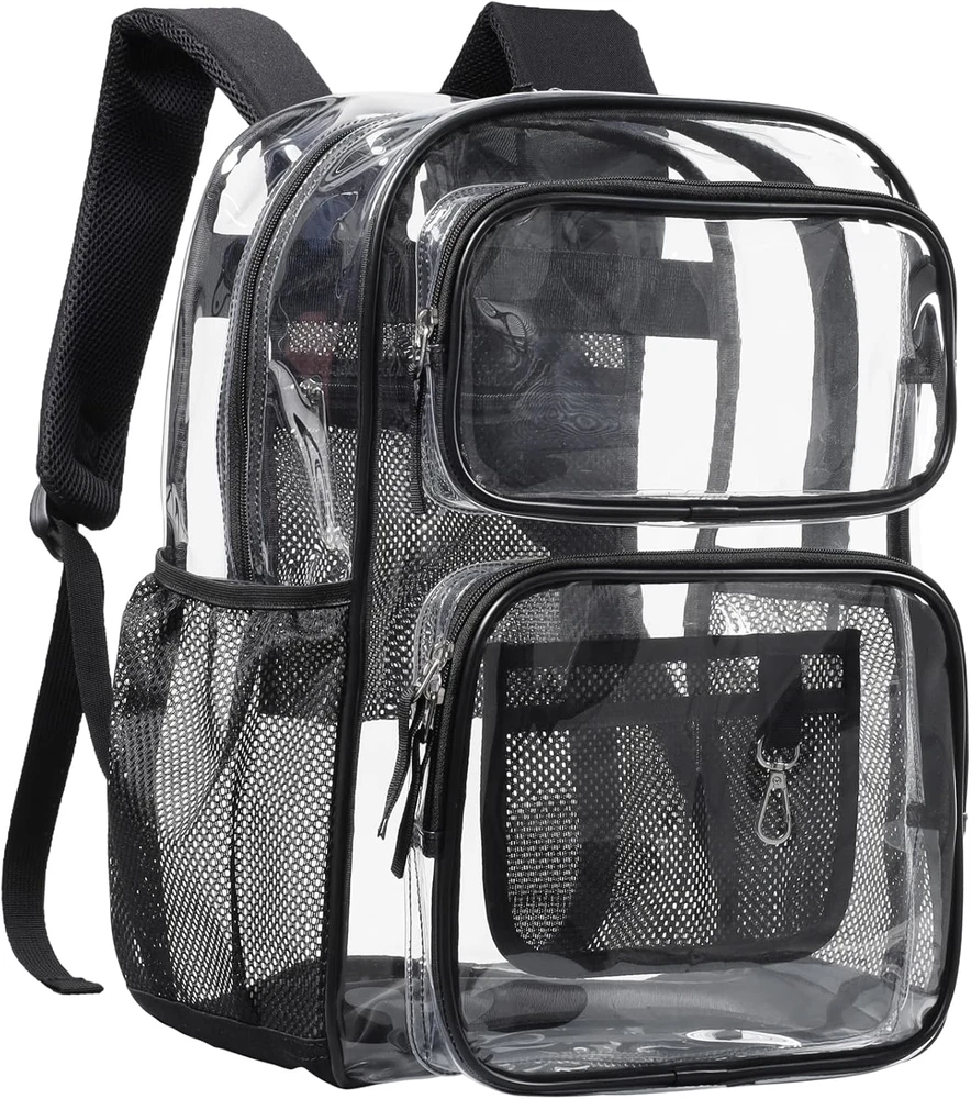 PACKISM Clear Backpack for School - 17 inch Large Heavy Duty Clear Bookbag for 2 Compliant with Back to School Clear Bag Policy: The clear design of this clear backpacks for school allows for easy inspection of contents, making it perfect for school security checks. Breeze through checkpoints and quickly locate your items without rummaging through the bag, saving you time and hassle. Built to Last: This heavy duty clear backpack is crafted from thick, high-quality PVC material with reinforced stitching, sturdy zippers, and a reinforced fabric bottom. Its durable construction withstands daily wear and tear, saving you from frequent replacements and providing long-lasting use. Spacious and Organized: With a large main compartment, 2 front pockets, and 2 side mesh pouches, this large clear backpack offers ample space to hold binders, laptops, books, notepads, pens, and water bottles. It keeps all your school essentials neatly organized and easily accessible. Comfortable All-Day Wear: Designed with thick, padded shoulder straps that are ergonomically shaped, this clear book bag is perfect for students aged 12 and above. The comfortable straps reduce shoulder strain, allowing you to carry your belongings all day without discomfort, even when fully loaded. Versatile for Multiple Uses: This stylish and functional clear plastic backpack is suitable for men, women, and students in various settings, including school, work, and travel. It provides ample space for all your essentials, eliminating the need for multiple bags and offering great convenience.