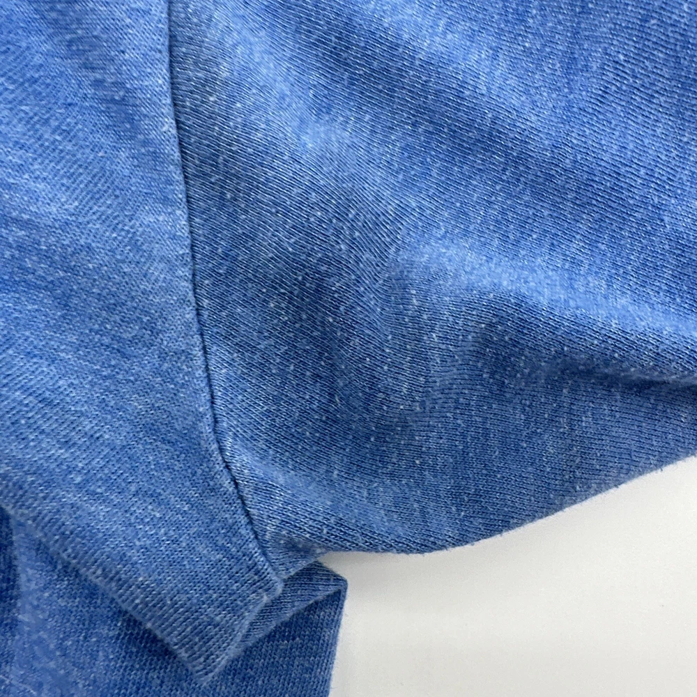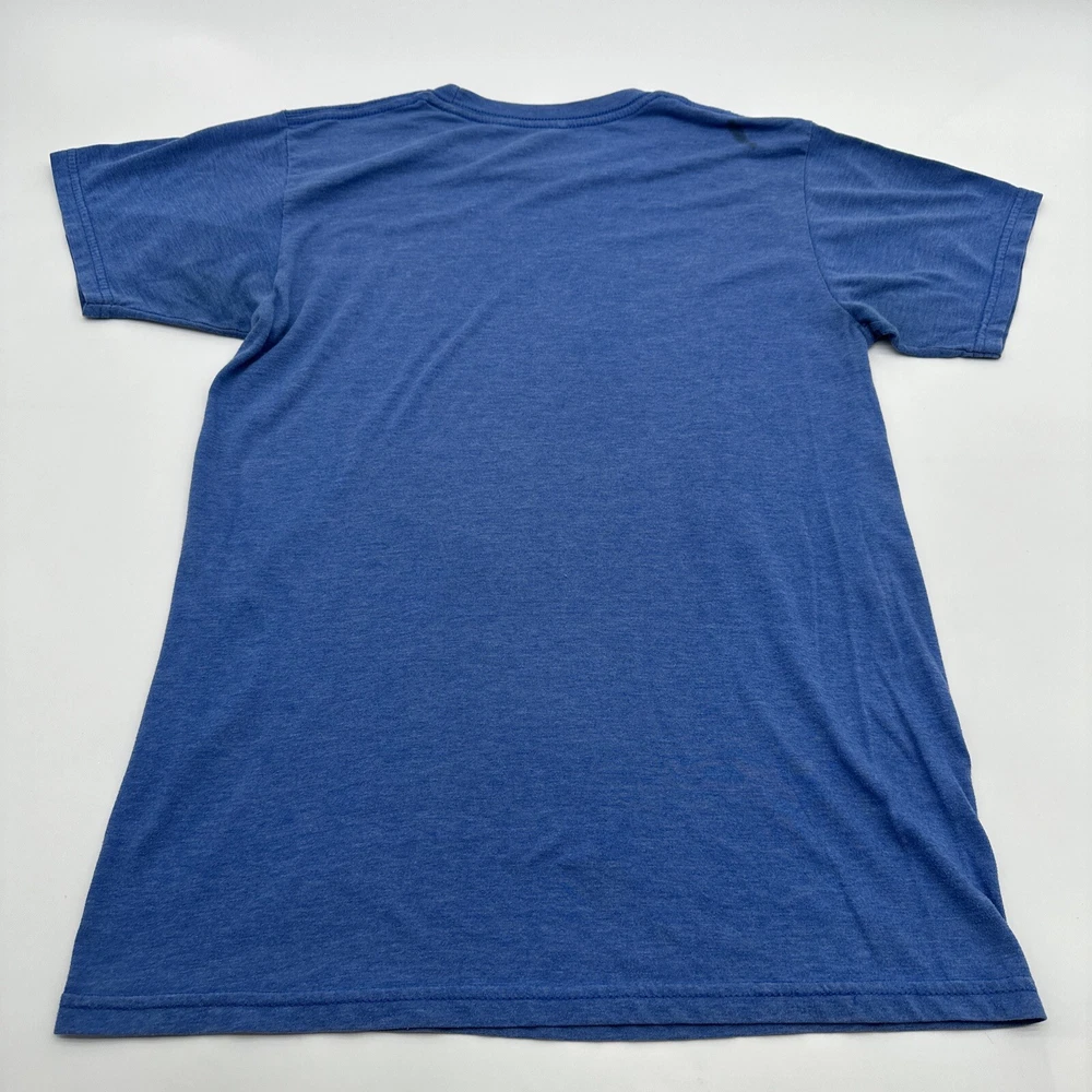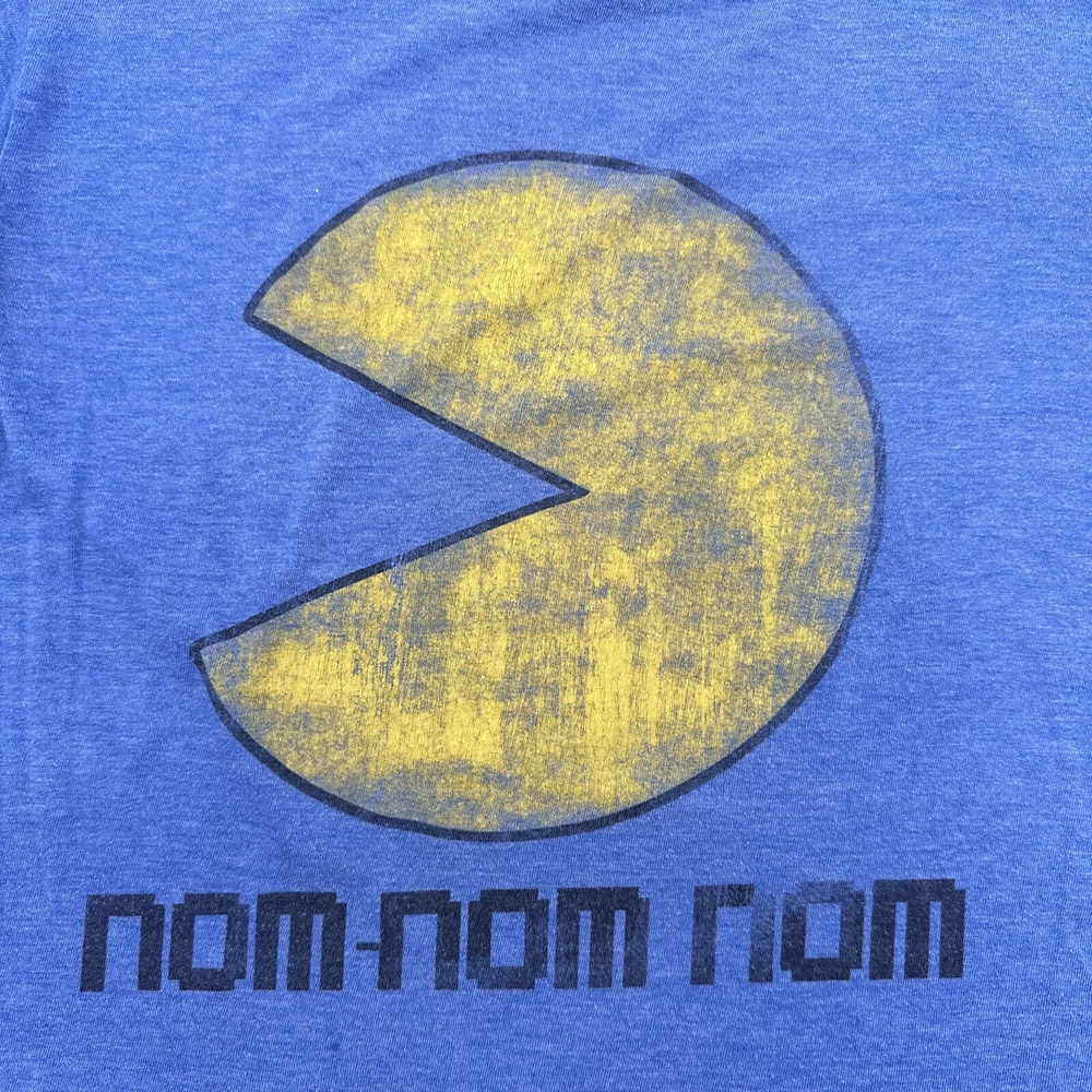Show off your love for the classic video game character with this blue graphic print PAC-Man T-shirt. Featuring a crew neck and short sleeves, this regular fit tee is made from a comfortable blend of polyester and cotton. The shirt is accented with the iconic PAC-Man logo and is perfect for all seasons. This men's T-shirt is available in size small and is made in Mexico. Whether you're a fan of the game or just love the retro style, this shirt is a must-have for any Pac-Man enthusiast. Add it to your collection today! Check pictures for flaws and measurements