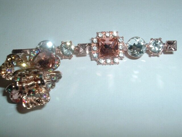 From the closing of a downtown Chicago boutique, a copper bobby pin with citrine and white rhinestones and matching hair claw clip with repeat stones. Both are new and in excellent condition. We combine ship.
