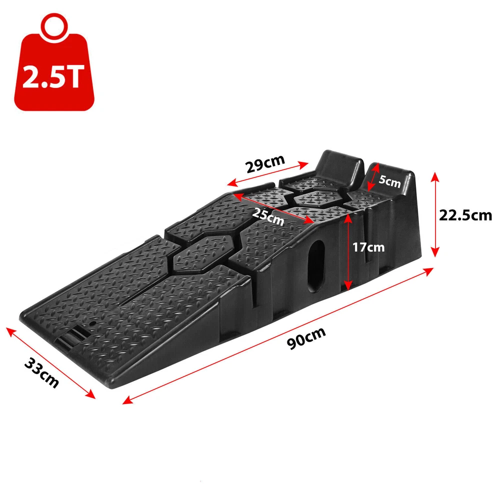 Descriptions -Make small servicing tasks on your vehicle extremely easy with this pair of heavy duty car ramps . Made from high grade and impact resistant plastic for reliable and long-lasting performance, this pair ensures you’ll have enough room to lie underneath your car comfortably. -An interlocking design ensures safe use and easy storage, meaning they can be kept in your car, garage and house when not needed. -The surface of both plastic ramps features a non-slip texture that increases friction between tires and ramps for added safety. -With a set of plastic ramps, the daily maintenance of the car can be easier, no need to go to the 4S workshop or garage to change the oil. -They carry up to 2500 kg of weight so that large vehicles can be driven safely It is perfect for multiple scenes and environments, no need to worry about the weather -Regardless of whether it is a car, caravan or camper, the resilient ramps are suitable for various vehicle models and even lowered vehicles are no problem for these ramps. -A wide range of uses: suitable for curbs, square steps, driveways, garage steps, loading docks, parking lots and so on. Specifications: Color: Black Material: PP Load capacity: 2500 kg per pair Total dimensions: 90*33*22cm Package included 1Pair x Car Lifting Ramp