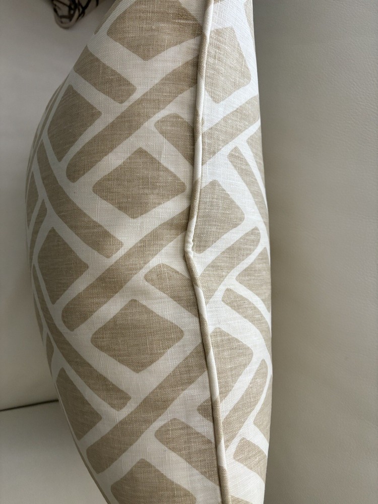 Exclusively custom made by me ( designer). This designer custom pillow cover by Thibault linen Geometric pattern in a square shape with a contemporary style. The cover is made 100% Linen material in beige and white colors, measuring 21x21 inches. It is double-sided and includes a zip closure for easy removal. This stylish pillow cover is suitable for various rooms in the home, such as the bedroom, living room, or dining room, adding a touch of abstract art to your decor. Made by me in my workroom- self welting, invisible zippers, serged to stop fraying Double sided- just beautiful Available: 3 PAIRS available- SIZE - 21x21 Had wash or machine Inserts not included Price is for one (1) PAIR ( maybe sold individually if you contact me)