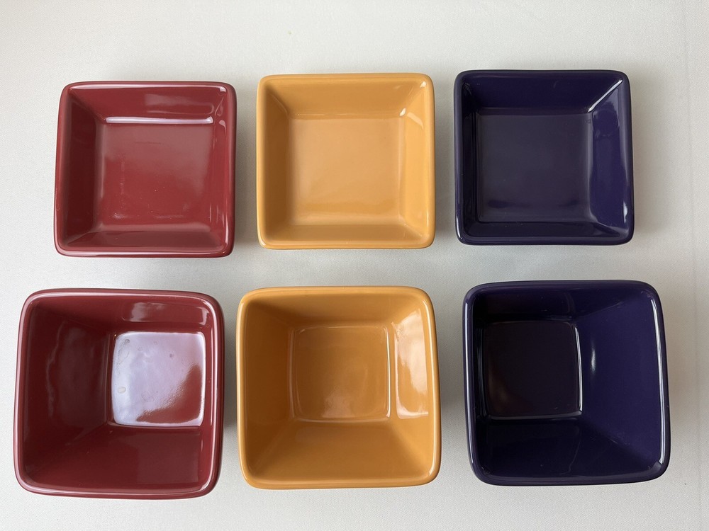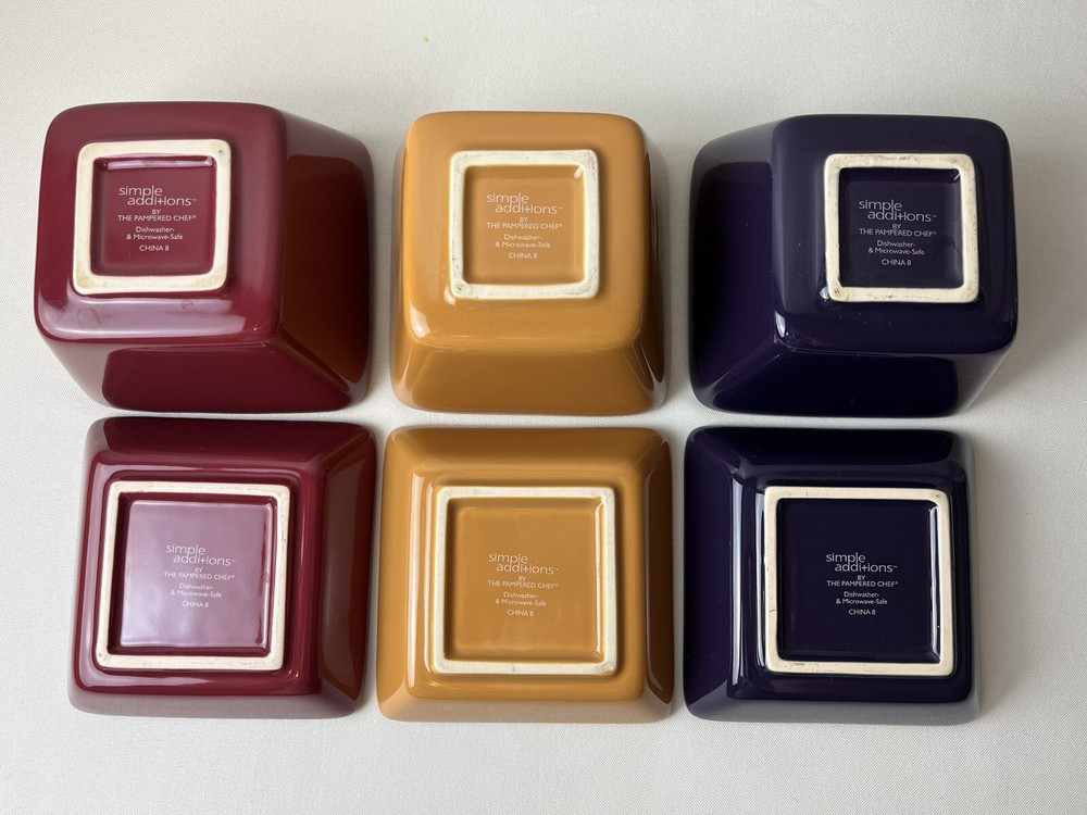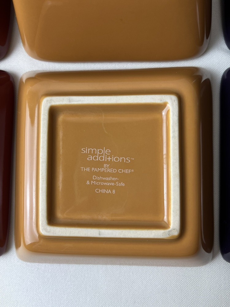PAMPERED CHEF Simple Additions Condiment Dip Bowl & Under Plates Grape, Gold, Cranberry. Bowl 4.5" square x 3" deep. Under plate 1.75" deep