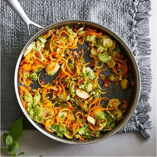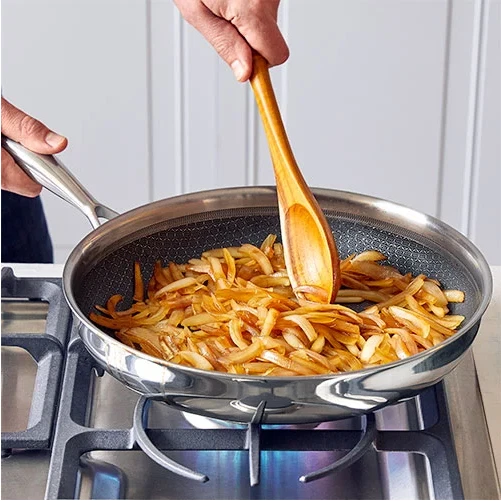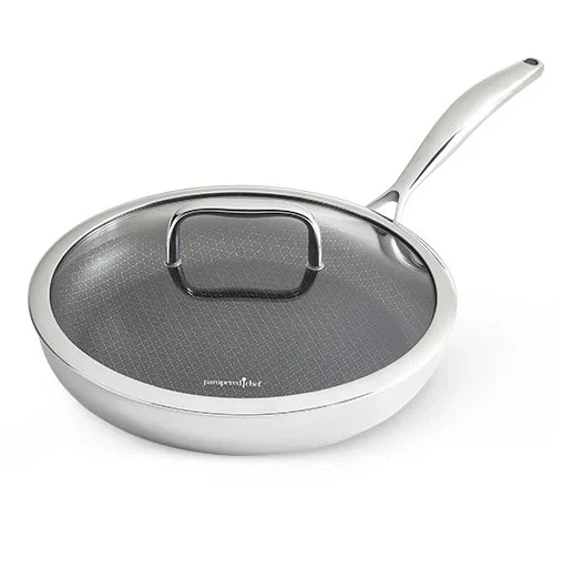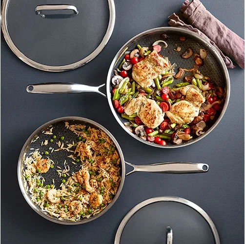 GO-TO SKILLET FOR ONE-POT MEALS This innovative pan combines the best features of stainless steel and nonstick cookware. The nonstick mesh coating provides the perfect sear (without the mess) and leaves fond for pan sauces and gravy. The size is perfect for one-pot meals. PRODUCT DETAILS 4¼-qt. capacity. Includes lid. The nonstick mesh grid lets you sear food and use fond to make pan sauces and gravy-and it's as easy to clean as nonstick cookware. Cleanup is easy because it's dishwasher-safe. Use your favorite utensils-even metal! Heat-safe to 450°F (230°C). Tempered-glass lid with stainless-steel rim is heat-safe to 400°F (200°C). Designed without rivets, so there's no food buildup or rusting. Tri-ply clad-a heat-conducting aluminum core between an 18/10 stainless steel satin interior layer and a polished stainless 18/0 exterior layer for durability and faster, more even heating. Flared rims make pouring easy and keep stovetops and counters free of drips. Guaranteed for life.