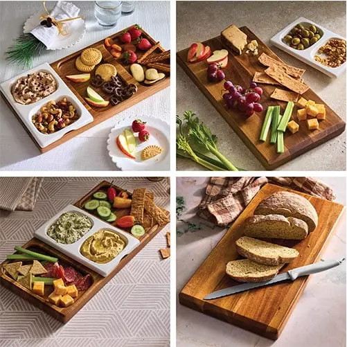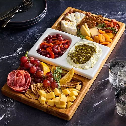VERSATILE CHARCUTERIE SET With this durable acacia wood board and ceramic dish, you can create gorgeous spreads for every occasion. The board has a flat side that's perfect for meat and cheese, butter boards, and dessert boards, and a welled side for vegetables and fruit. Use the ceramic dish to serve dips-it fits in the wells of the board, or you can use it separately! KEY FEATURES Use the dual-sided board and dish separately or together for unique combinations. The acacia wood board is durable enough to cut on. PRODUCT DETAILS Includes a wood serving board and ceramic dish Ceramic dish is microwave- and oven-safe to 400°F (200°C) Made with acacia wood, so it has rich color and distinctive woodgrain The ceramic dish is dishwasher-safe and the wood board is hand wash only SPECS 19" x 9½" x 2¼" (48-cm x 24-cm x 5.5-cm) board 1¾ cup (425 mL) board well capacity Ceramic dish has two ¾ cup (175 mL) wells Acacia wood and coated ceramic 4½ lbs. (2 kg) total GUARANTEE Wood Board: 1-year guarantee Ceramic Dish: 3-year guarantee