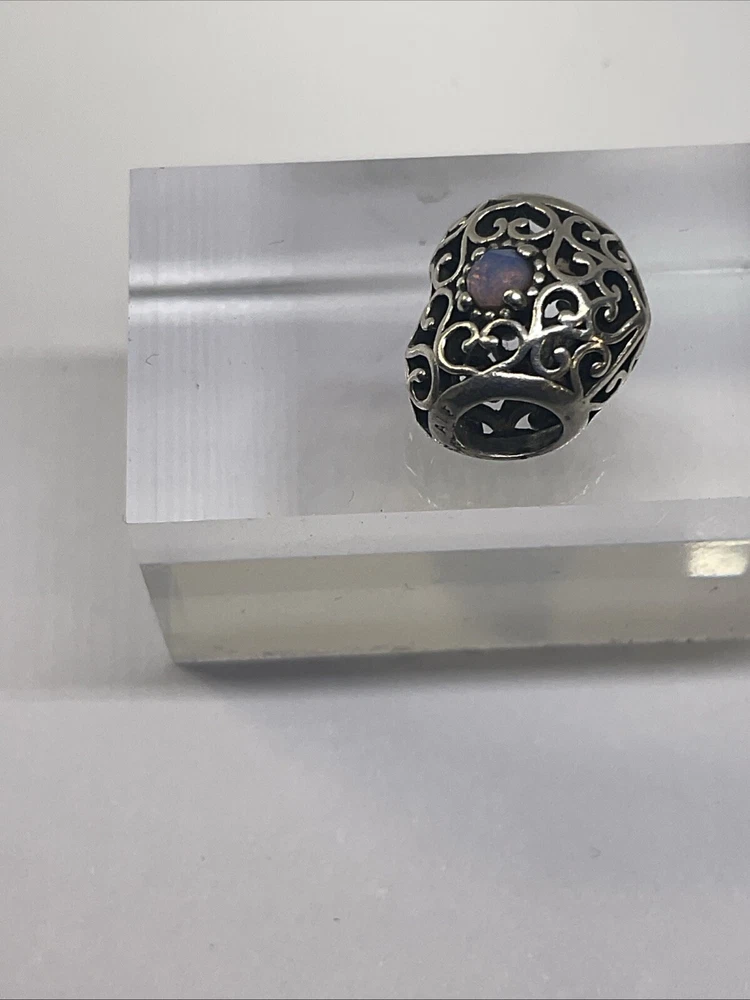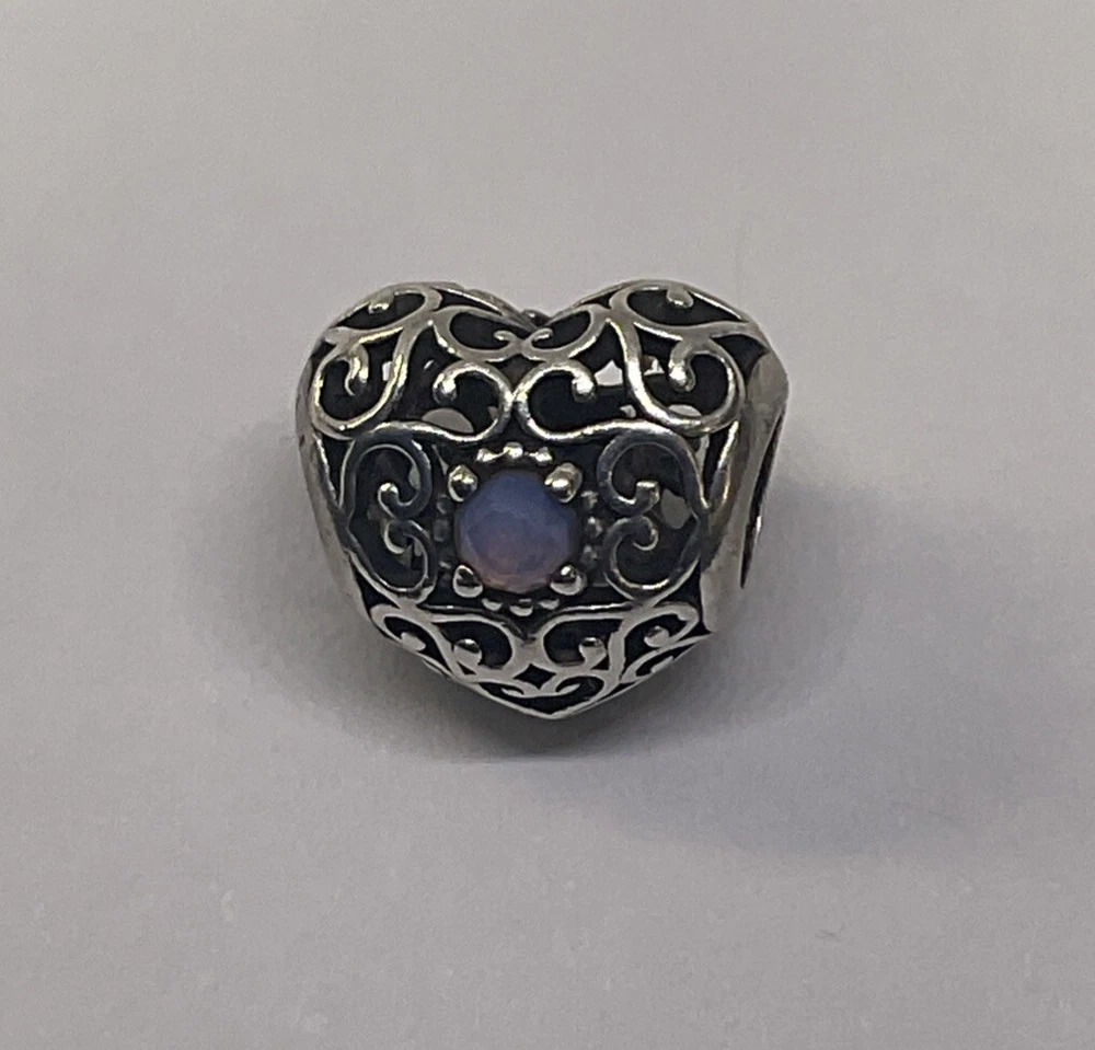 The PANDORA 925 Silver October Birthstone Heart Charm features a beautiful opalescent main stone in a heart-shaped design. The charm is hallmarked and made of sterling silver with a metal purity of 925. The charm is part of the PANDORA brand and is designed in a charm style to be added to a bracelet with a ball/bead chain. Perfect for those born in October or anyone who loves opalescent jewelry, this charming piece adds a touch of elegance to any bracelet.