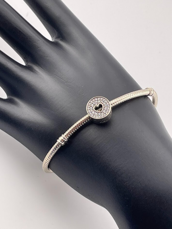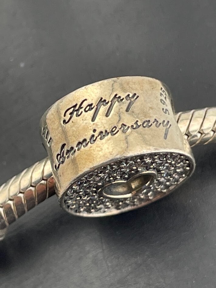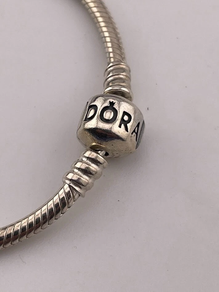 PANDORA 925 STERLING SILVER SNAKE CHAIN BRACELET W/ANNIVERSARY CHARM 7.5" 4085 LOVE ****************************** Thank you for your interest in our jewelry. We?d like to introduce ourselves. We are just a retired couple who love matching our customers with great jewelry. We?re not professional jewelers. To have the best shopping experience we like to recommend the following: Please measure your hand, wrist, finger or neck to ensure the best fit. We can use your measurements to help with sizing. Please ask all the questions you want. We know some stuff and, if we don?t, we?ll do the research. We like to learn too. More Stuff: If an item is described as ?gold over 925 sterling silver? this means it is gold vermeil. Vermeil is the process by which a layer of gold (usually 14k or 18k) is bonded to sterling silver. We only clean with gentle soap and warm water to avoid damage. The items we sell may be new or pre-owned and may have normal wear, slight damage, and/or tarnish. We make every effort to ensure the items we sell are as described. This includes testing to confirm metal purity if the item isn?t marked, and testing for gemstone identity. We try to put measurements in the jewelry description and include a photo of each piece with a U.S. quarter (25mm).