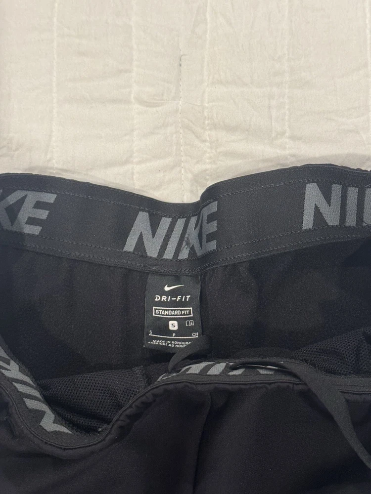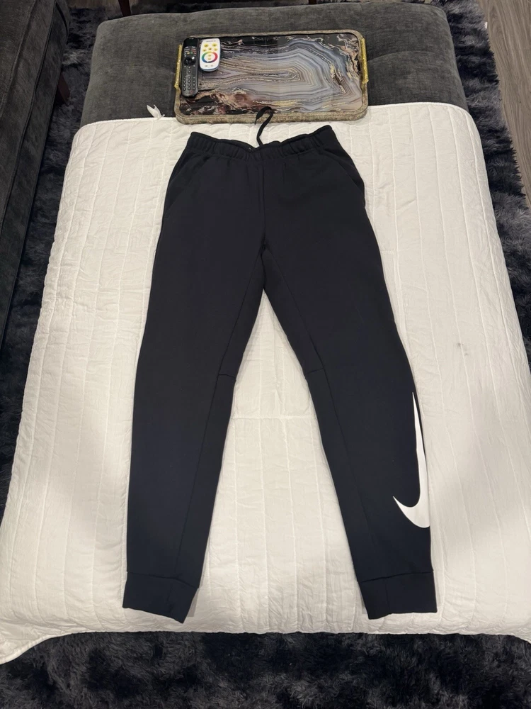 These Nike Dri-FIT jogging pants are perfect for any active occasion, whether you're hitting the gym or going for a run. They are made with 100% polyester and feature a relaxed fit, adjustable waist, and elastic waistband with a 30-inch circumference. The pants also have pockets for convenience and are water-resistant, making them ideal for winter, fall, and spring activities such as cycling, hiking, and running. The pants are easy to care for and can be machine washed. They come in a solid black color with a stripe pattern and feature the Nike logo. These pants are a great addition to any activewear collection and are perfect for anyone who values comfort and functionality.