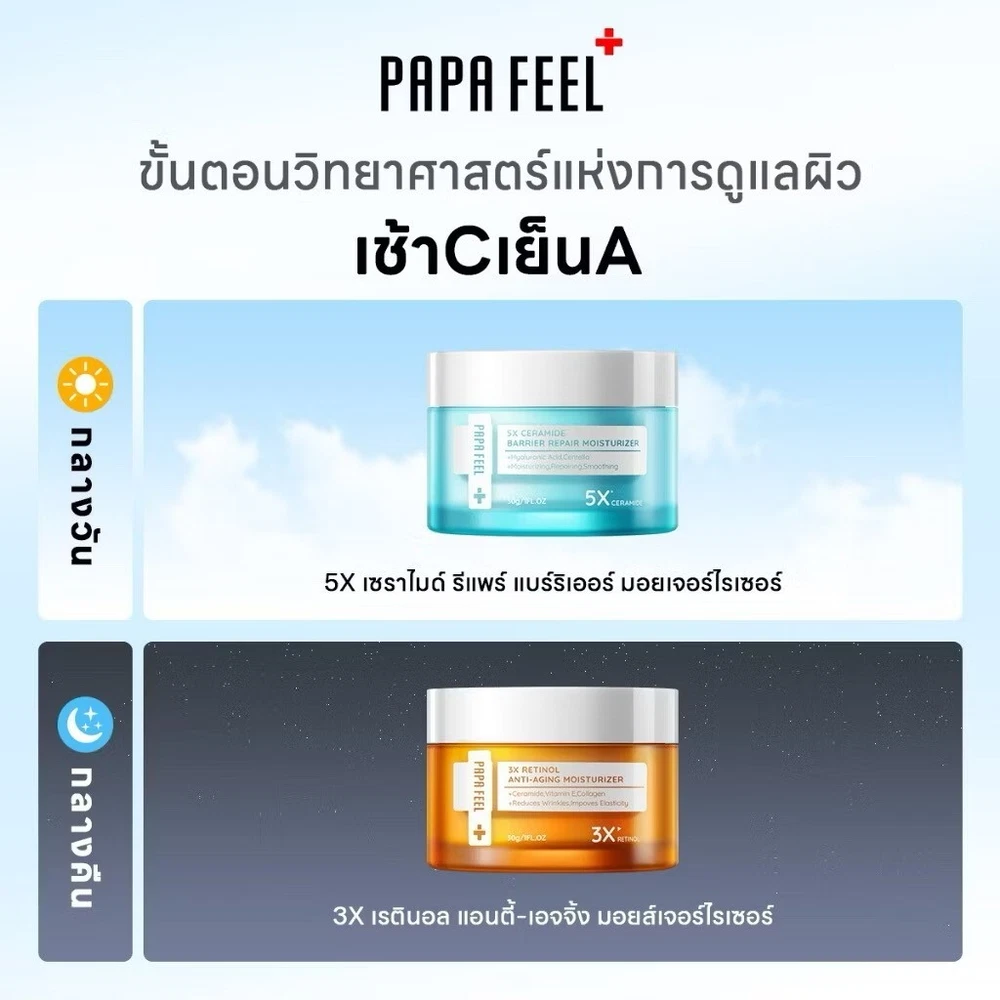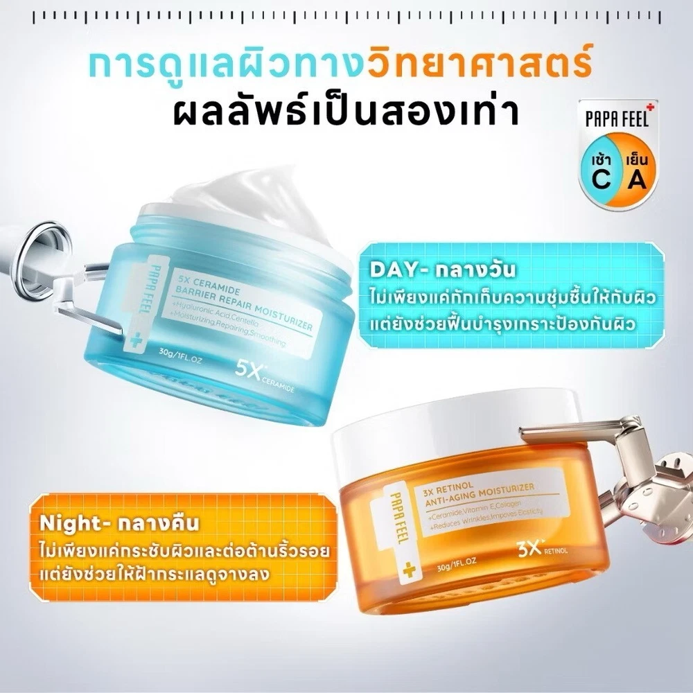 PAPA FEEL Retinol Anti-Aging Cream 30 g +Ceramide Moisturizer 30 g Day Night SET Free shipping & Tracking number **** Excluding Remote Area Surcharge **** Description Brand: PAPA FEEL Condition: New with box Type/Size: Facial cream 1fl.oz (30 g) /pc Quantity: 1 set contains 2 items as below. 1. PAPA FEEL 5X CERAMIDE BARRIER MOISTURIZER 30 g 1 pc 2. PAPA FEEL 3X RETINOL Ceramide Soluble Collagen Face Cream 30g 1 pc Product detail PAPA FEEL 5X CERAMIDE BARRIER MOISTURIZER Face Cream 30g Main ingredients: Ceramide NP, Ceramide AS, Ceramide NS, Ceramide AP, Ceramide EOP Soluble Collagen Centella Asiatica Hyaluronic Acid PAPA FEEL 3X RETINOL Ceramide Soluble Collagen Face Cream 30g Main ingredients: 3 kinds of Retinol Soluble Collagen Vitamin E Ceramide NP How to use: 1. Cleanse your face 2. Use toner and essence 3. Apply moisturizing cream all over your face. 4. Massage gently. Our Policy Customs Duty fees & Import Taxes: (IMPORTANT, Must Read Before Ordering) # Buyers may need to pay the customs fees & import taxes when your order value is higher than the threshold value of your country. Please check with your country's customs to understand the fee rate before ordering so you can estimate how much you need to pay. # Customs duty fees / import taxes and charges are not included in the product price or shipping cost. These fees are the buyer's responsibility. # The customs fees / taxes are normally collected by the shipping carrier company to pay for your country's customs. It is not the additional shipping charge from us so please don't confuse. # I cannot accept the return shipment because buyers don't want to pay the customs fees / taxes in any case. # Customs duty fees / taxes are the law of your country. No one can have the privilege to avoid these fees. If you don't want to pay these fees / taxes, please don't buy Shipping: # Shipping worldwide from Thailand via Thailand via Economy shipping Airmail and including provide Tracking number. & take 14-23 business days. (The shipping time may be longer than normal depending on the location of your area, the uncontrollable customs clearance delay, or other uncontrollable events). # We will normally ship the item within 3 business days. # For multiple orders, if no other instruction from the buyer, the orders will be combined to ship together in 1 shipment. # The price does not include REMOTE AREA CHARGE FROM DHL EXPRESS. Return & Refund: # 100% Guarantee. Any issue, please let us know & get full refund in 30 days. # Postage cost is non-refundable. Return postage cost is the buyer's responsibility. Thank you very much. Have a good day.